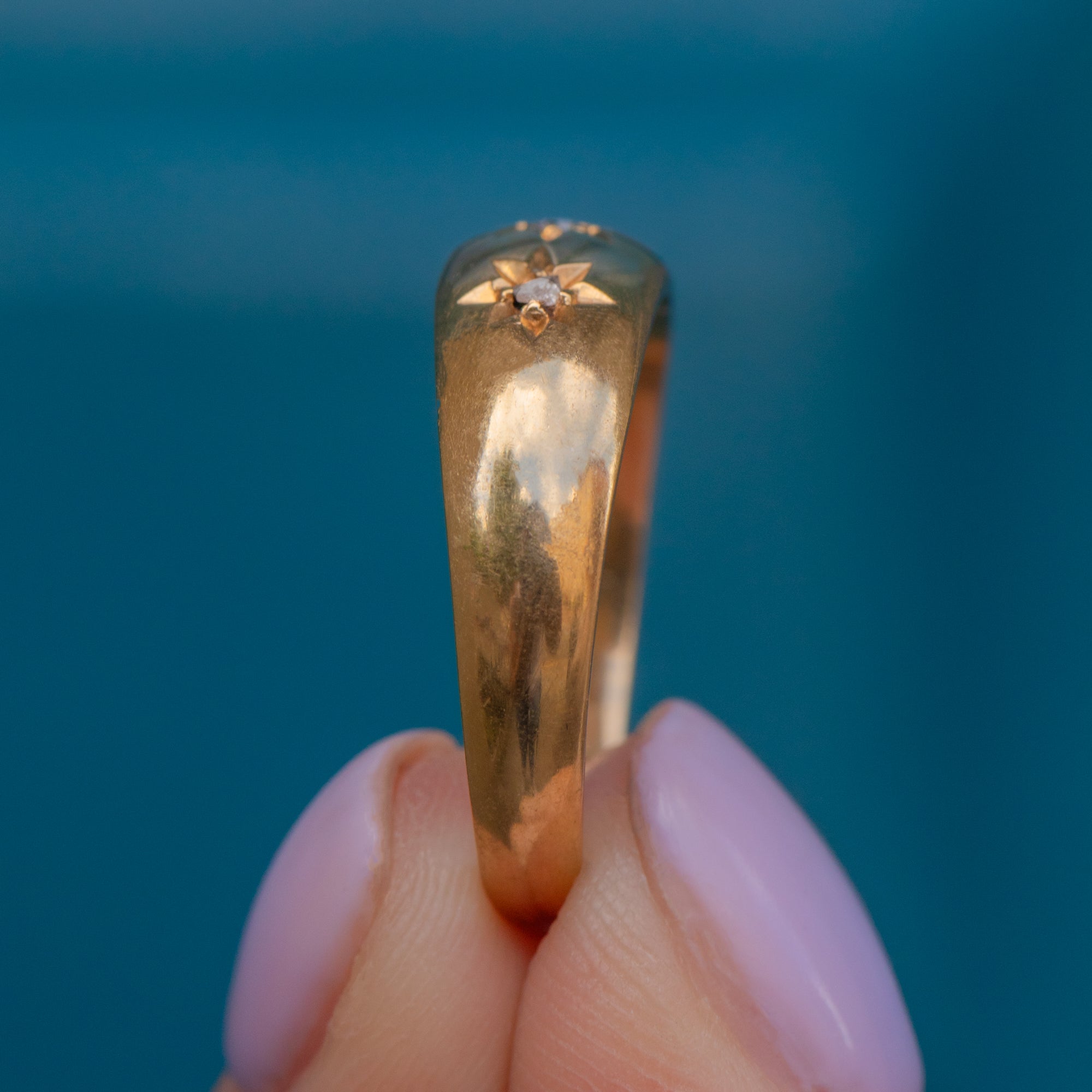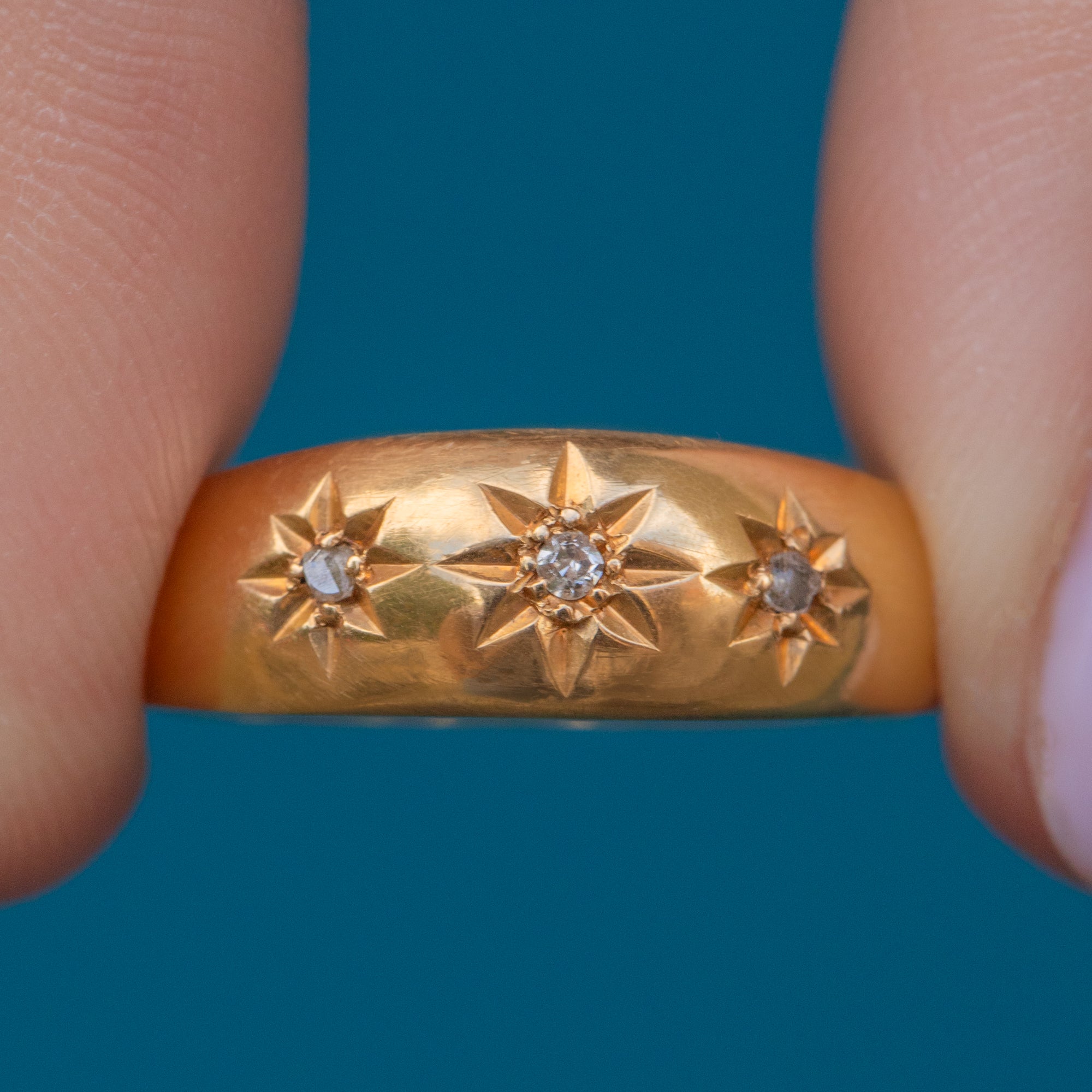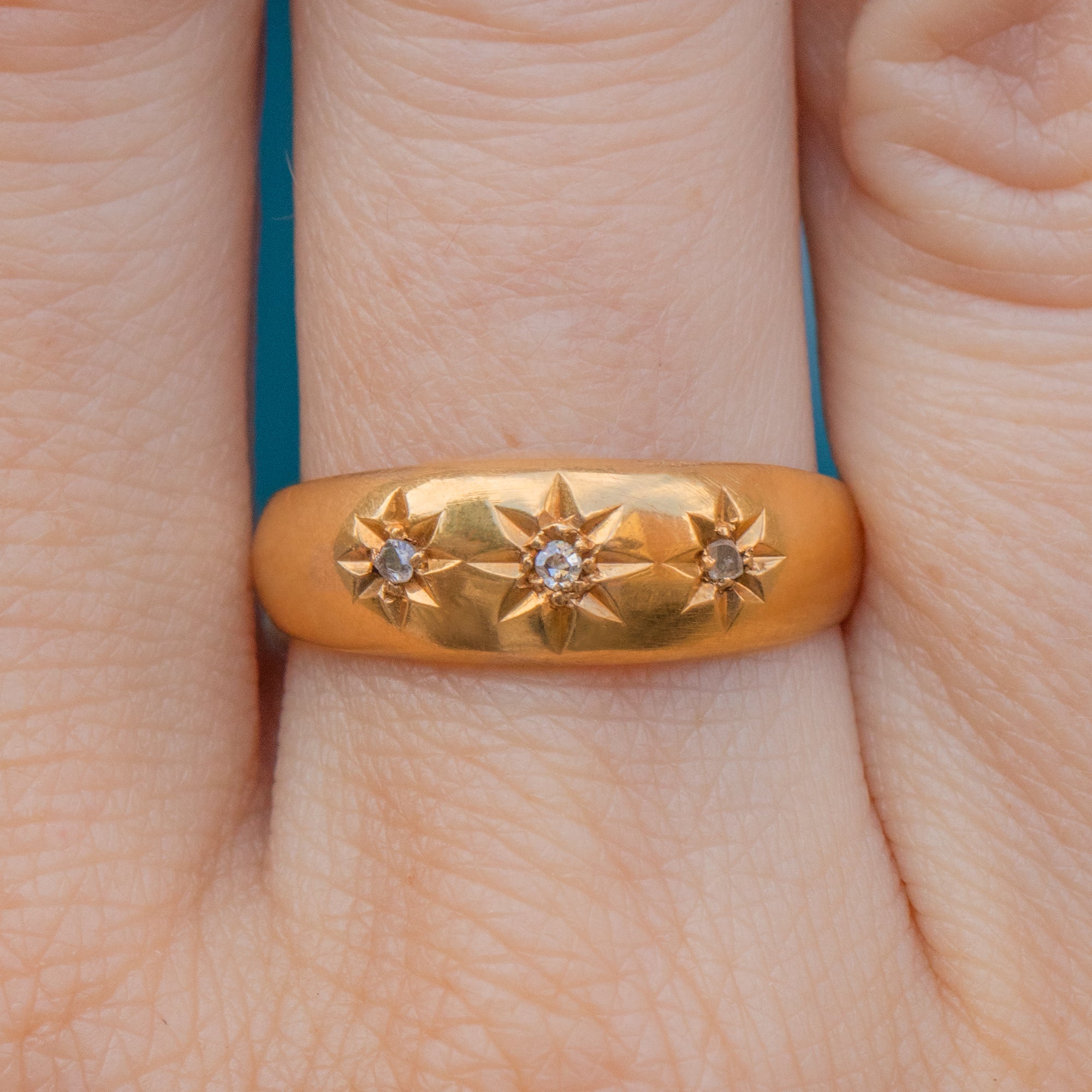 Add a touch of celestial charm to your repertoire with this delightful Victorian 18ct Gold Diamond three stone gypsy ring! The three rose-cut Diamonds offer a subtle sparkle from their bold star settings, displayed centrally across the chunky 18ct Gold band, with the low profile making this Victorian gypsy ring perfect for stacking amongst your other favourite jewels.