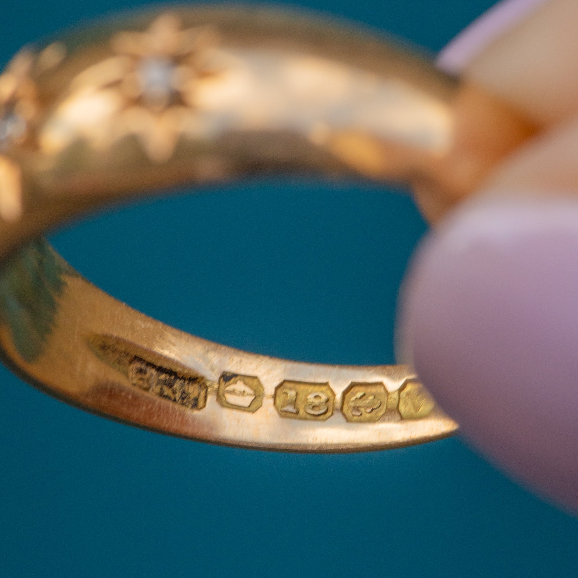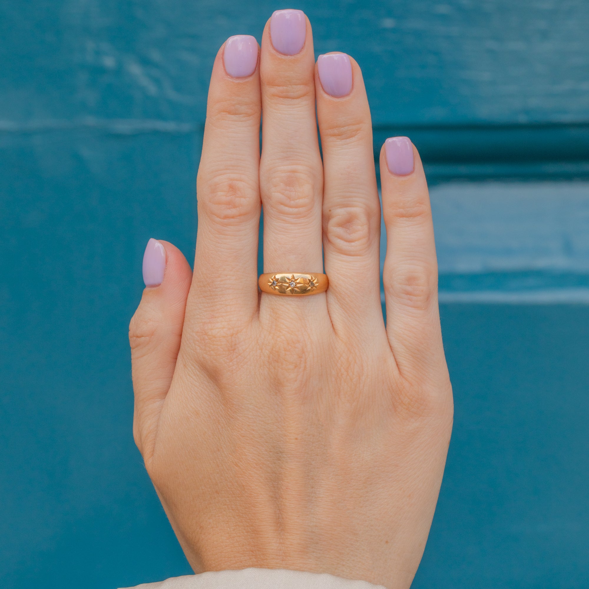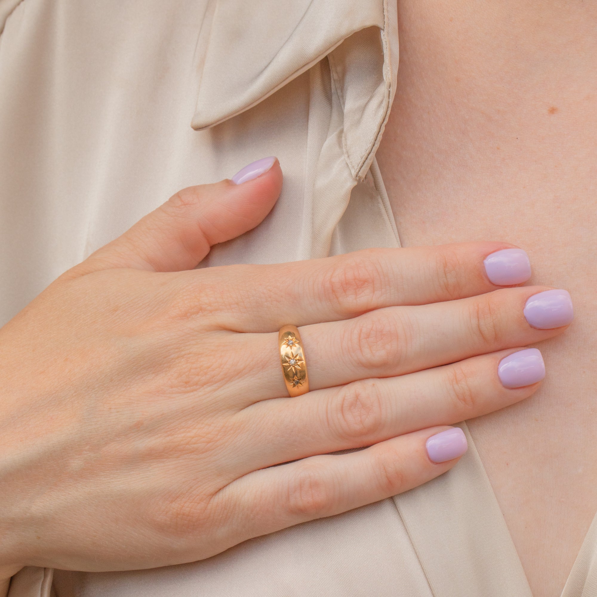 Add a touch of celestial charm to your repertoire with this delightful Victorian 18ct Gold Diamond three stone gypsy ring! The three rose-cut Diamonds offer a subtle sparkle from their bold star settings, displayed centrally across the chunky 18ct Gold band, with the low profile making this Victorian gypsy ring perfect for stacking amongst your other favourite jewels.
