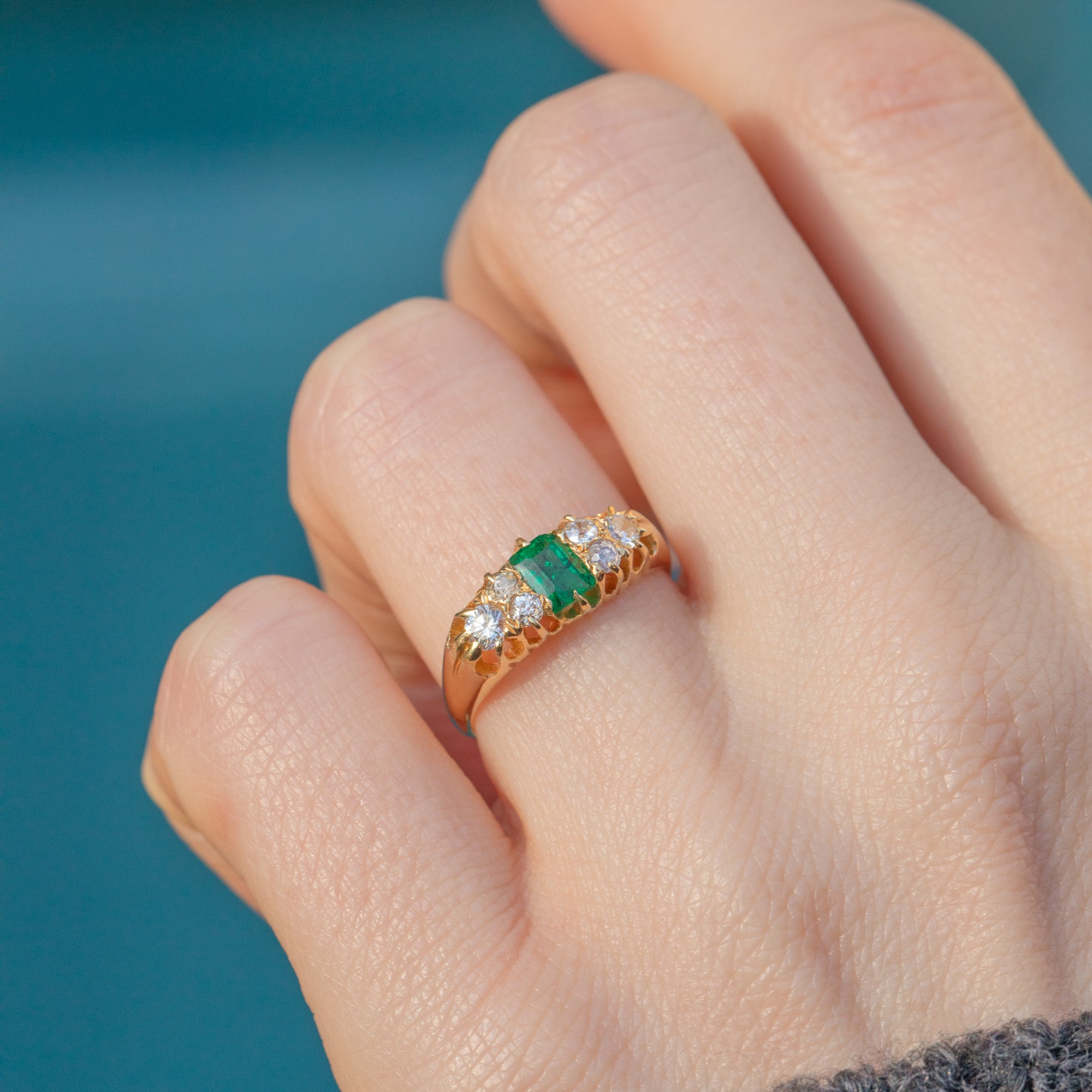Comprised of seven gorgeous gemstones, this antique 18ct Gold ring boasts a vivid green Emerald in her centre adorned by six twinkling Diamonds, each scintillating brightly.