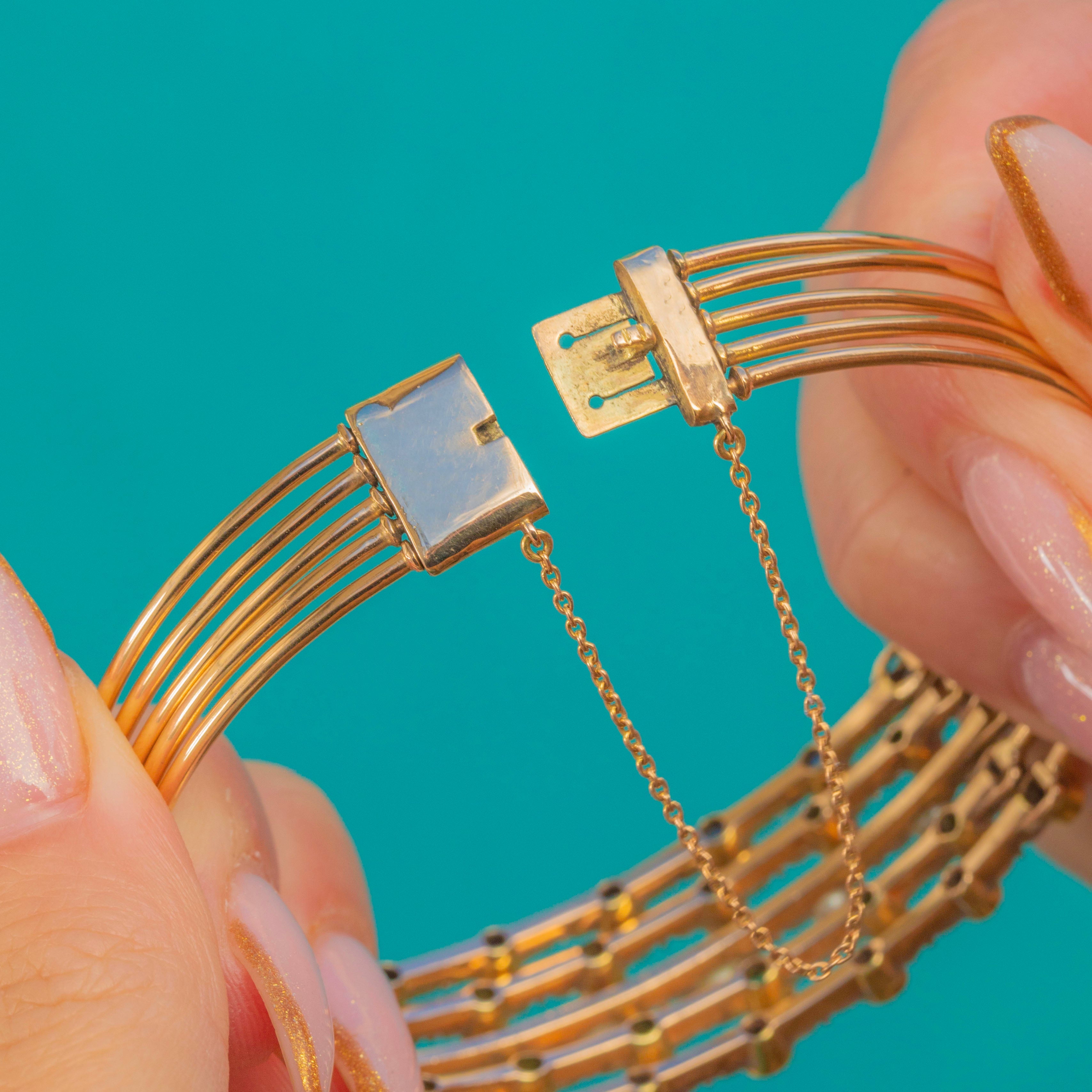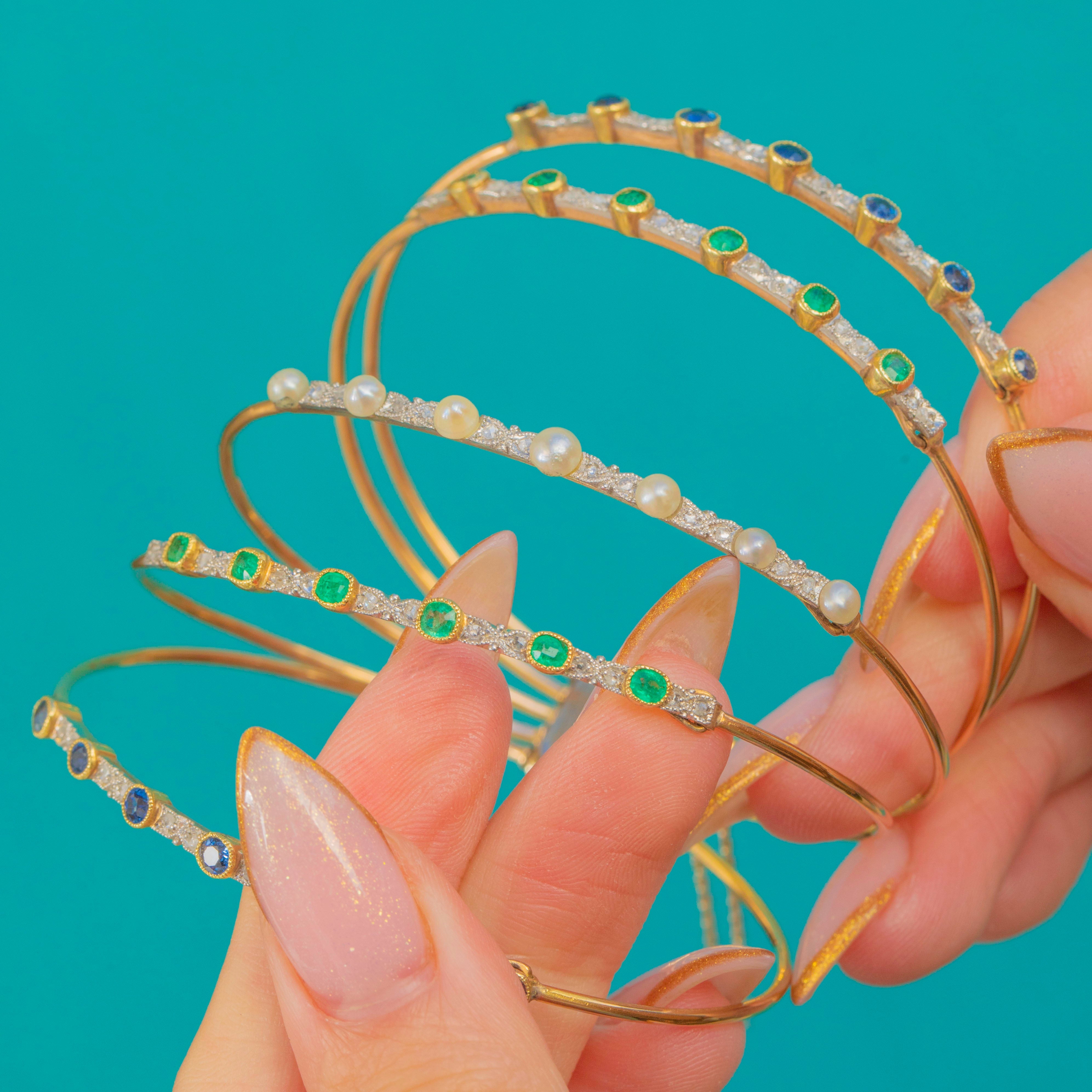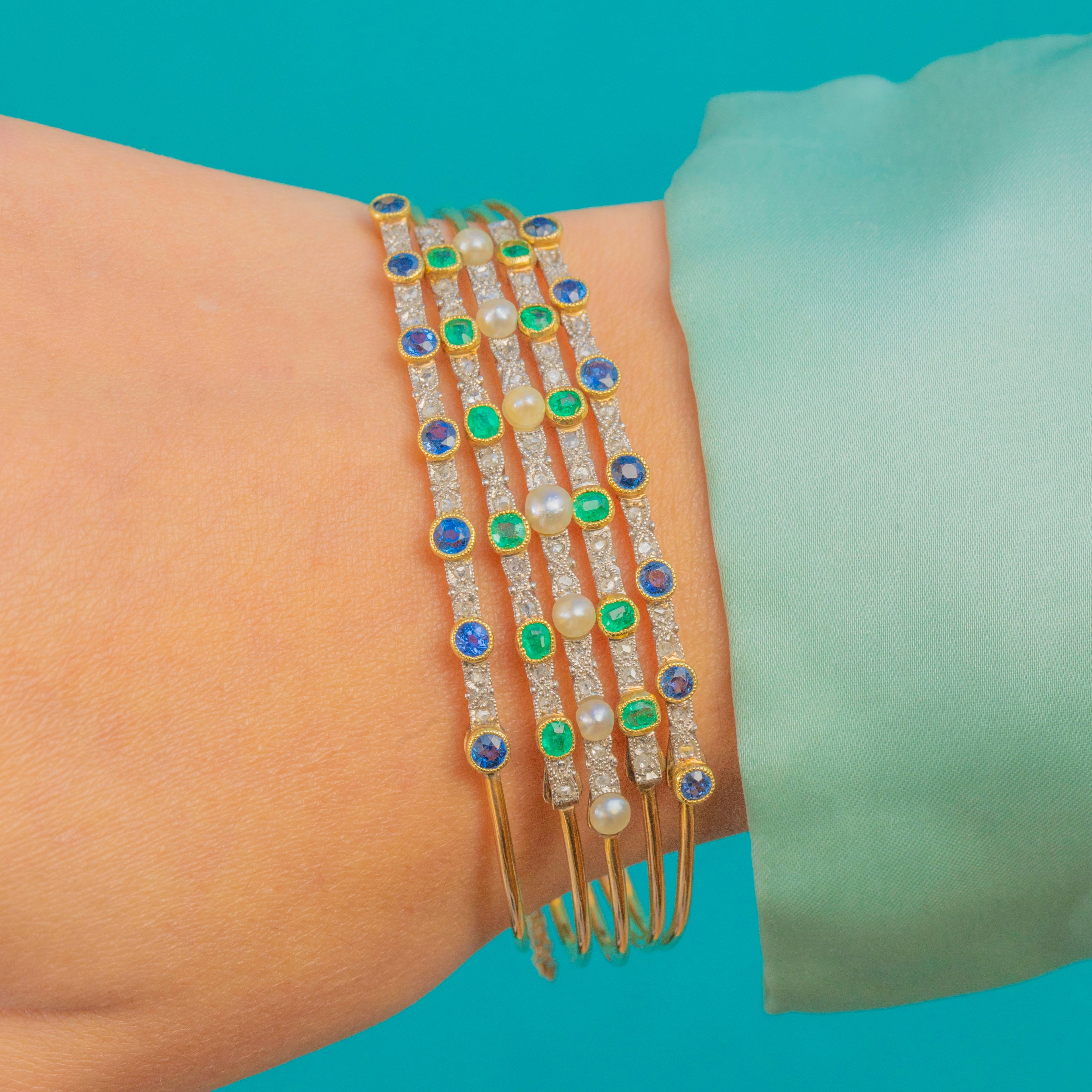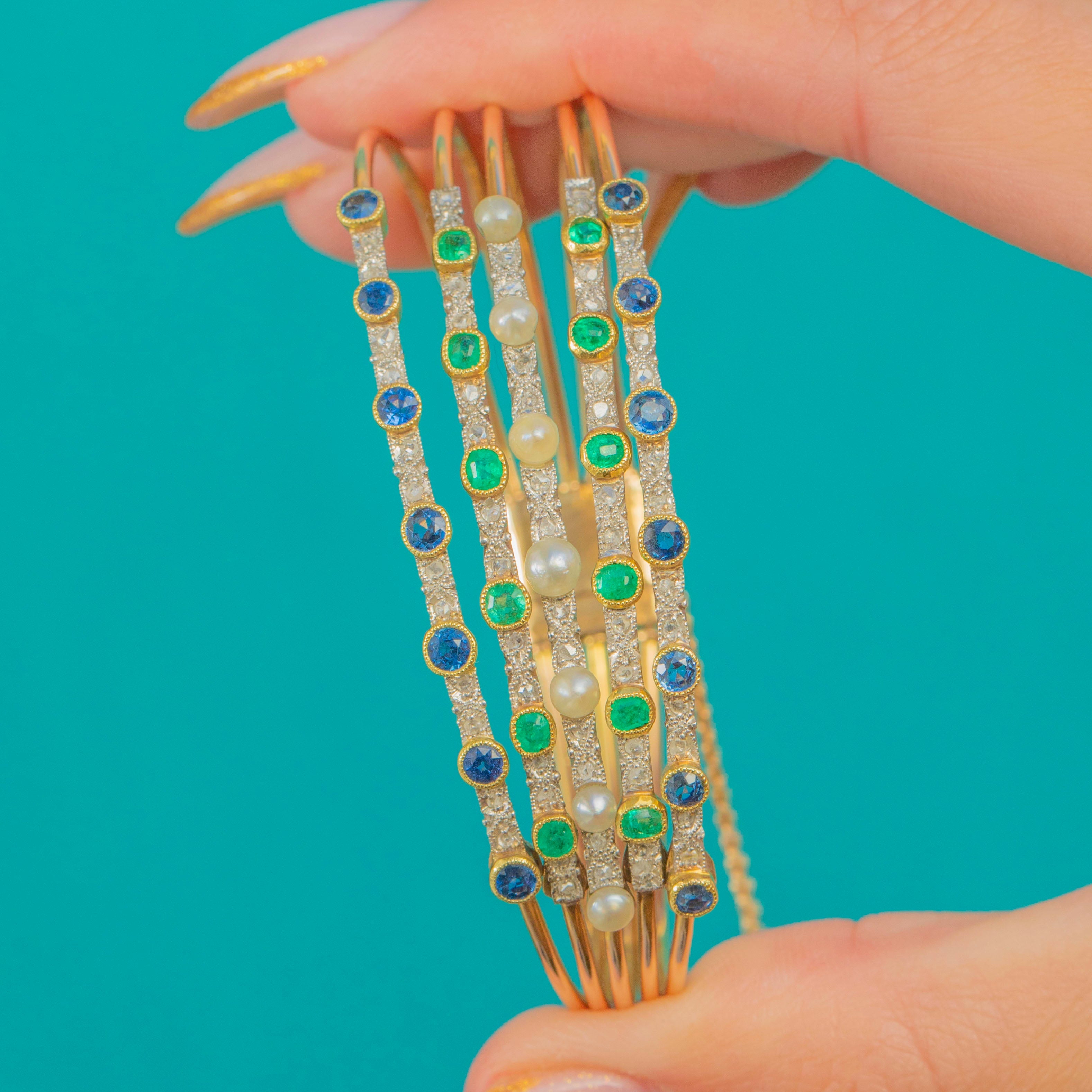 An exceptionally beautiful Edwardian harem bangle crafted in luxurious 18ct Gold with Platinum settings, set with bright Sapphires, vivid Emeralds and Natural Pearls. This style, inspired by exoticism and the romanticism of the early 20th century, is wonderfully opulent on the wrist and retains all its elegance today.