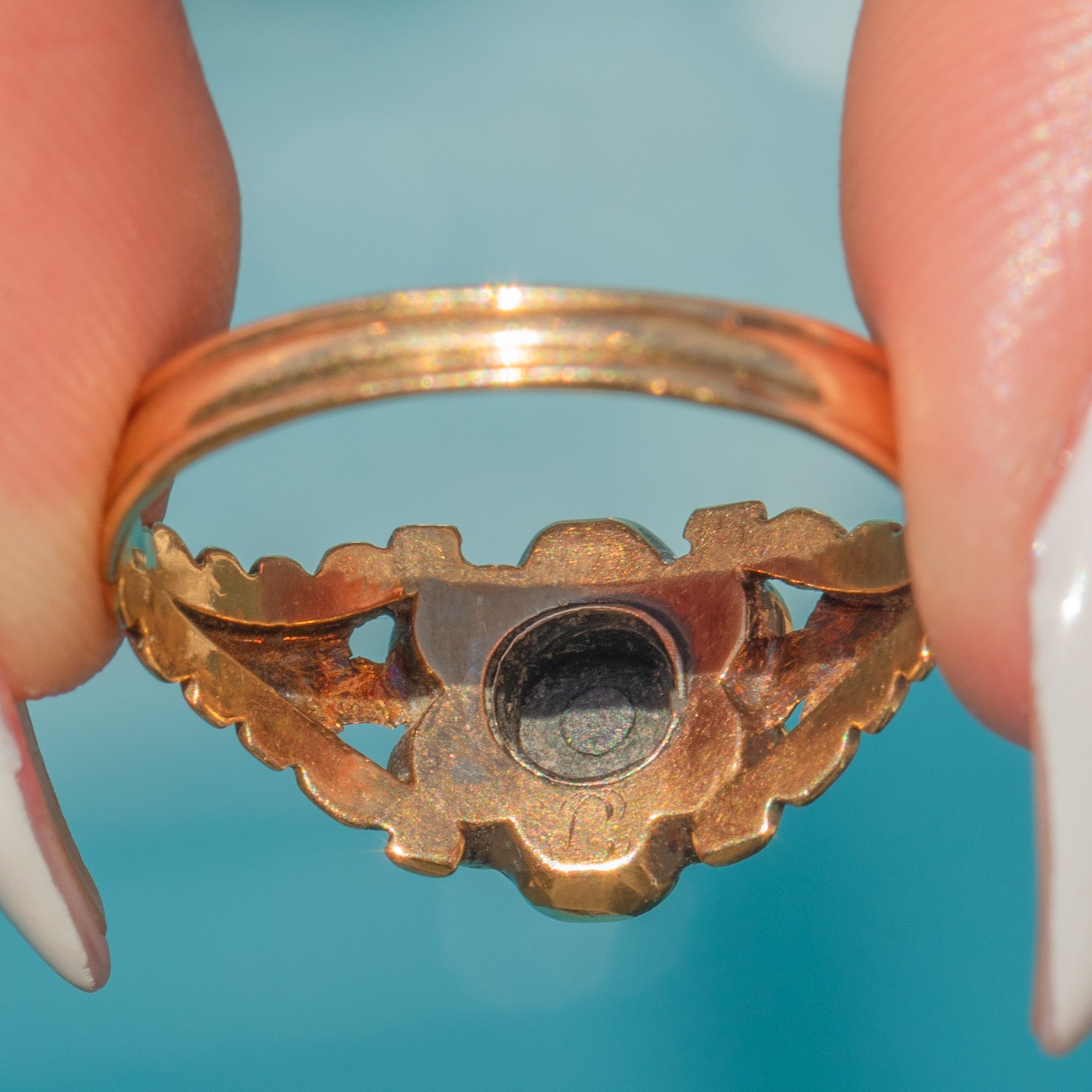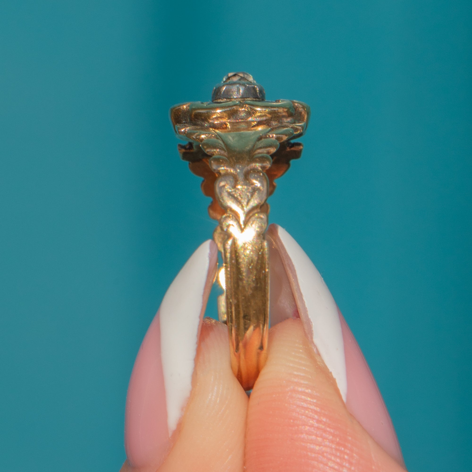 This Victorian mourning ring, dated 1888, features a delicately Enamelled flower centred by a sparkling old-cut Diamond of approximately 0.12ct. The 10mm-wide flower is rendered in rich black Enamel, symbolising remembrance, set into a warm 18ct Gold band.