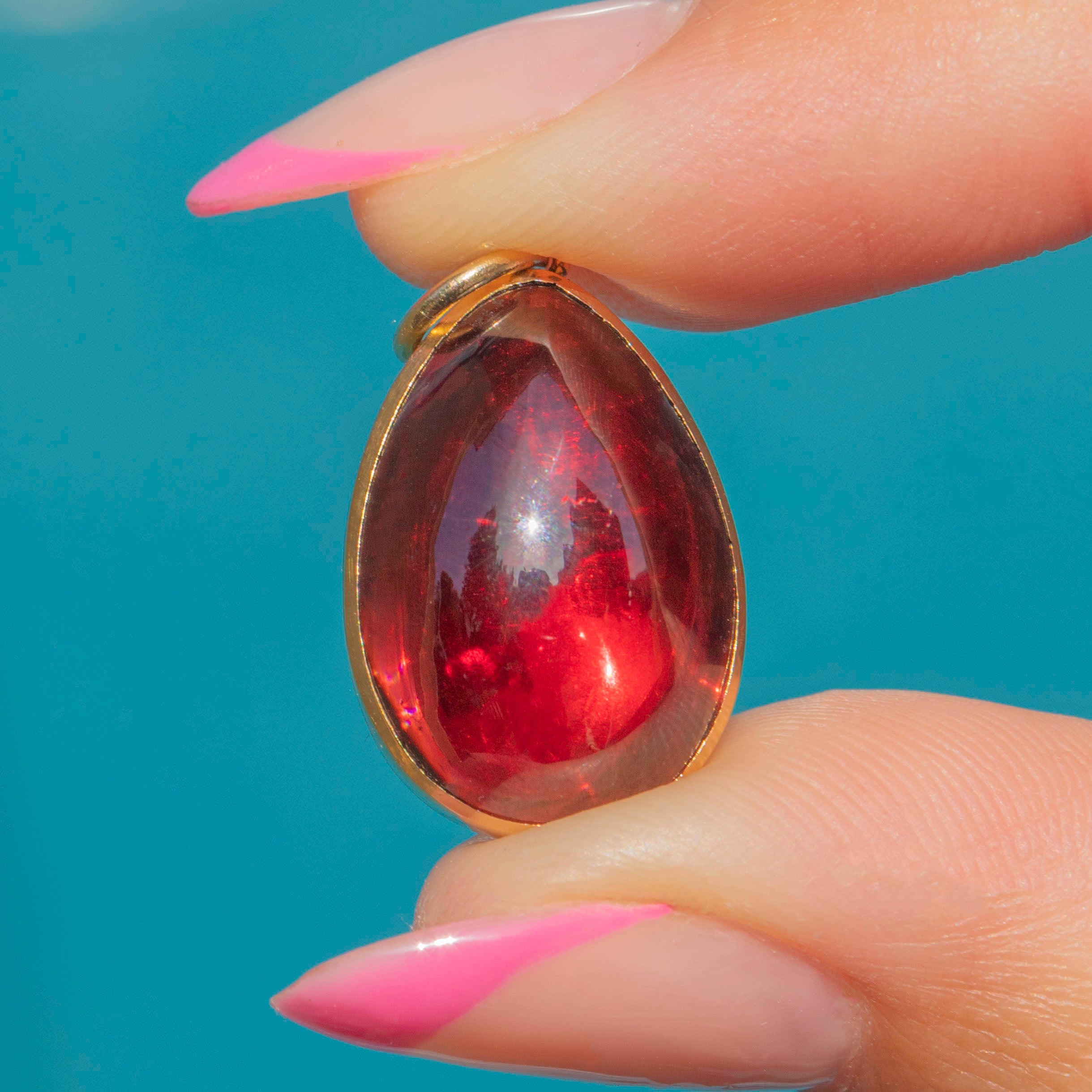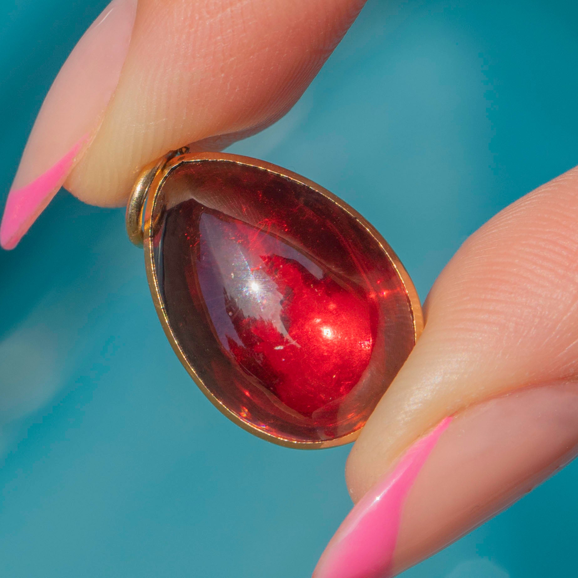 VERY GOOD-EXCELLENT: This antique pear drop 18ct Gold 4.05ct Garnet cabochon pendant is in great condition. Her Garnet is radiant, with only minor surface scratches visible under a loupe. There are some small spots of discolouration to the Gold bezel, though this is expected with age. With a securely soldered jump ring, you can wear this Victorian pendant with ease.