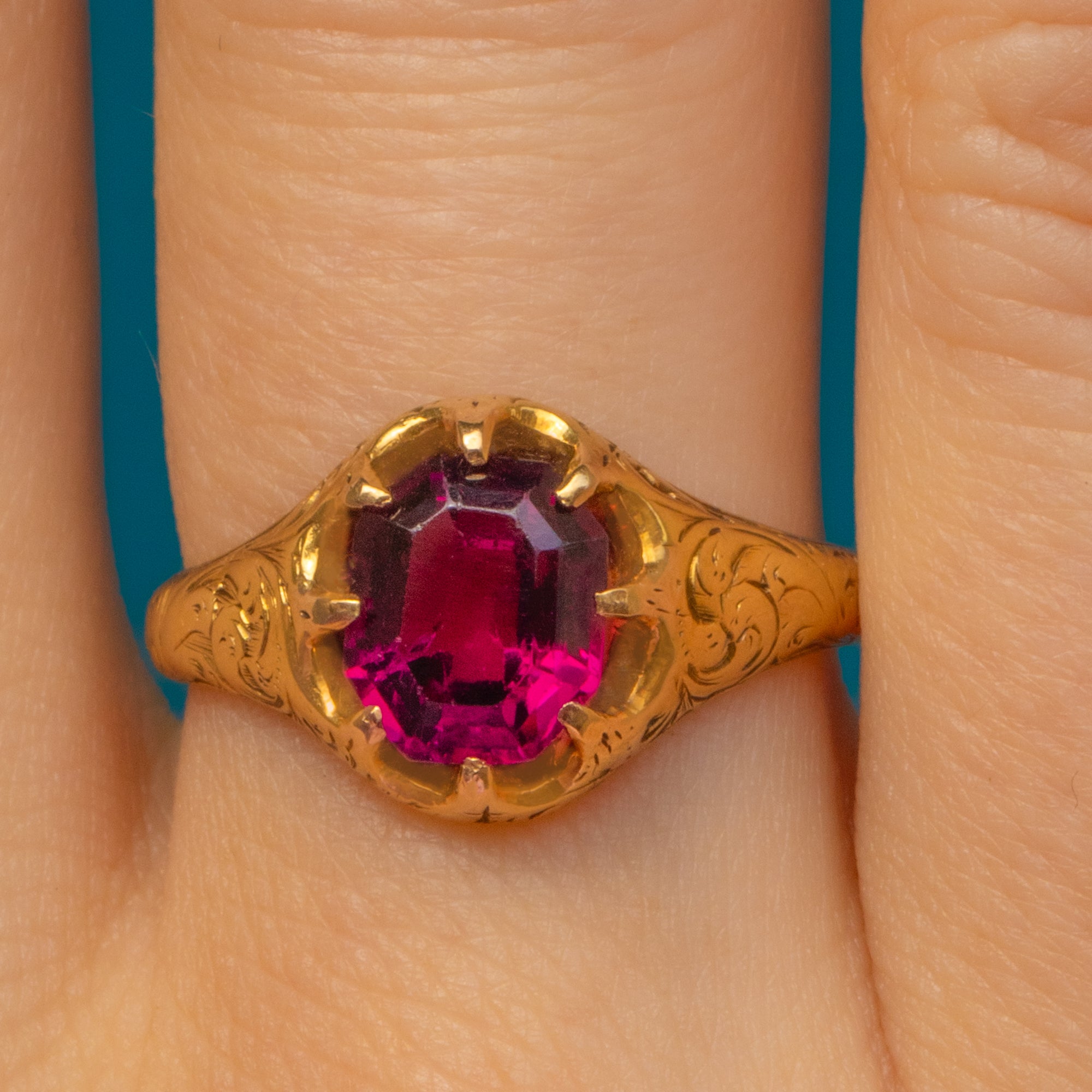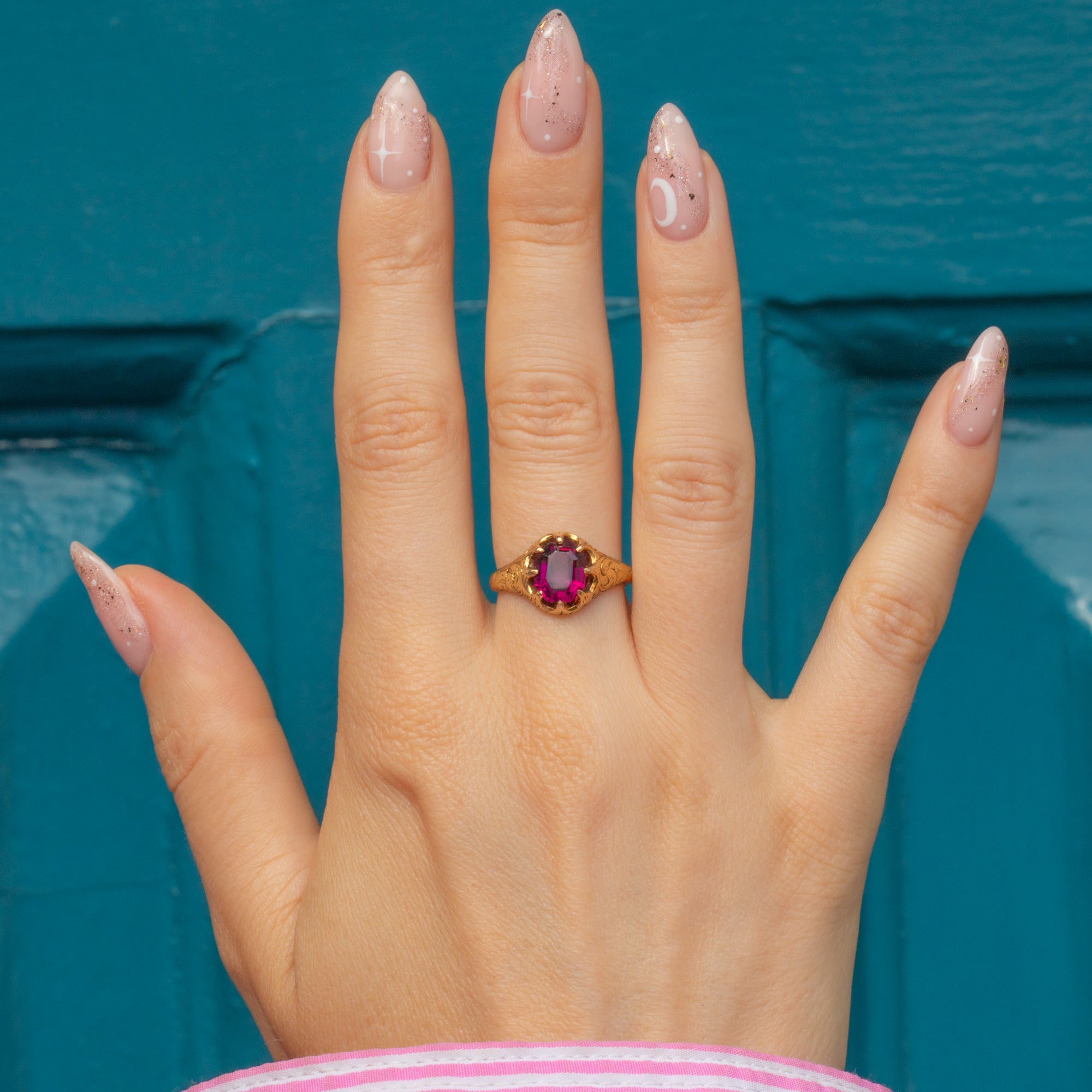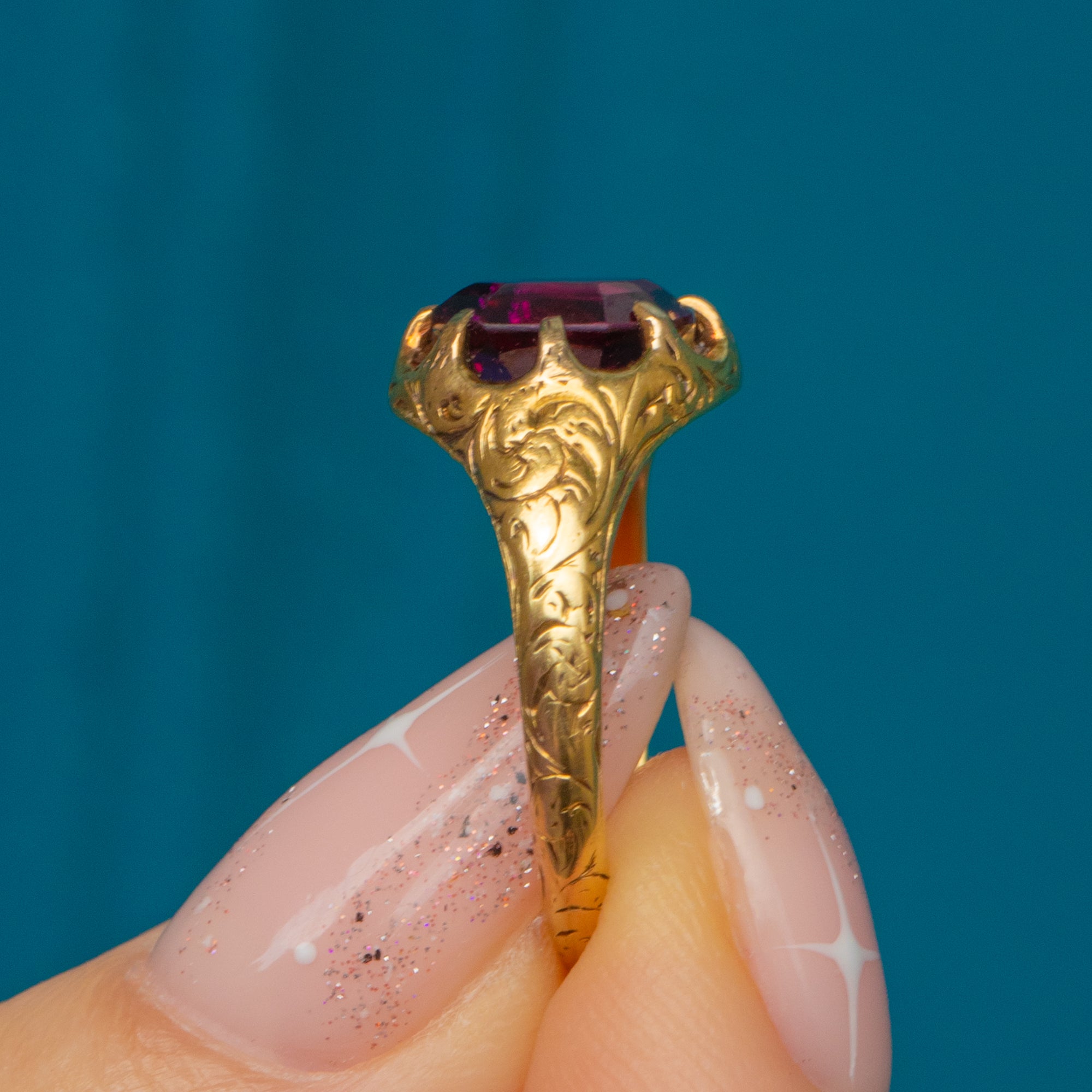 The delicious raspberry hues emanating from the depths of the Garnet are complimented by the buttery 18ct Gold, with its chunky form covered in whimsical engravings perfectly capturing the skilled craftsmanship of the Victorian era!
