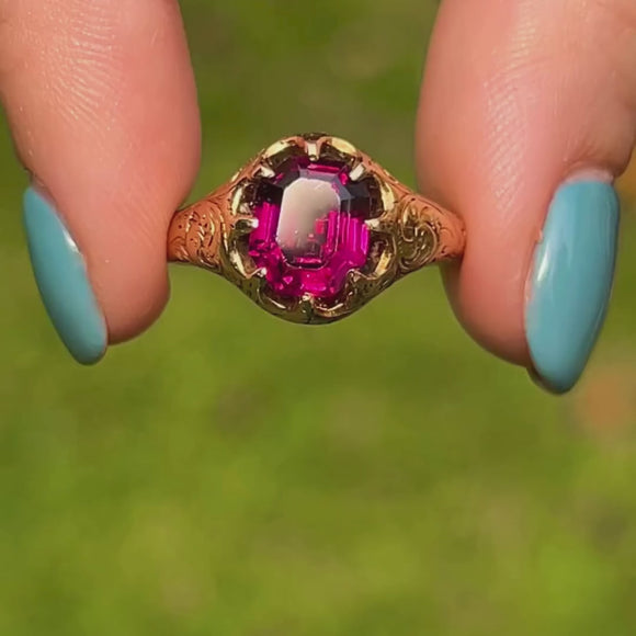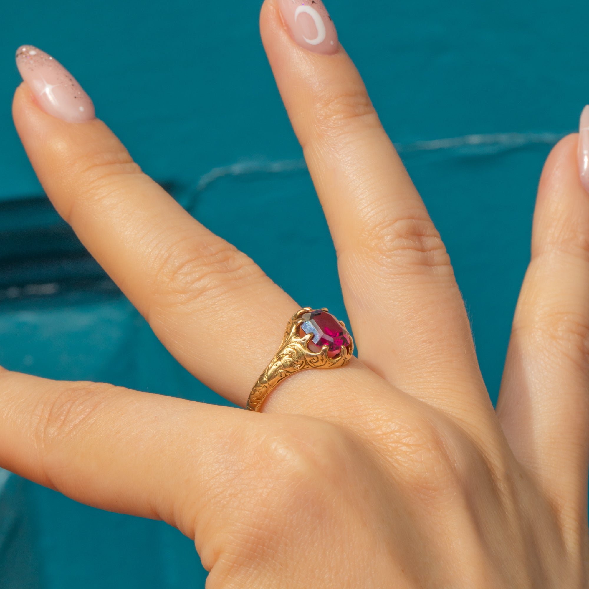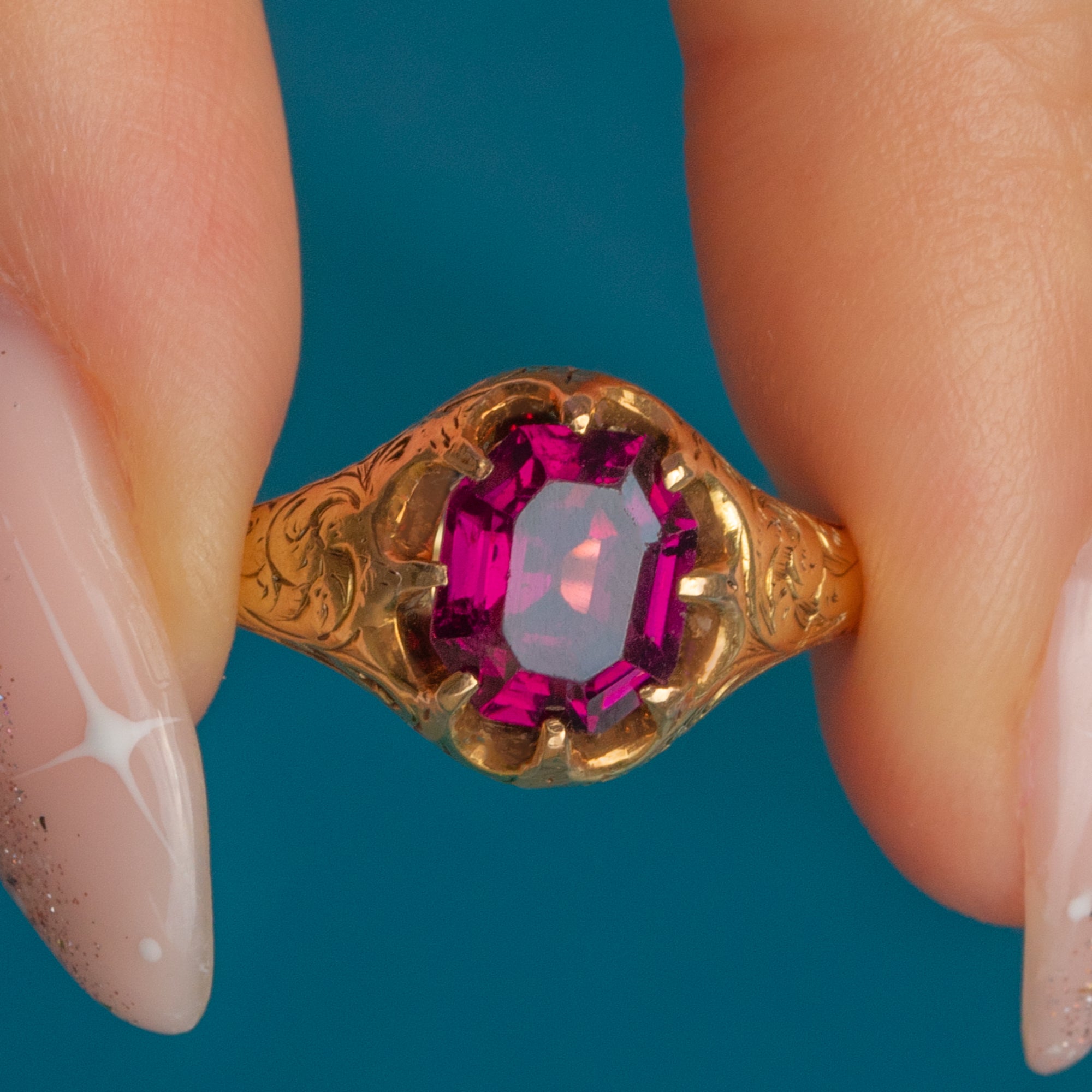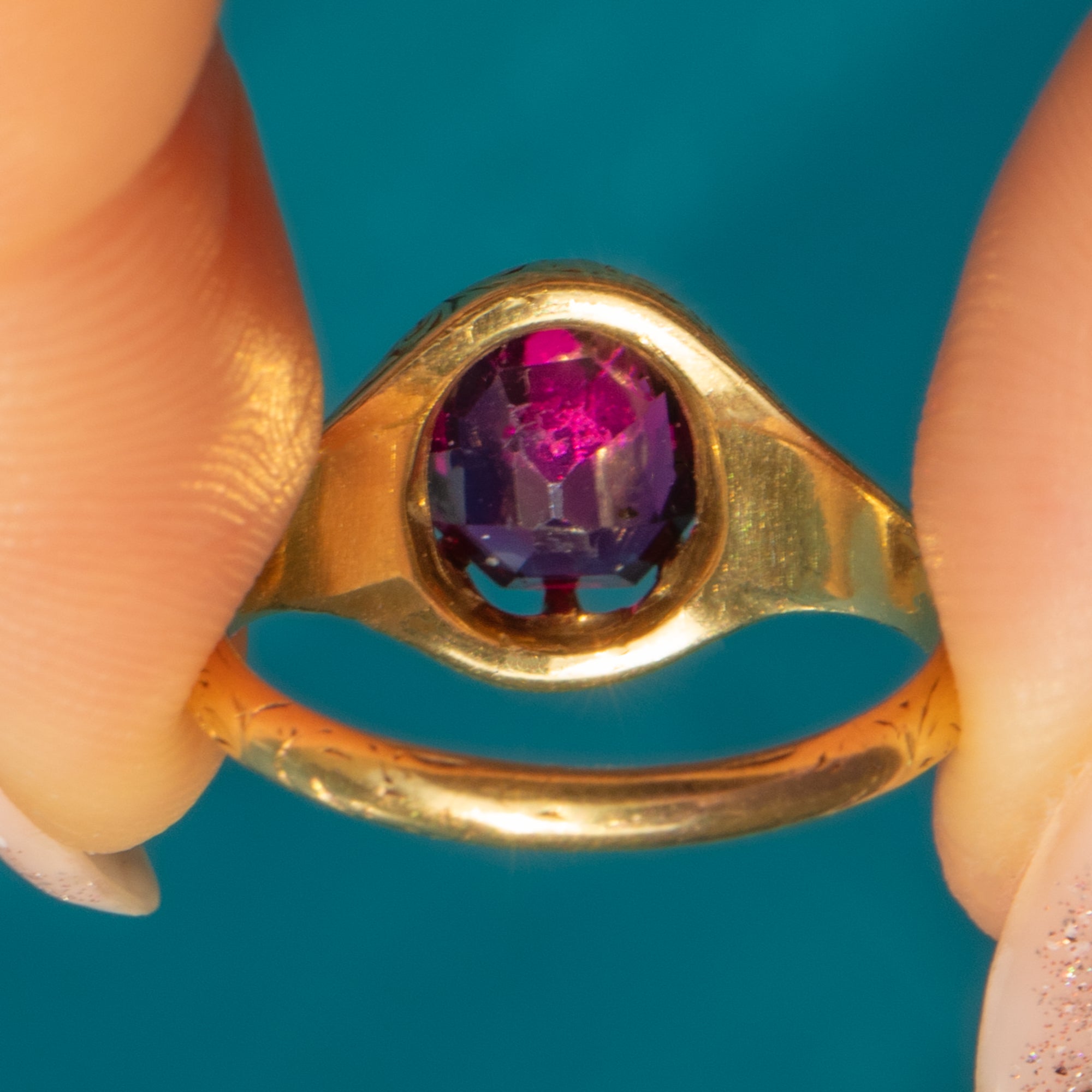The delicious raspberry hues emanating from the depths of the Garnet are complimented by the buttery 18ct Gold, with its chunky form covered in whimsical engravings perfectly capturing the skilled craftsmanship of the Victorian era!