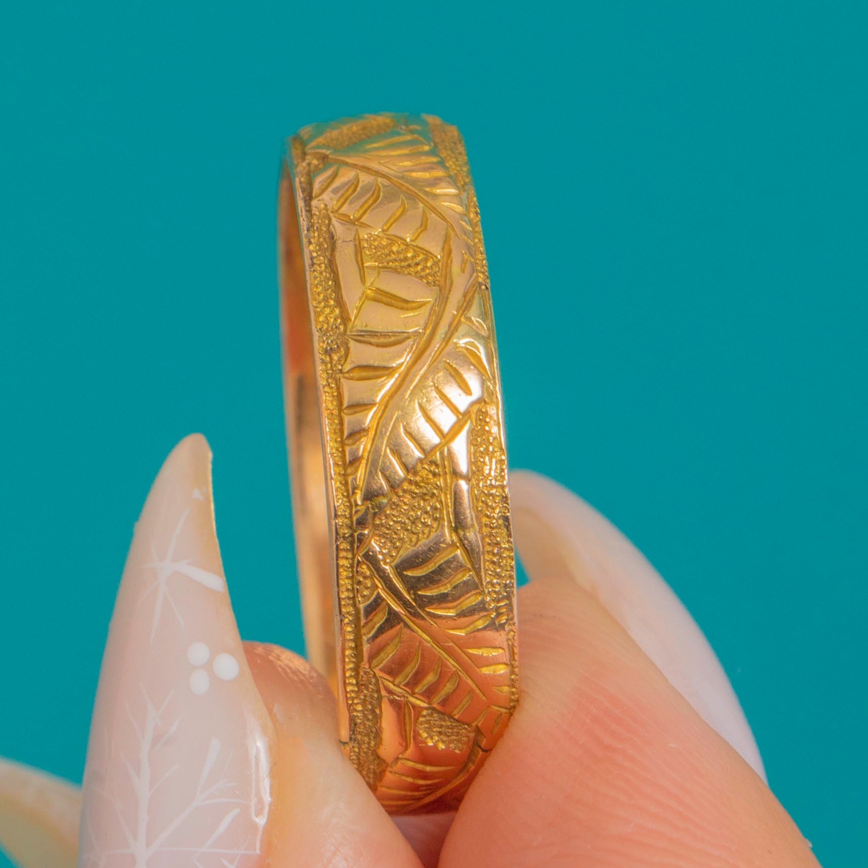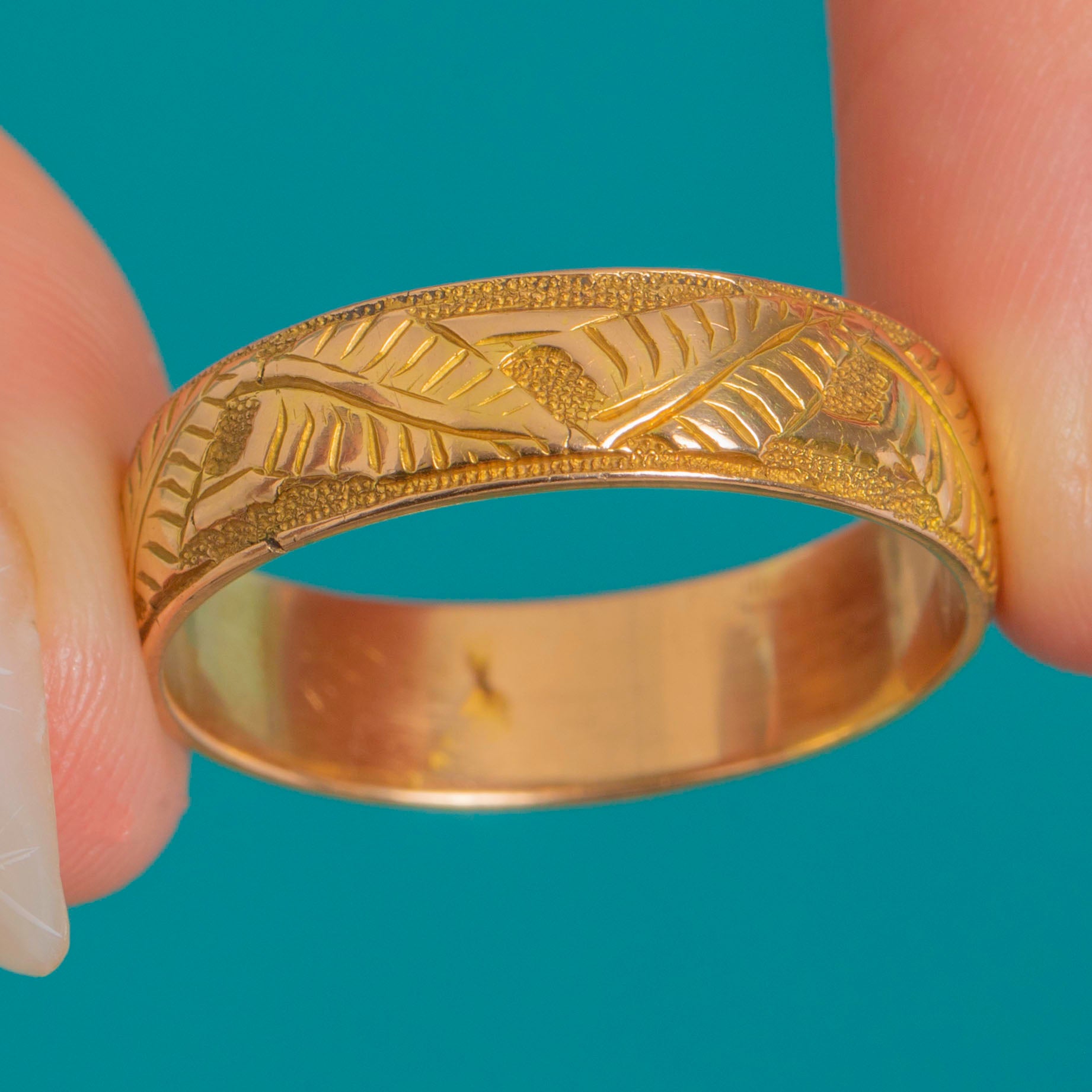 Romantic and refined, this Victorian 18ct Gold wedding/keeper band is hand-engraved all the way around with evergreen fern fronds, bright-cut so they shimmer against a finely stippled ground. Slim raised borders frame the design for a beautifully crisp, tactile finish that feels luxurious.