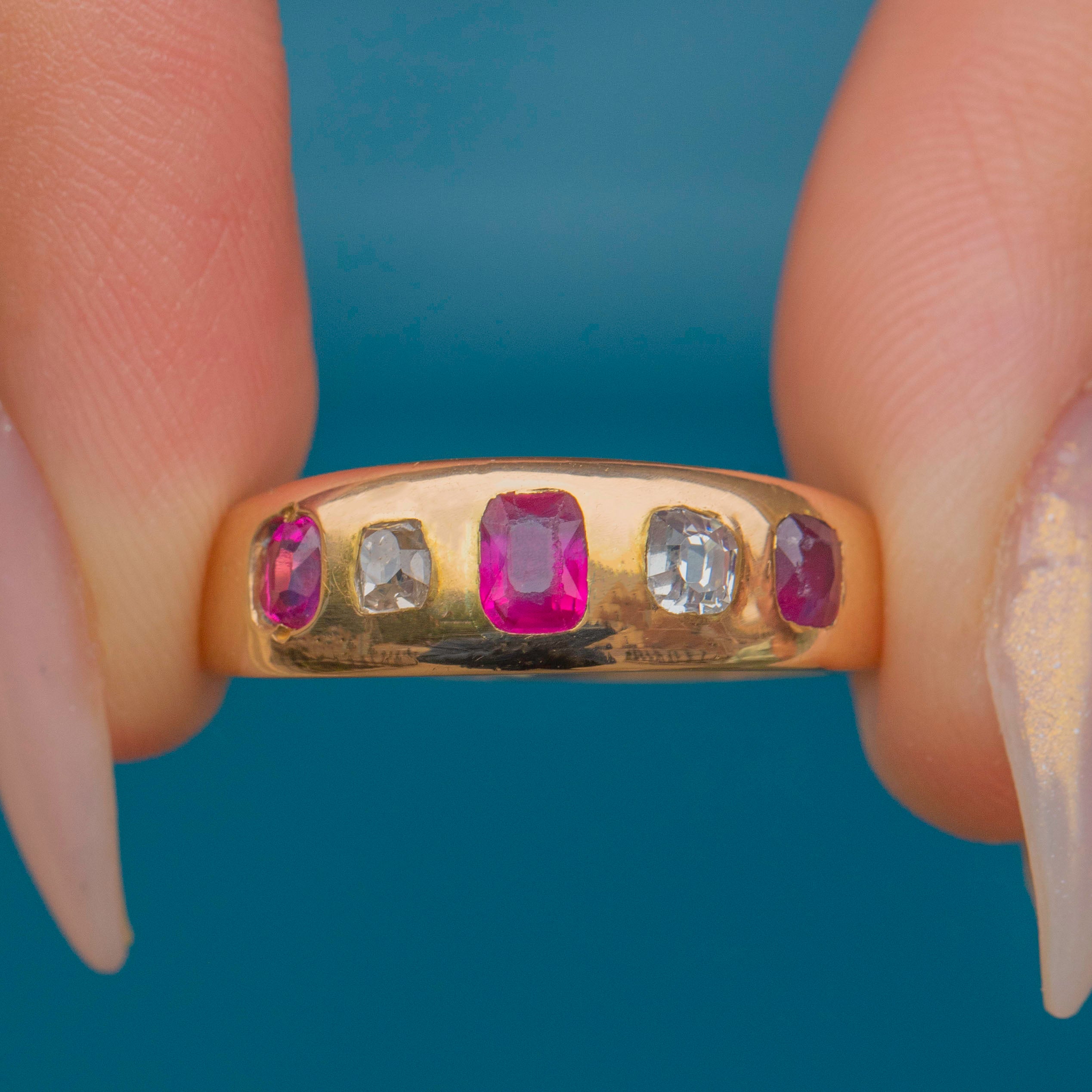 A beautiful Victorian gypsy ring crafted in rich 18ct Gold, set with sparkling Diamonds and vivid Rubies.