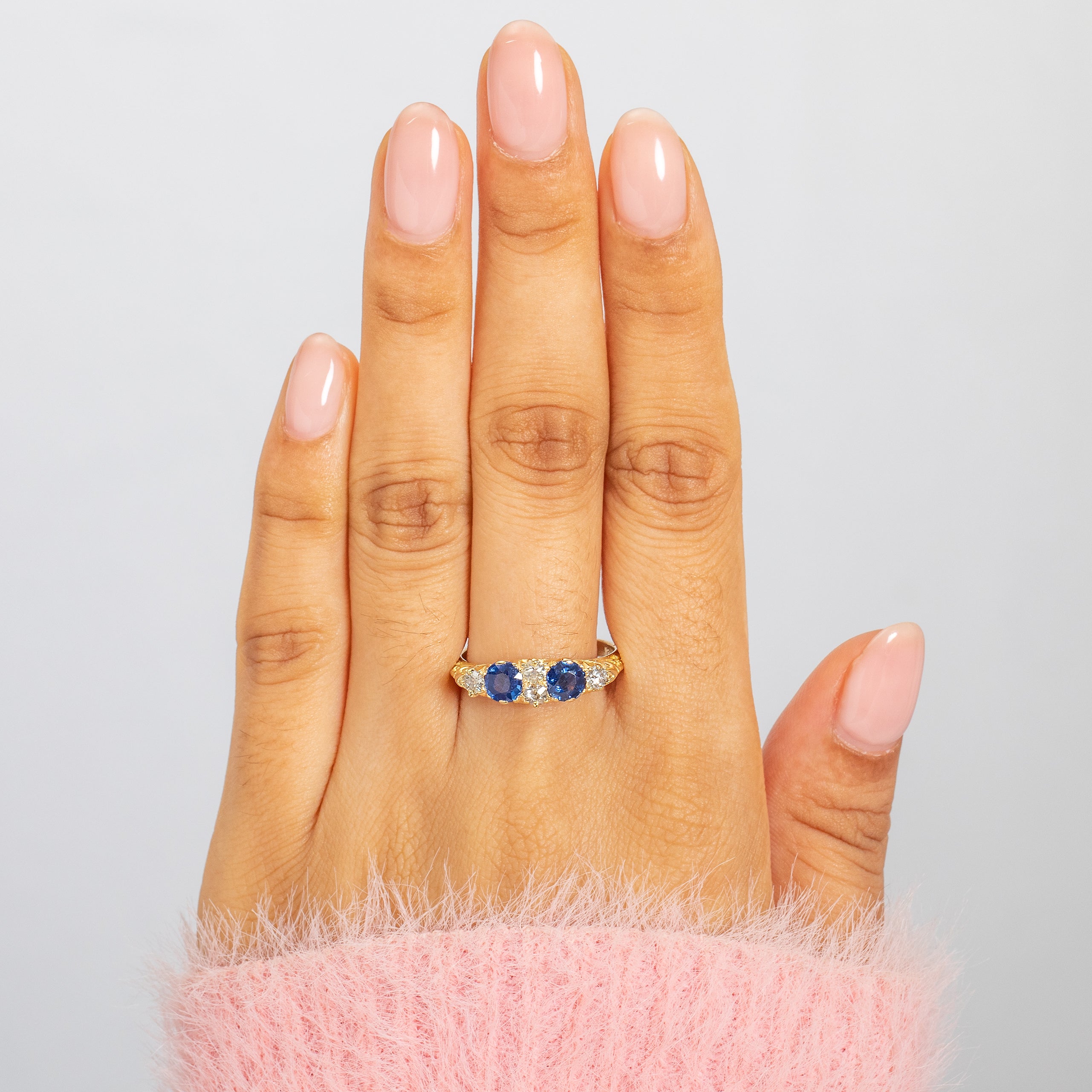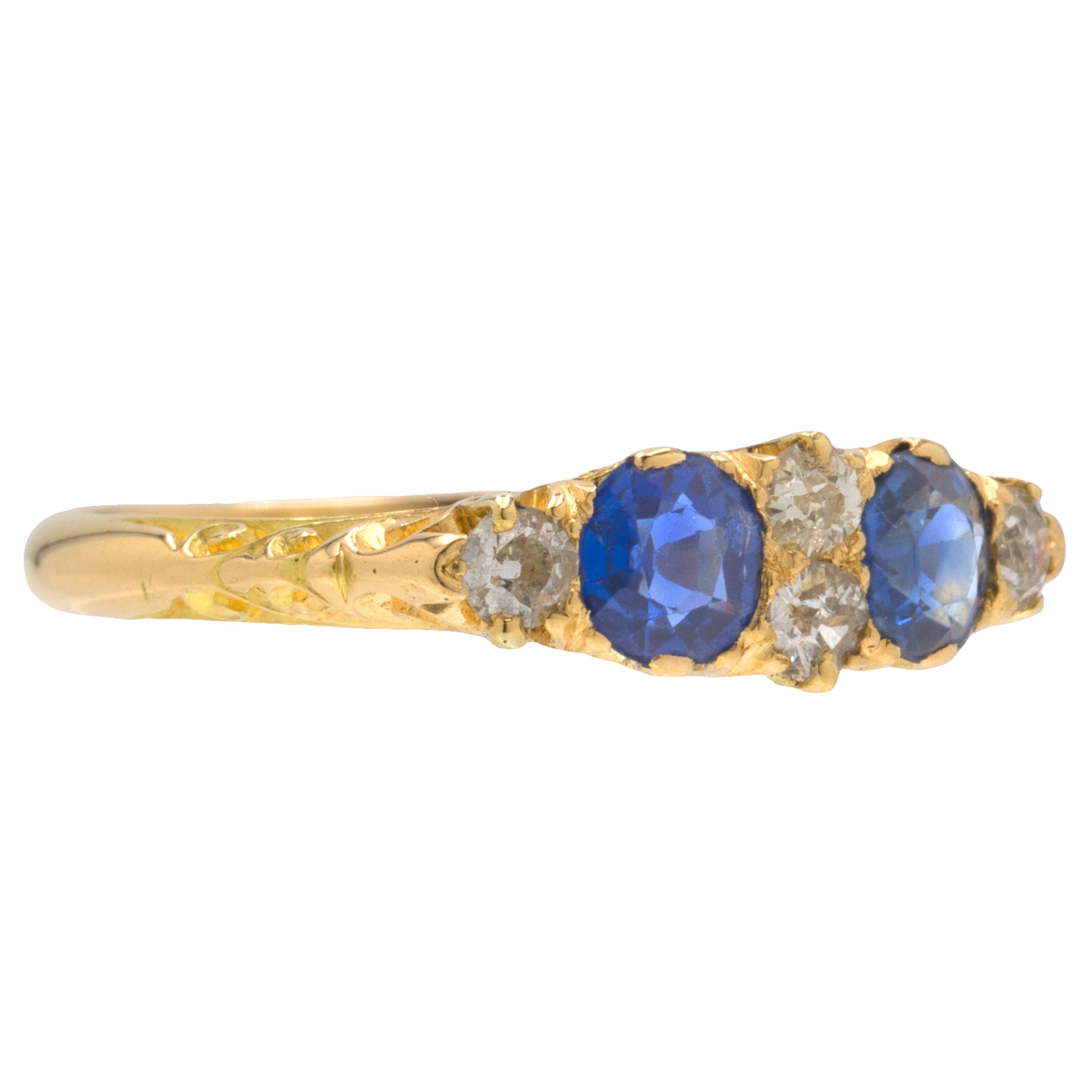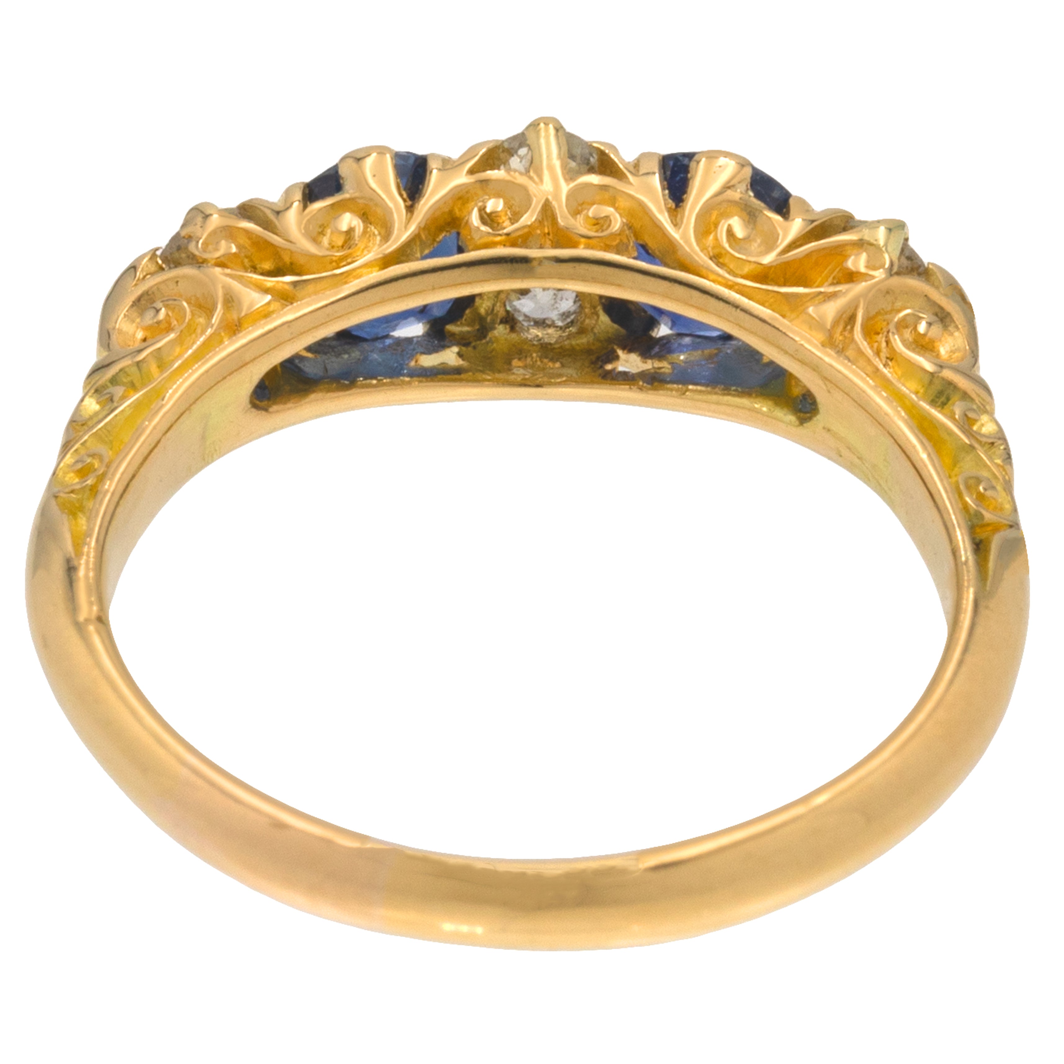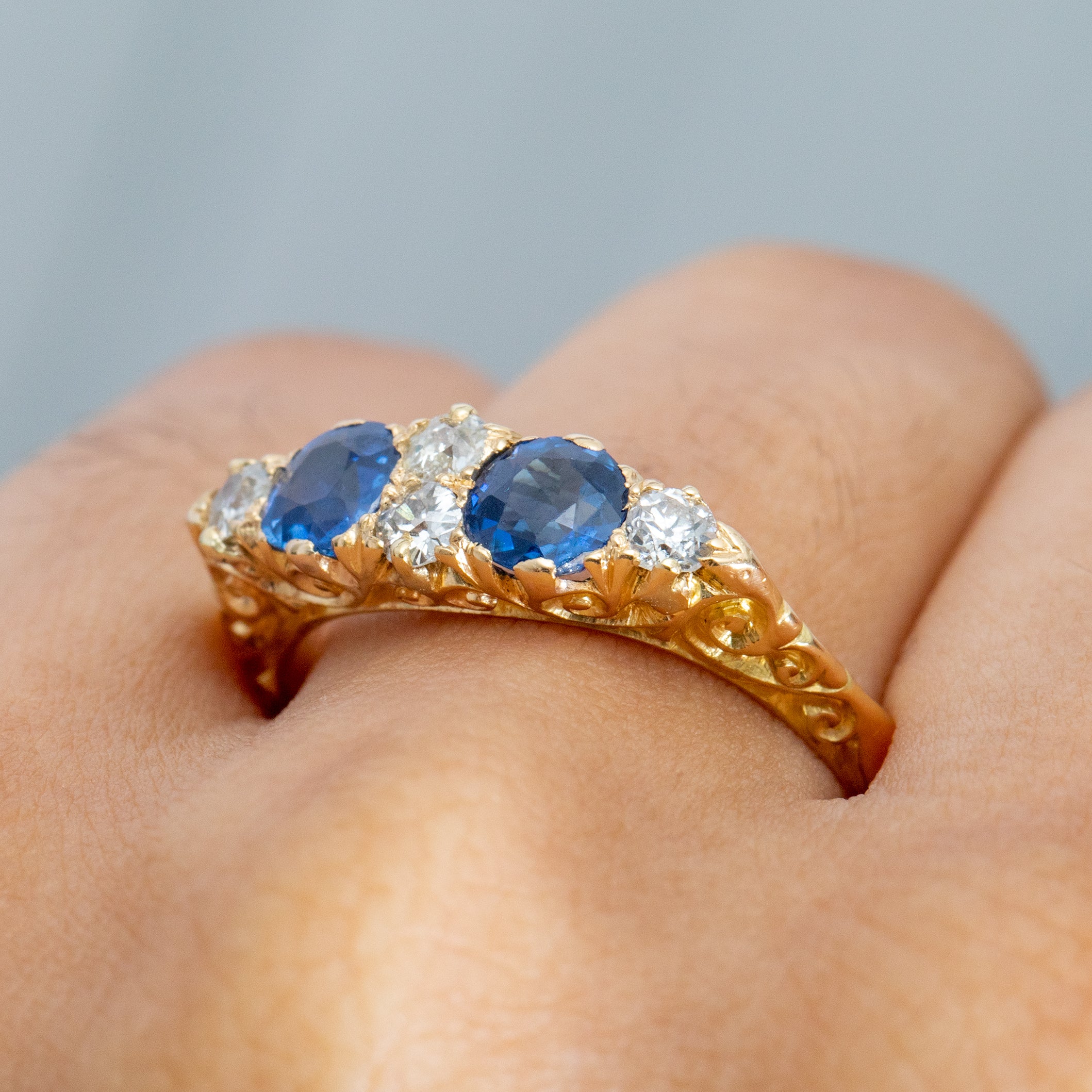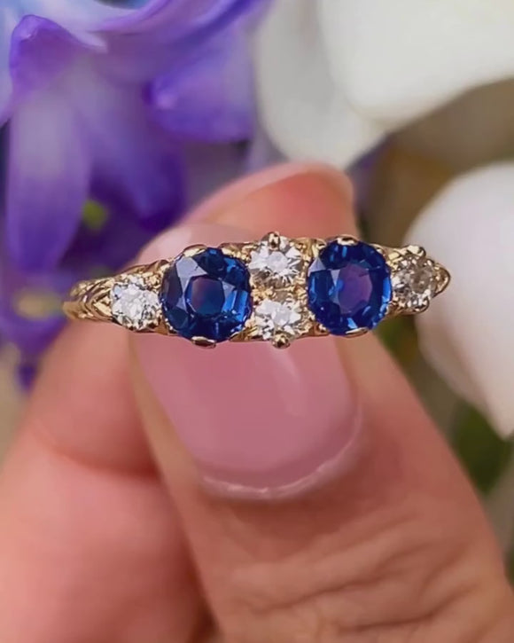 Side on, you will become enchanted by the exquisitely crafted gallery that showcases ornately engraved details in 18ct Gold. Whether you're looking for a unique engagement ring or to add a touch of luxury to your ring stack, this antique Sapphire Diamond ring would make the perfect choice!