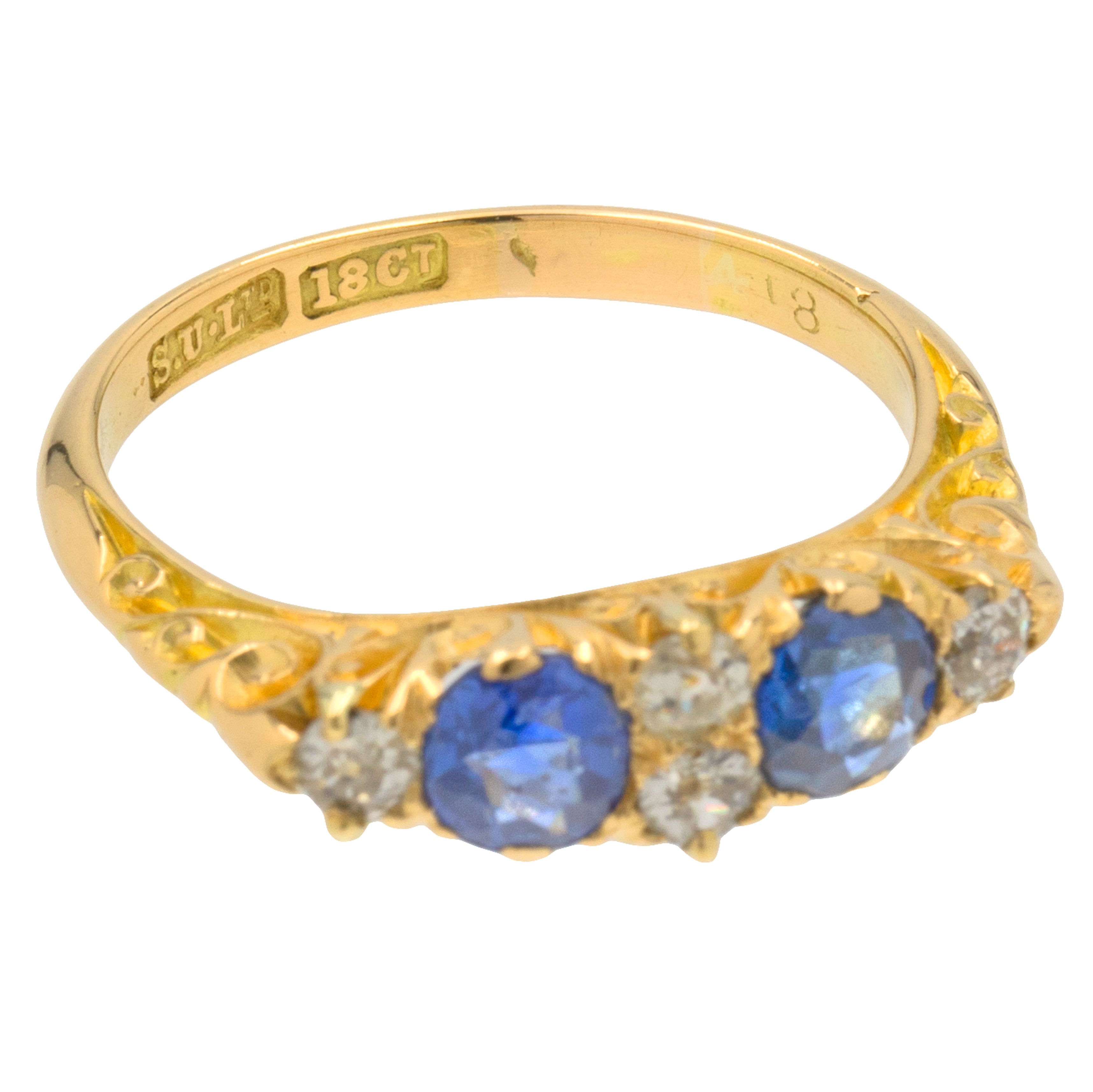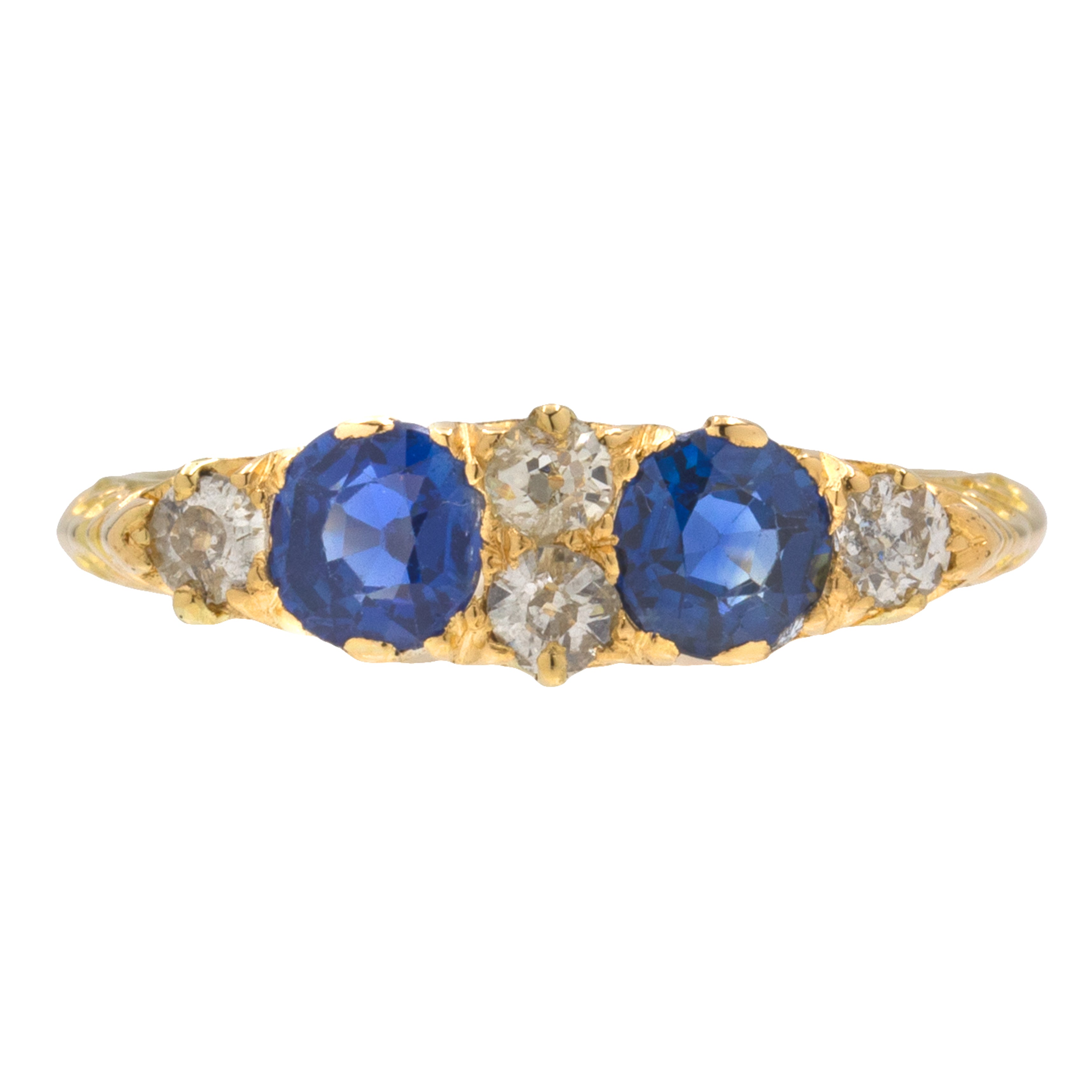 VERY GOOD TO EXCELLENT: We are pleased to present this antique Victorian 18ct Gold natural Sapphire Diamond boat ring in excellent condition. The 18ct Gold is brightly saturated and the engraved details have remained crisp. There is one minor nick to the inside of the band, but this is not noticeable when the ring is being worn. The Sapphires & Diamonds make for a lovely pairing, all free from any chips and securely set. This ring is ready to be cherished for generations to come!