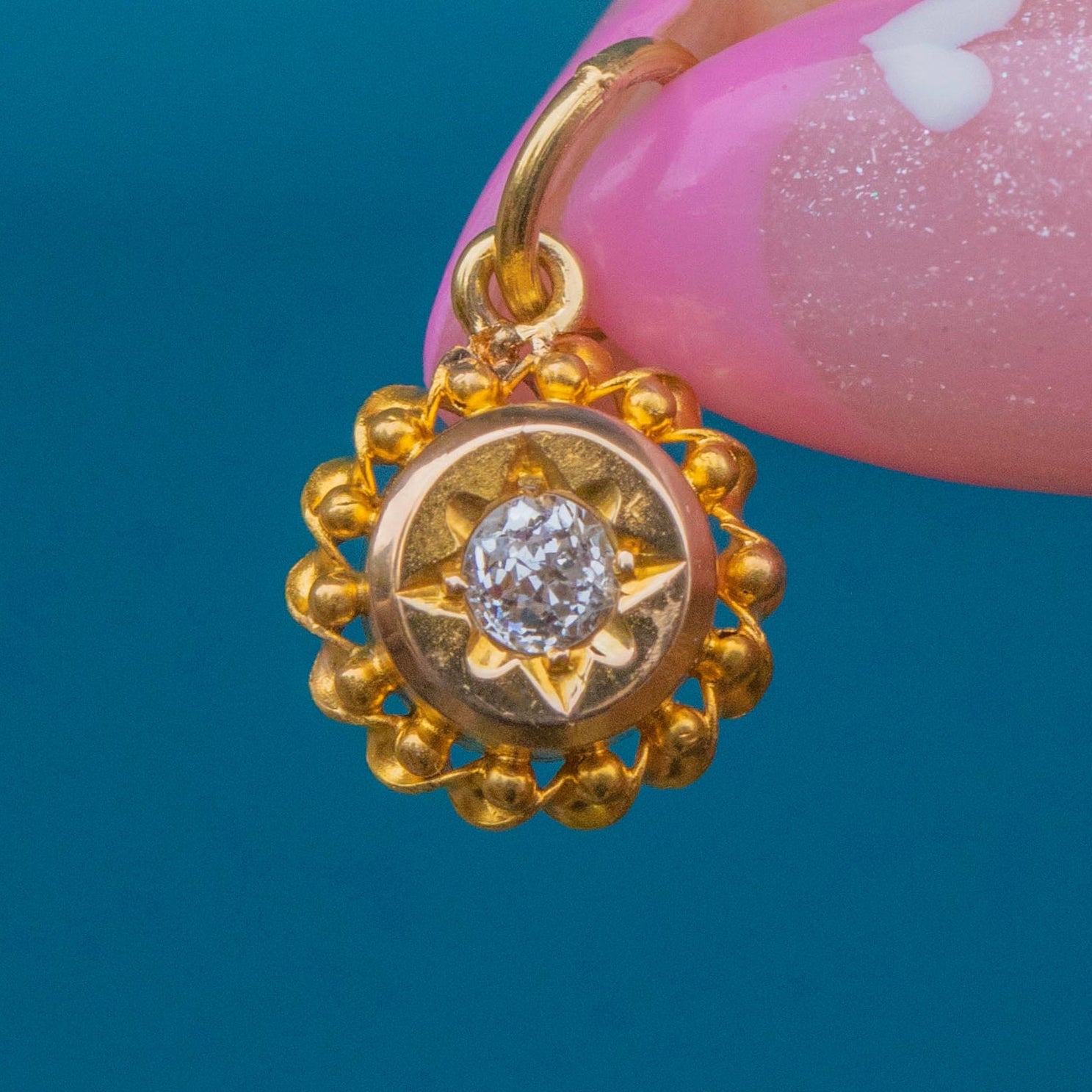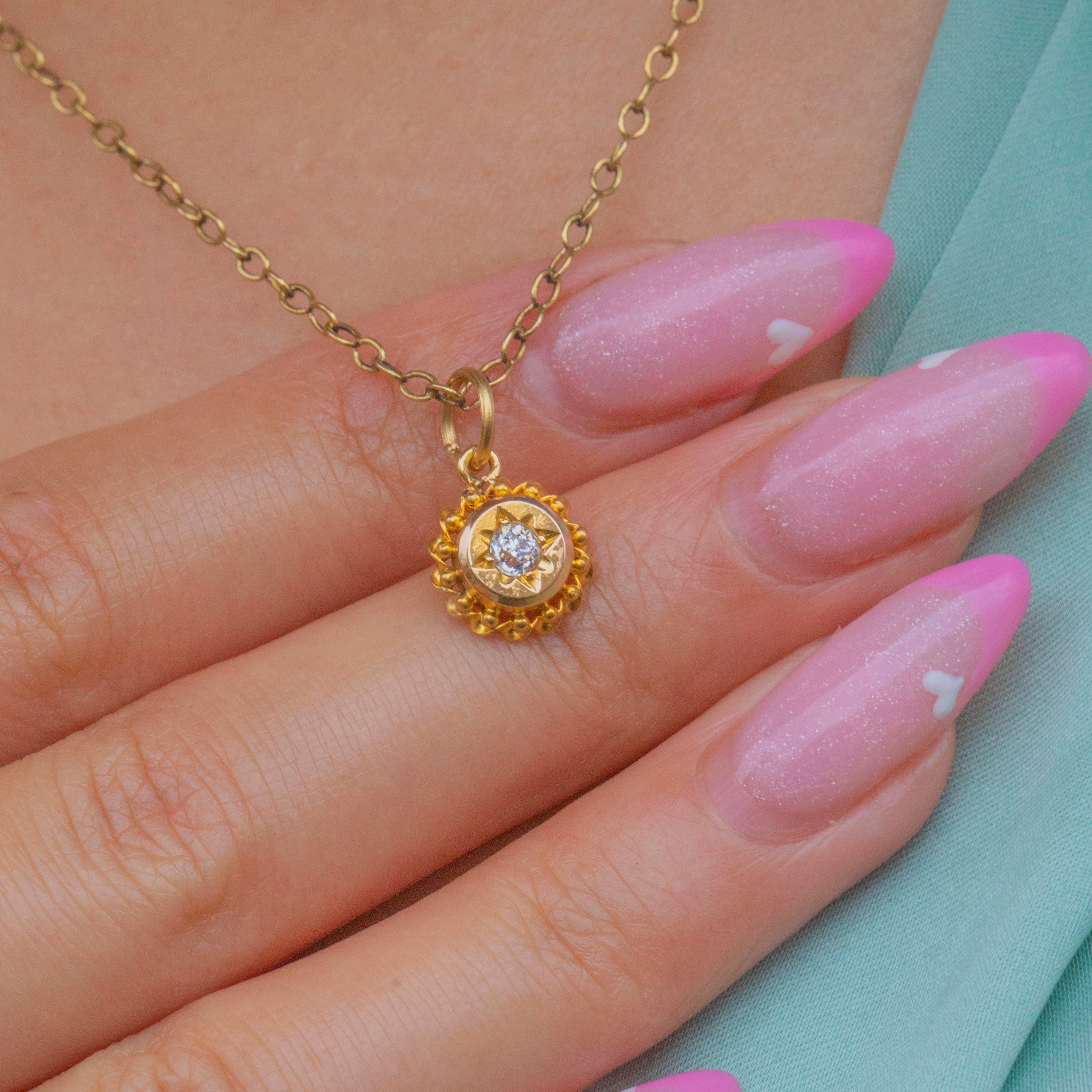 This charming Victorian Etruscan revival pendant is crafted in rich 18ct Gold, with a twinkling Old Mine Cut Diamond in a hand-engraved star setting. The Gold frame is beautifully adorned with granulated beadwork, a hallmark of the Etruscan Revival style so beloved in the late 19th century.