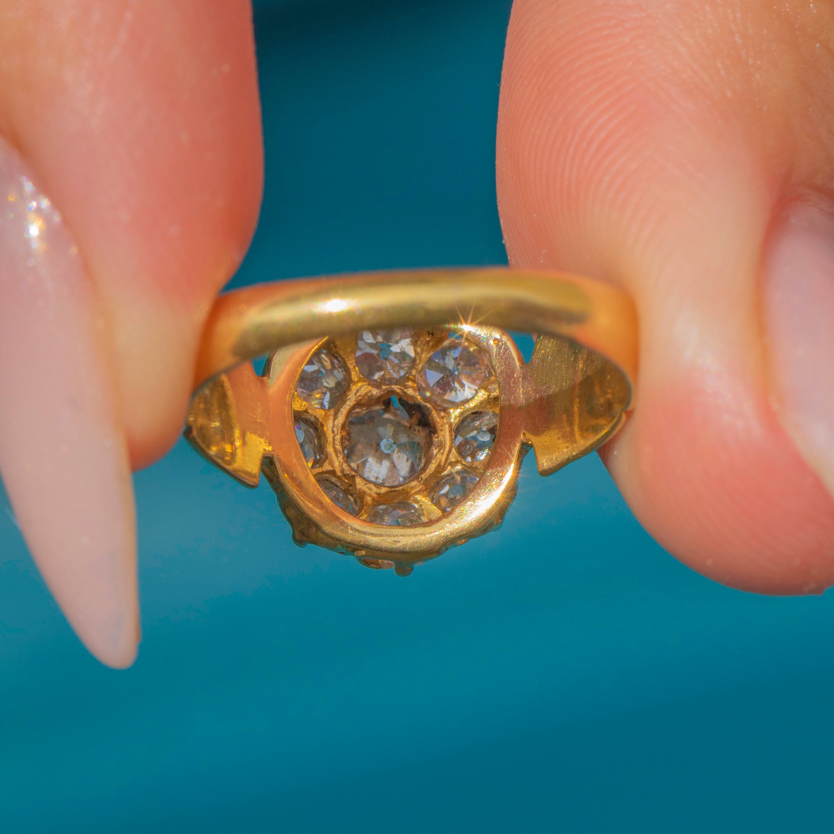 A beautifully crafted Victorian Old Mine Cut Diamond cluster ring in rich 18ct Gold, c.1870. The ring features a sparkling circular cluster, centred by a bright old Mine Cut Diamond surrounded by a halo of eight more!