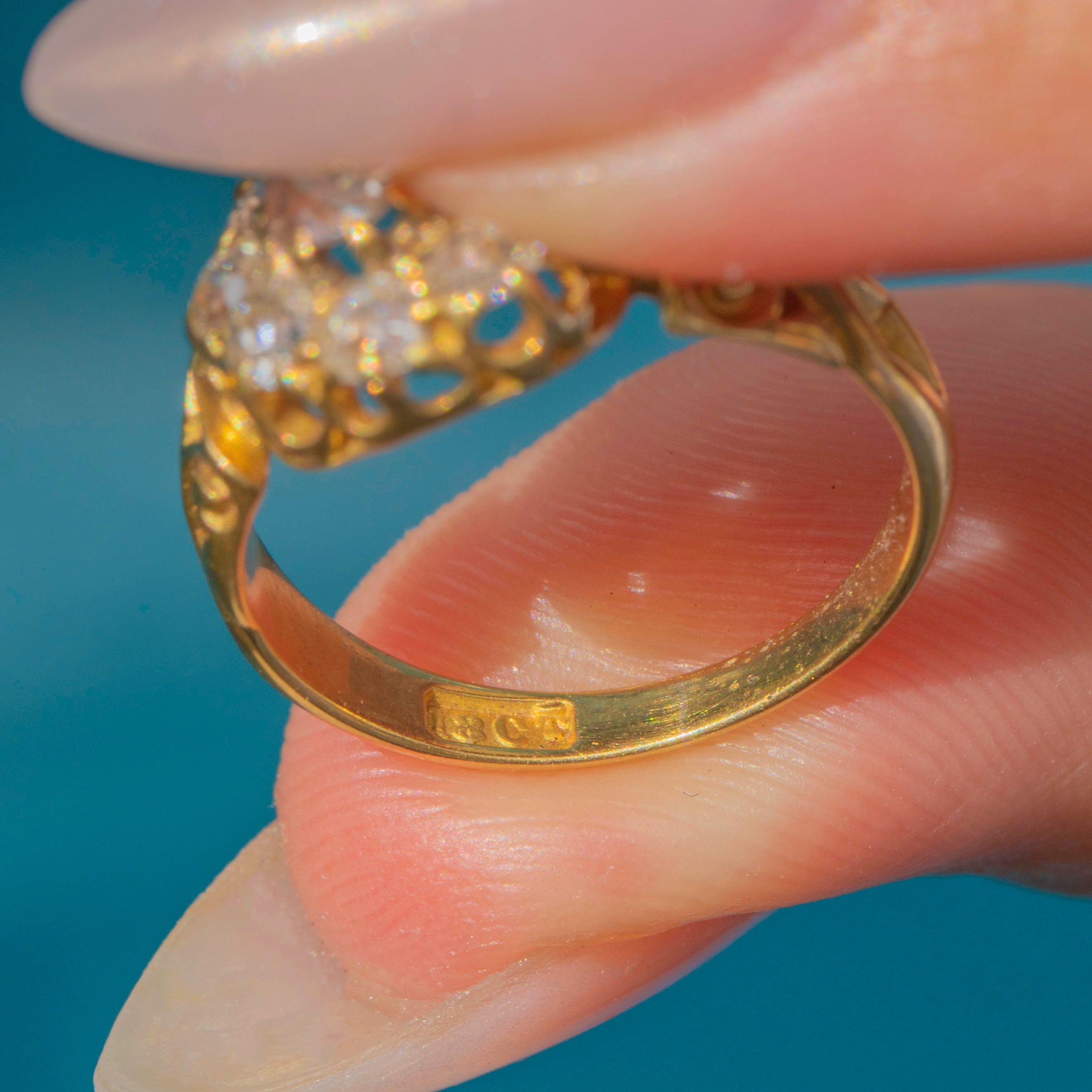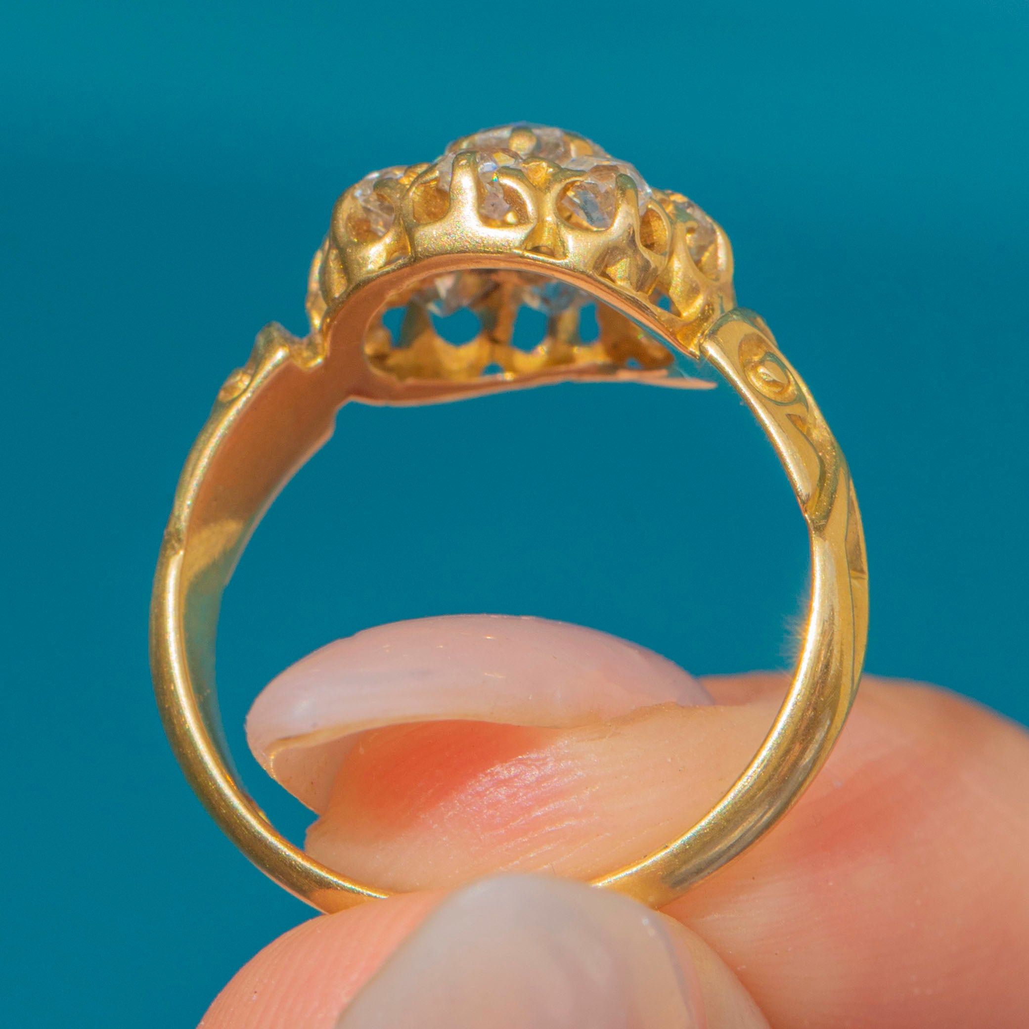 The cluster has excellent presence on the finger at 10mm across, balanced by stylish scrolled shoulders that taper into a solid Gold shank. The detail of the engraving and the raised openwork gallery give the piece a refined antique character typical of the mid-Victorian era.
