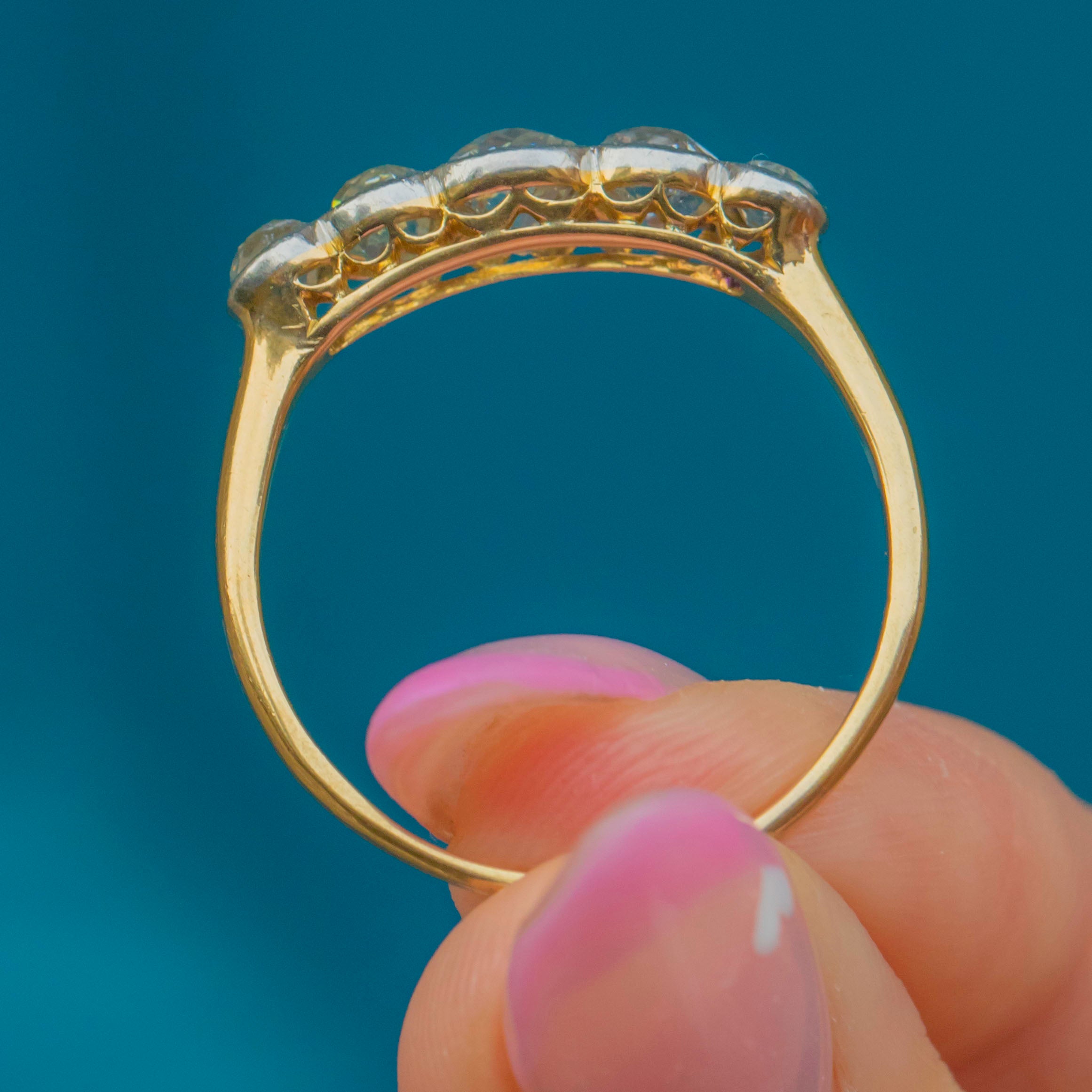 This exceptional Victorian five-stone ring is set with a lively arrangement of Old Mine Cut Diamonds, each full of antique character and brilliance. The Diamonds are set in Platinum over 18ct Gold, their gentle cushion and oval cuts sparkling with warmth and depth typical of 19th-century craftsmanship.