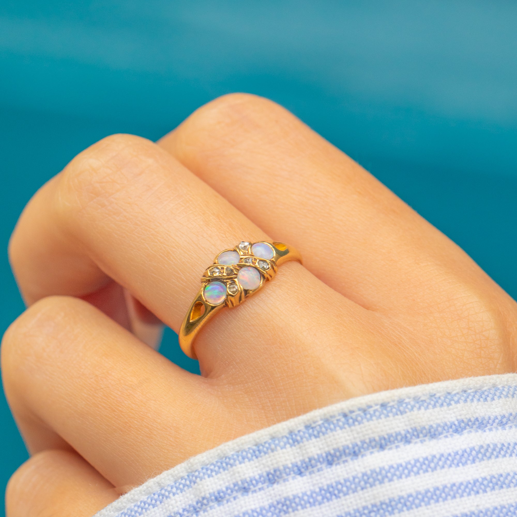 This Antique Victorian ring is crafted in rich 18ct Gold and set with luminous Opals and glittering old-cut Diamonds. The Opals display beautiful play-of-colour, flashing green, orange, and blue, while the Diamonds add a subtle sparkle that enhances the ring’s timeless charm.