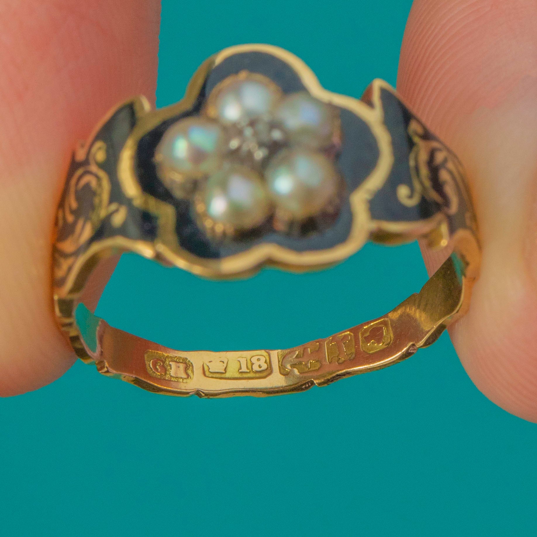 MATERIALS: Tests as 18ct Gold, Enamel, Pearl, Diamond.