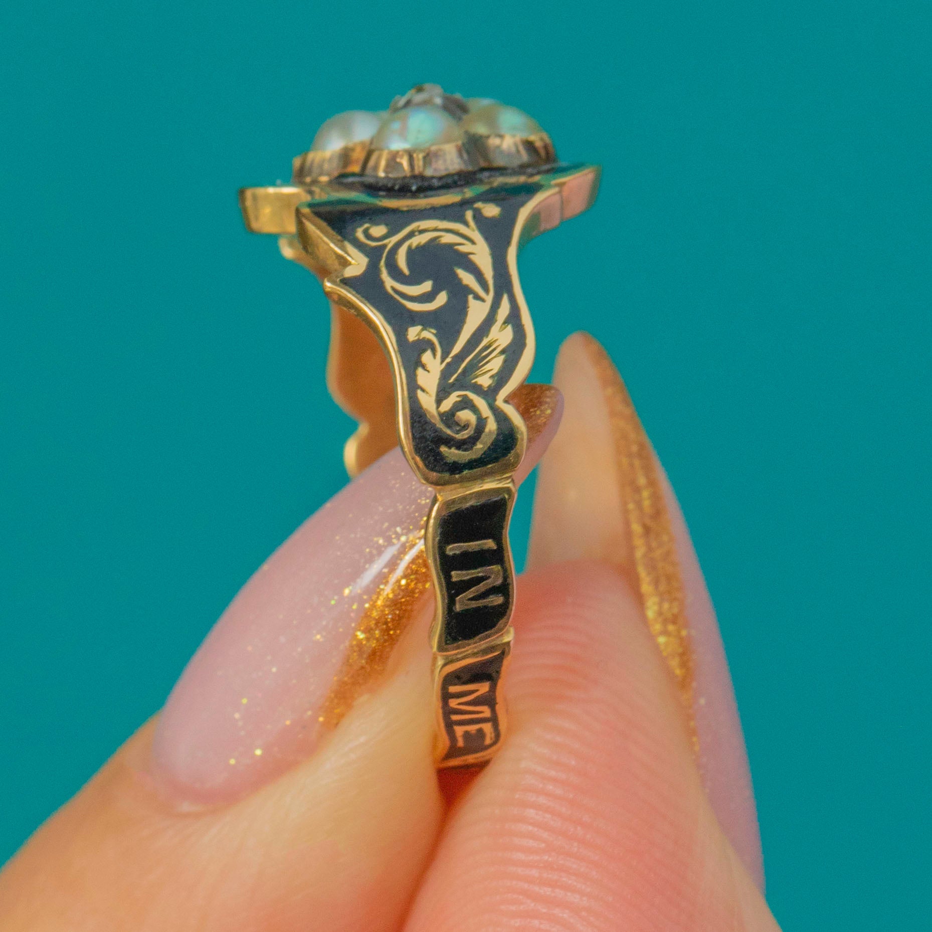 A rare early Victorian mourning ring dated 1846, crafted in rich 18ct Gold with immaculate Black Enamel reading “IN MEMORY OF”. Set with natural Pearls and a single Diamond, this beautifully preserved jewel captures the sentimentality and elegance of mid-19th century memorial pieces.