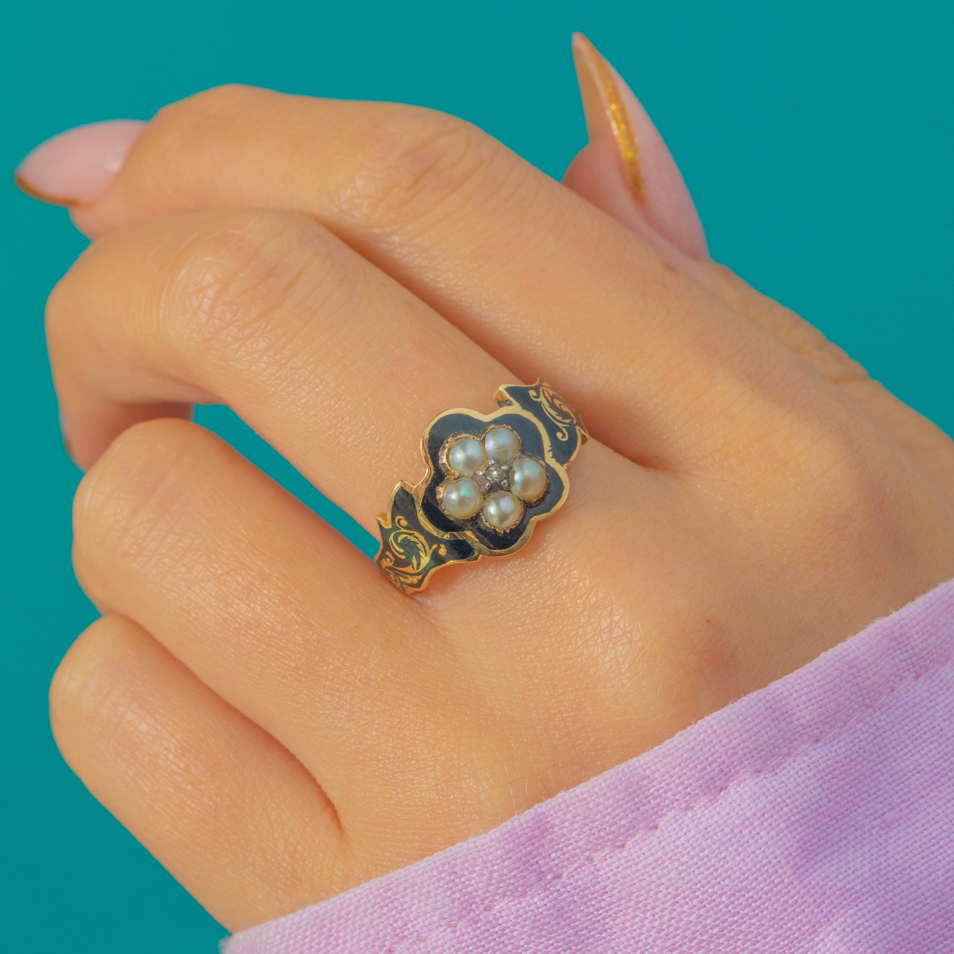EXCELLENT: The Pearls and Diamond are secure and in excellent condition with no notable abrasions. The black Enamel is pristine—exceptionally rare for a mourning ring of this age. There is no inscription to the interior. The rear compartment glass is no longer present, as is common with early Victorian memorial rings, but the ring remains strong and beautifully preserved.