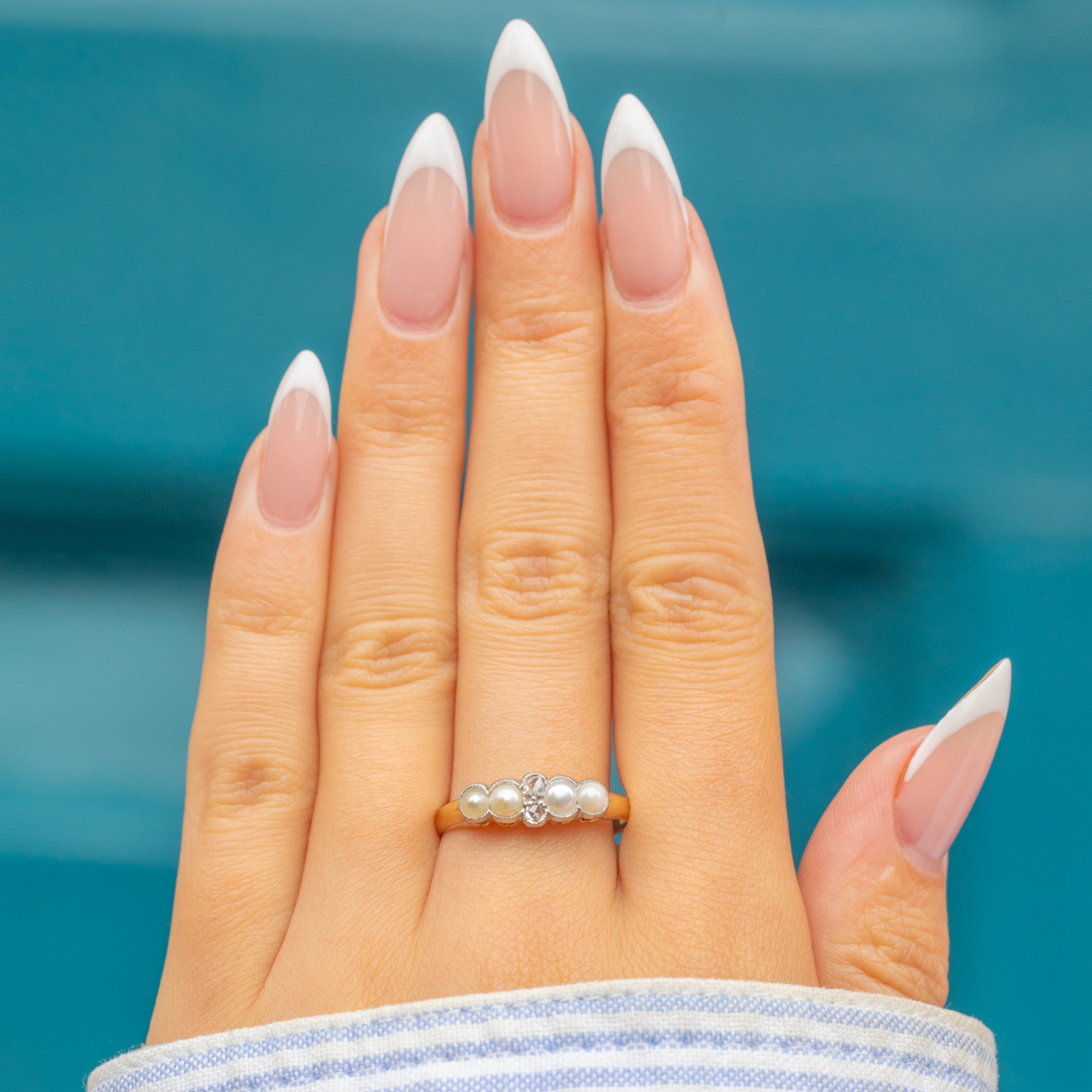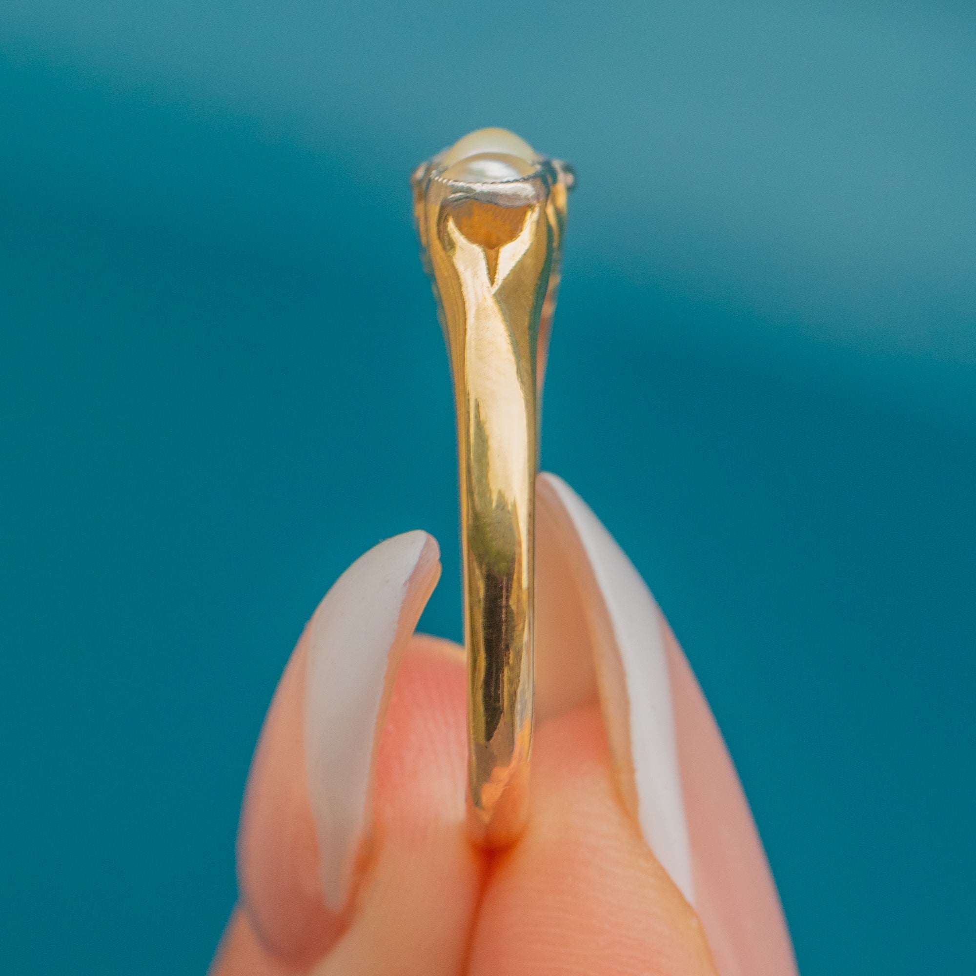 The four Pearls are neatly matched and display a beautiful soft sheen, while the Diamonds add subtle sparkle at the centre. With its romantic design and delicate proportions, this ring is a timeless treasure from the Victorian era.