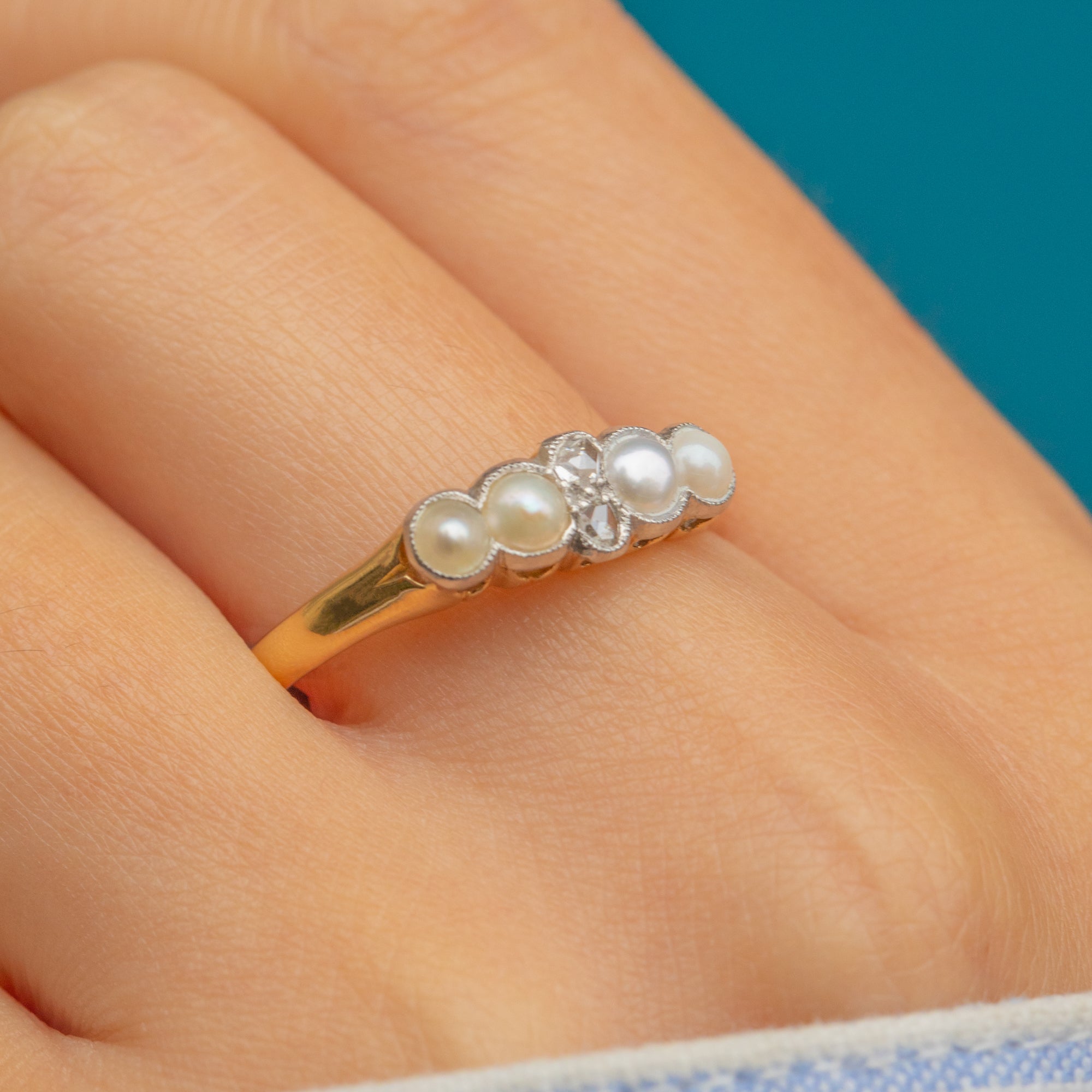 This Victorian ring is crafted in 18ct Gold and set with lustrous Pearls and twinkling rose-cut Diamonds.