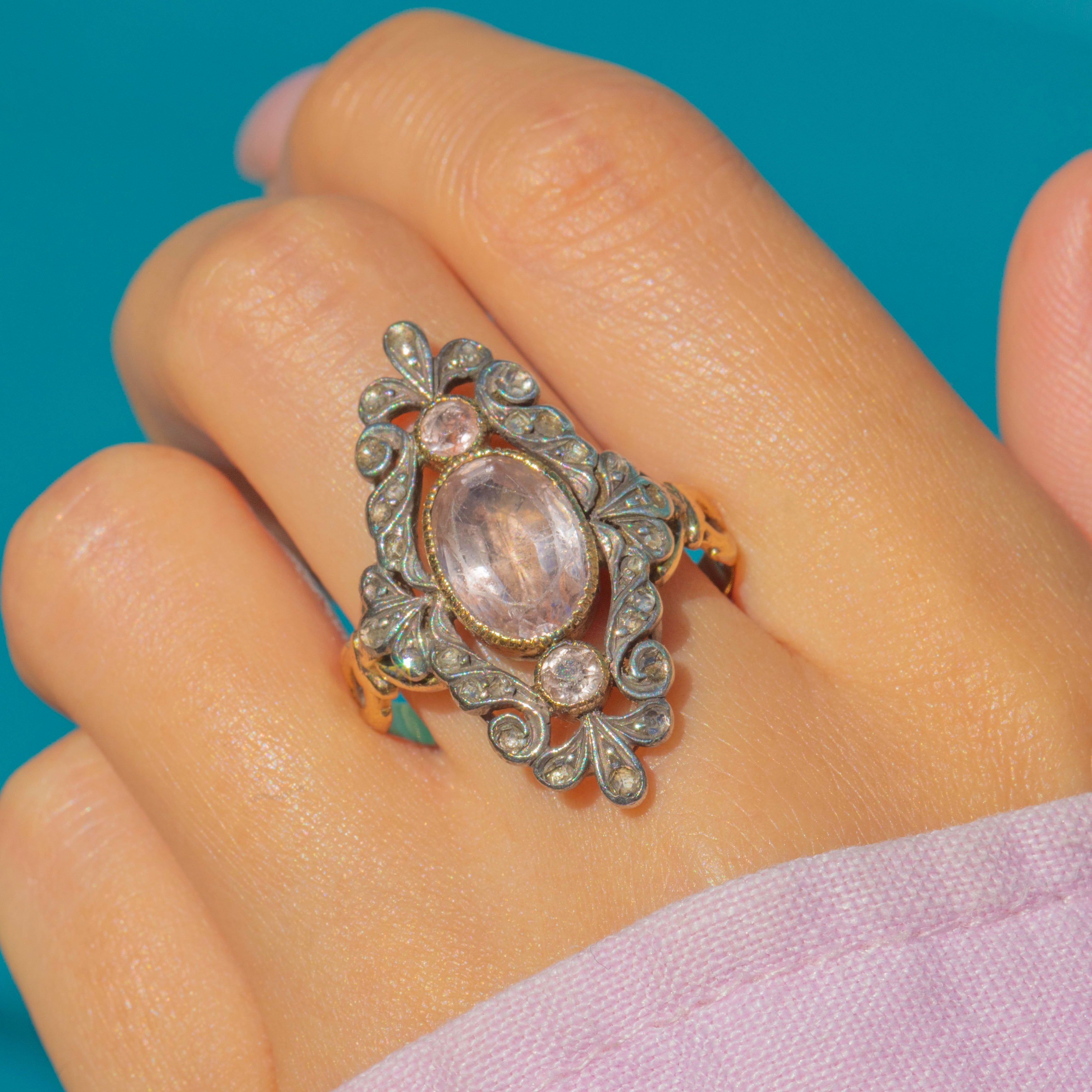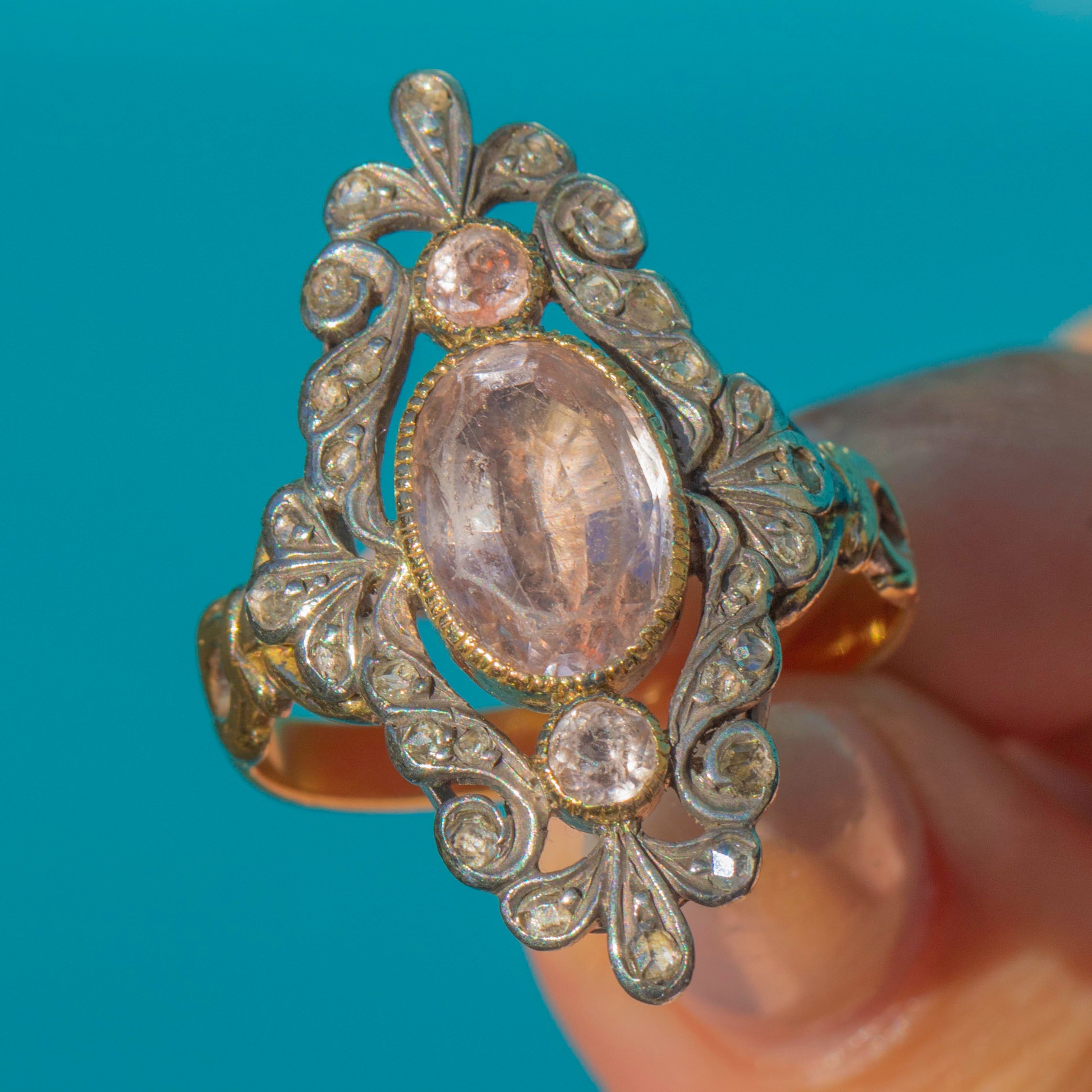 This ornate Victorian Pink Topaz and Rose-cut Diamond ring is a masterpiece! Crafted in 18ct Gold with typical Silver settings, it's designed with a richly decorative openwork face and a flattering navette or "little boat" shape. At the centre sits three pretty Pink Topaz framed with twinkling old-cut Diamonds set in crimped Silver. The ring face extends an impressive 30mm long, creating a striking and distinctive silhouette on the finger.