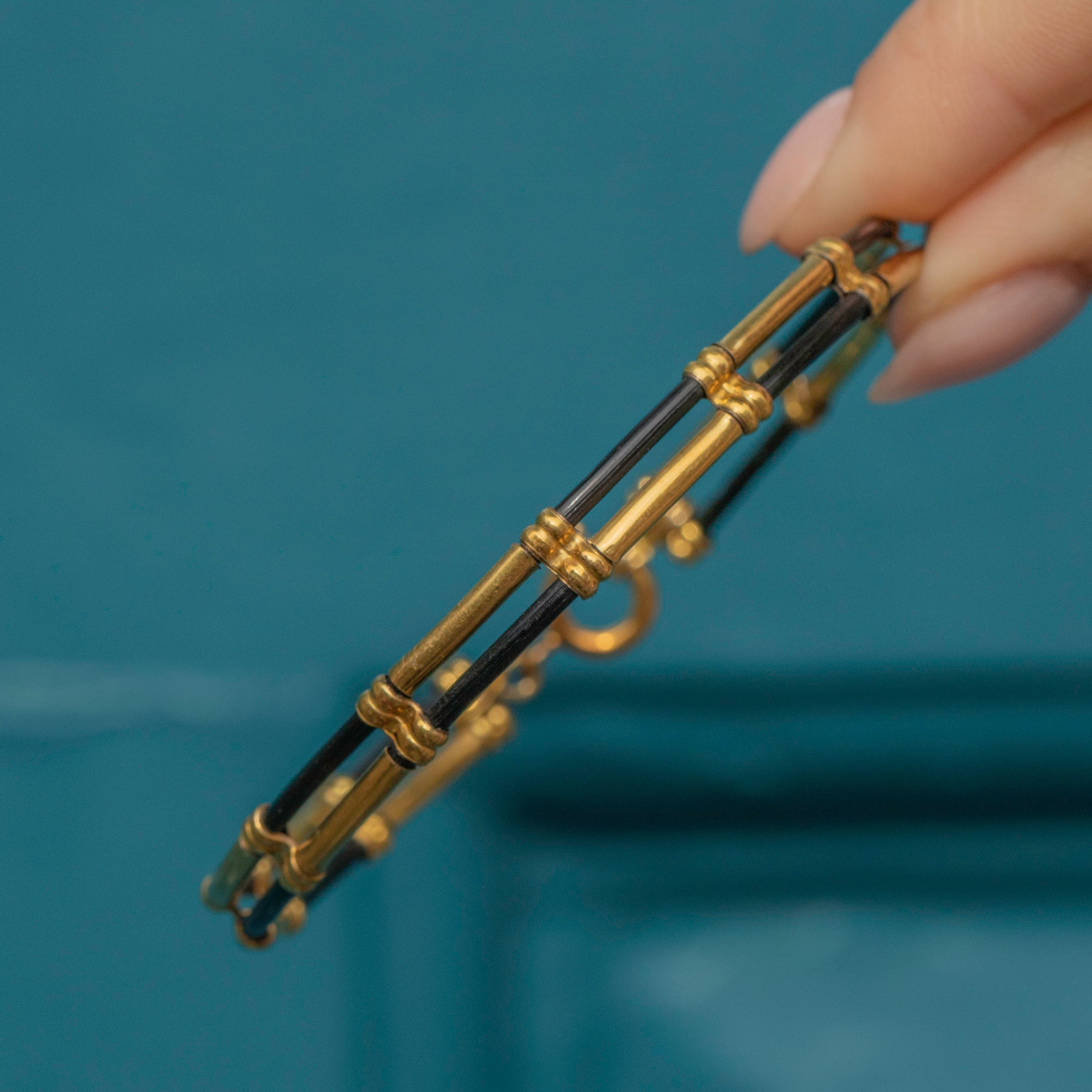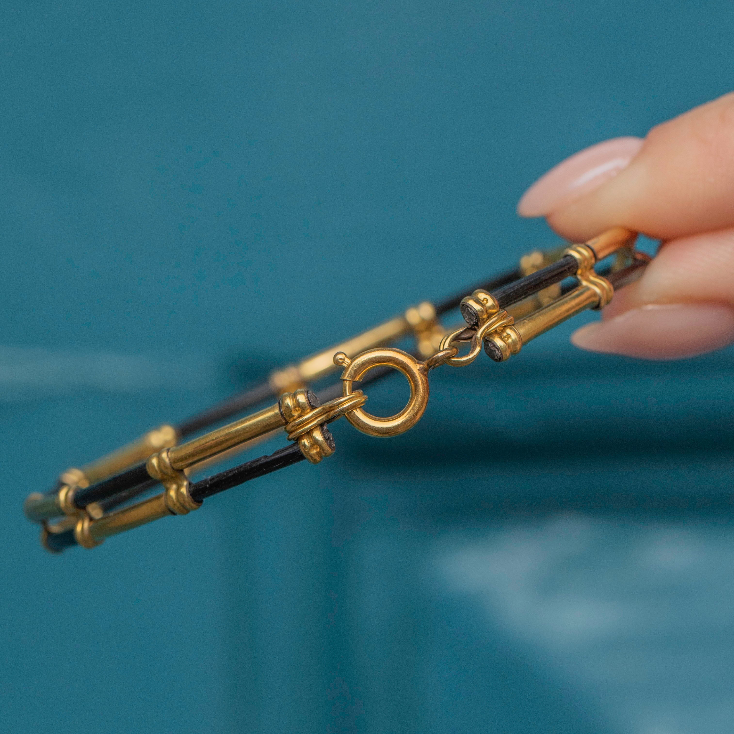 We are in love with this Victorian 18ct Gold plated elephant hair bangle! The antique bangle is a 18ct Gold plated Gold band and a strand of elephant hair joined by 18ct Gold plated crimp connectors! Elephant hair jewellery became very popular in the 19th century and we can certainly see why!