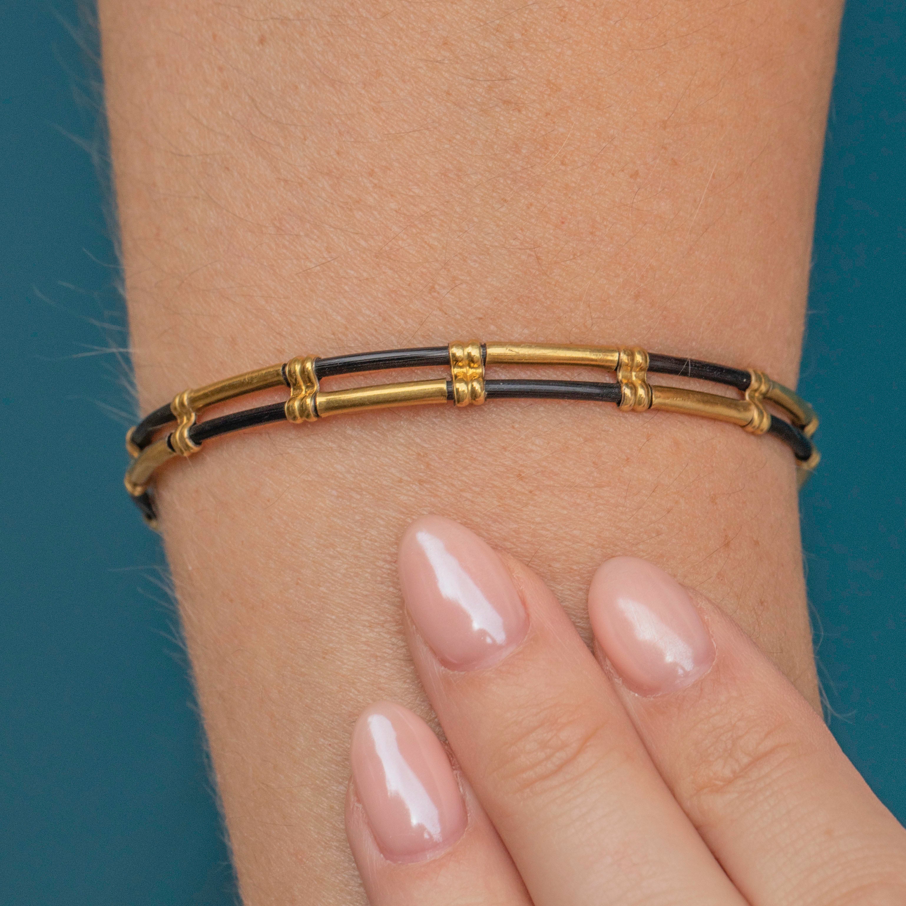The single strand was taken from the elephants tail, and wrapped in Gold. Elephant jewellery is seen to prevent illness and harm and well as bring love and luck! She can be worn on her own or in a stack! Bring the safari to your jewellery box and have a bangle that is totally magical!