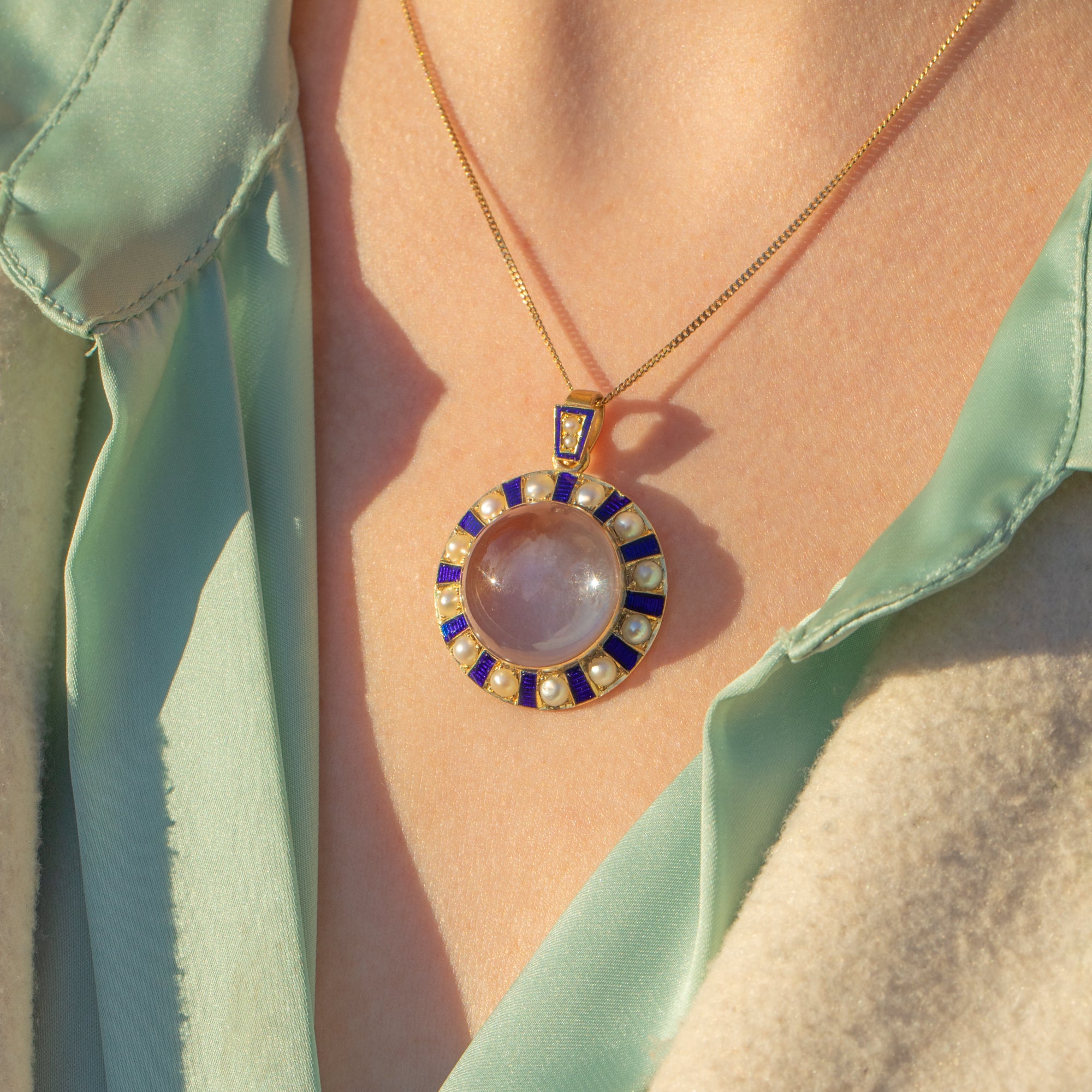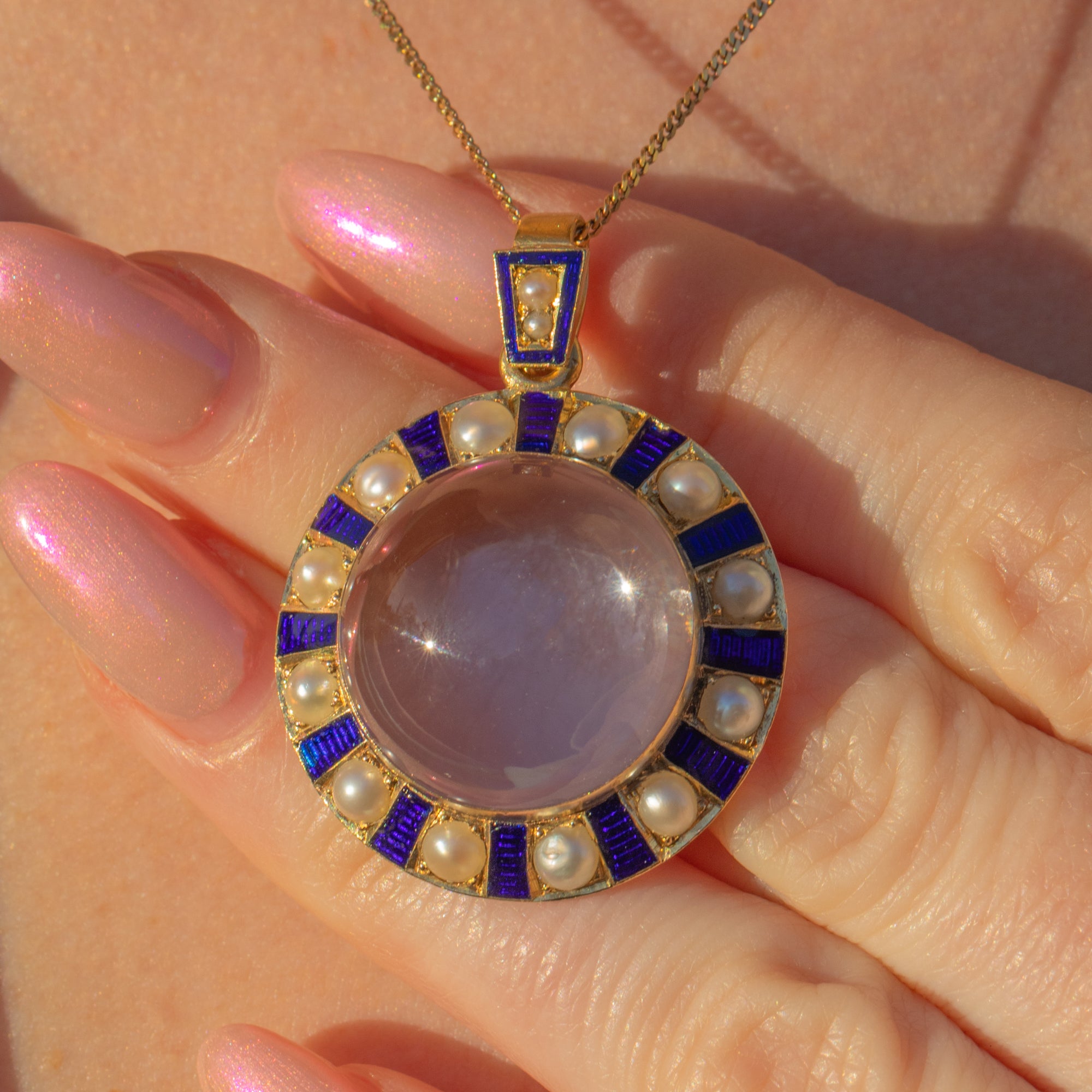 Crafted from lustrous 18ct Gold, this antique pendant features a plump Quartz at her centre. Her round Rock crystal is beautifully translucent, even functioning as a locket if you so desire. She is adorned by a halo of interchanging iridescent Pearls and blue Enamel, arranged in a wonderfully unique pattern, with each gemstone catching the light wonderfully.