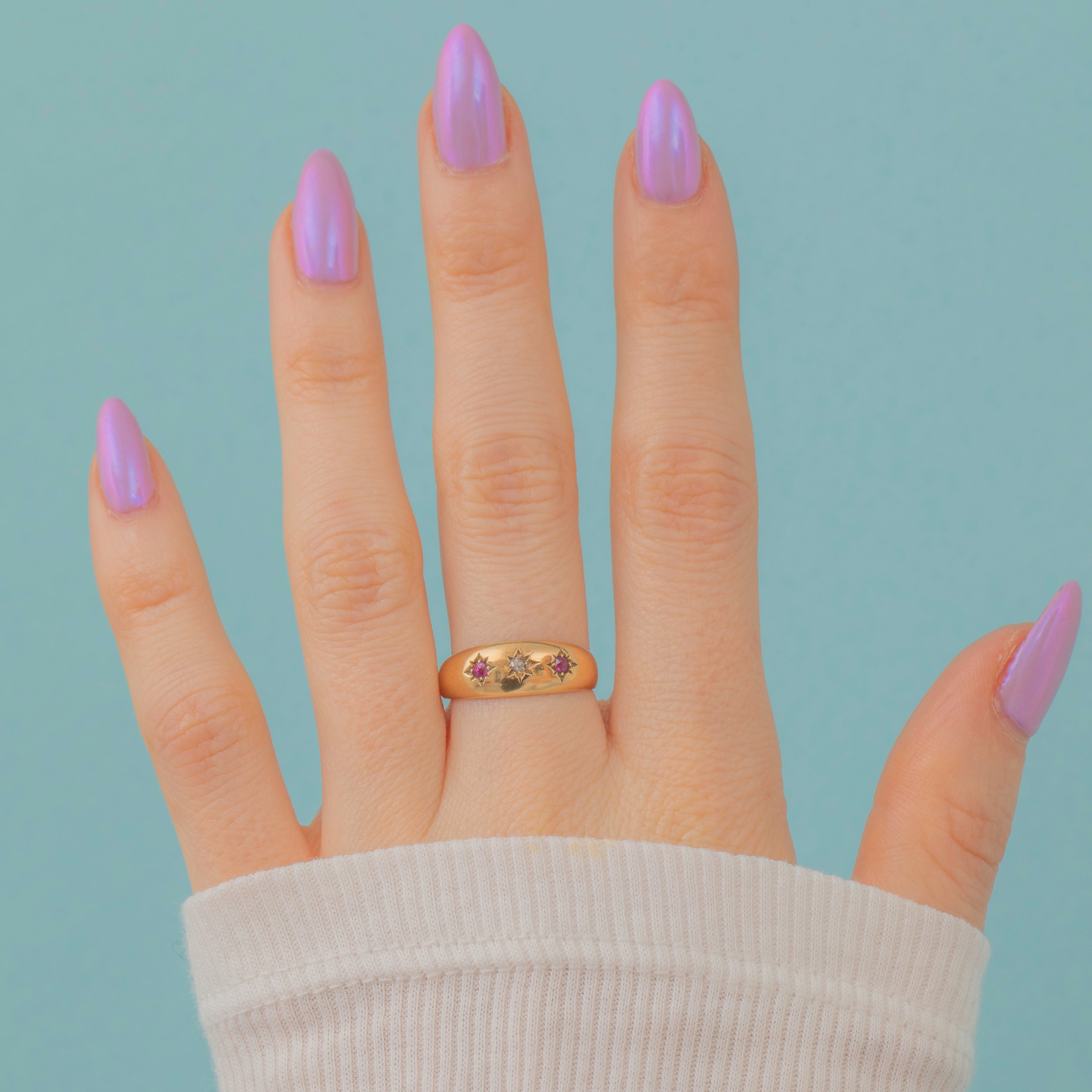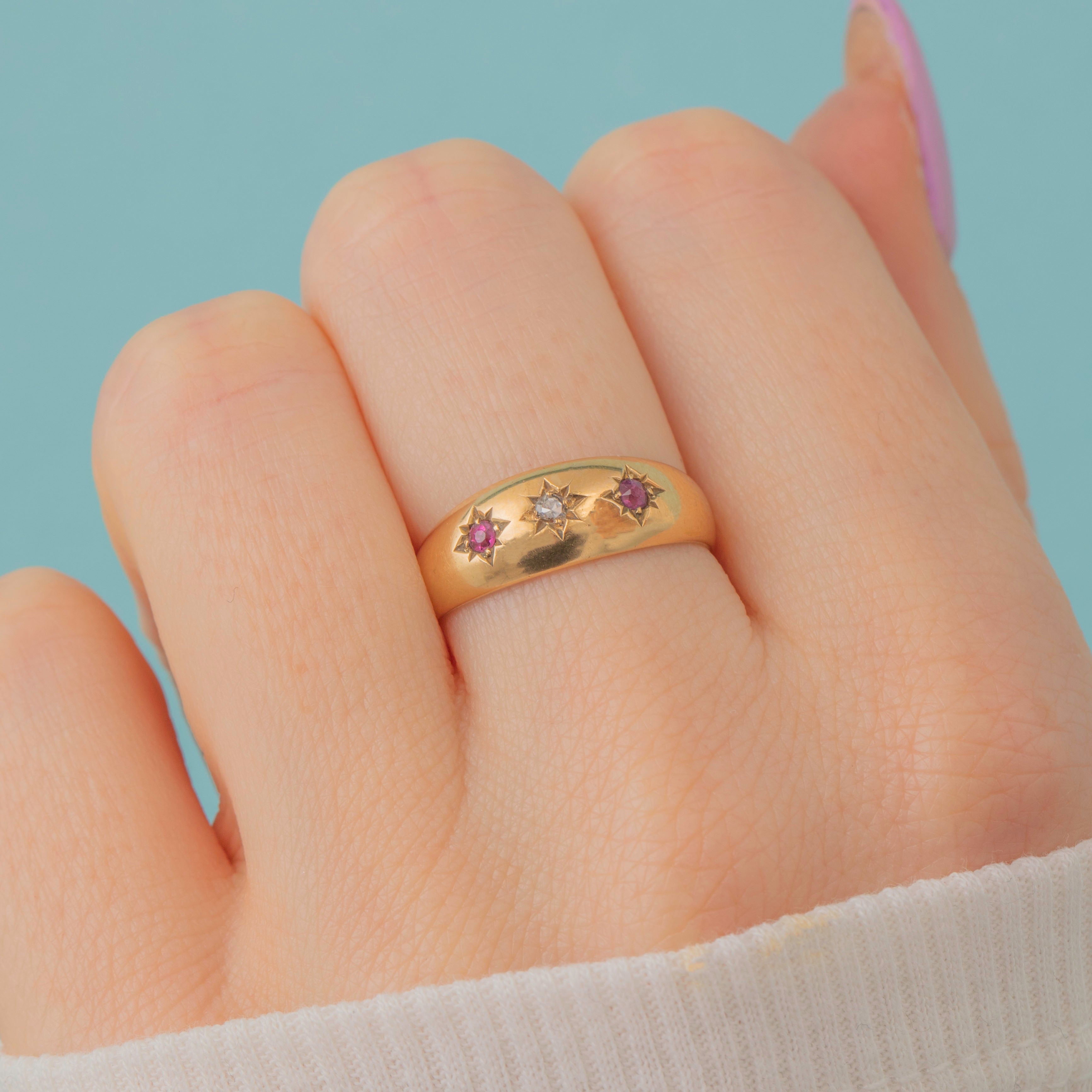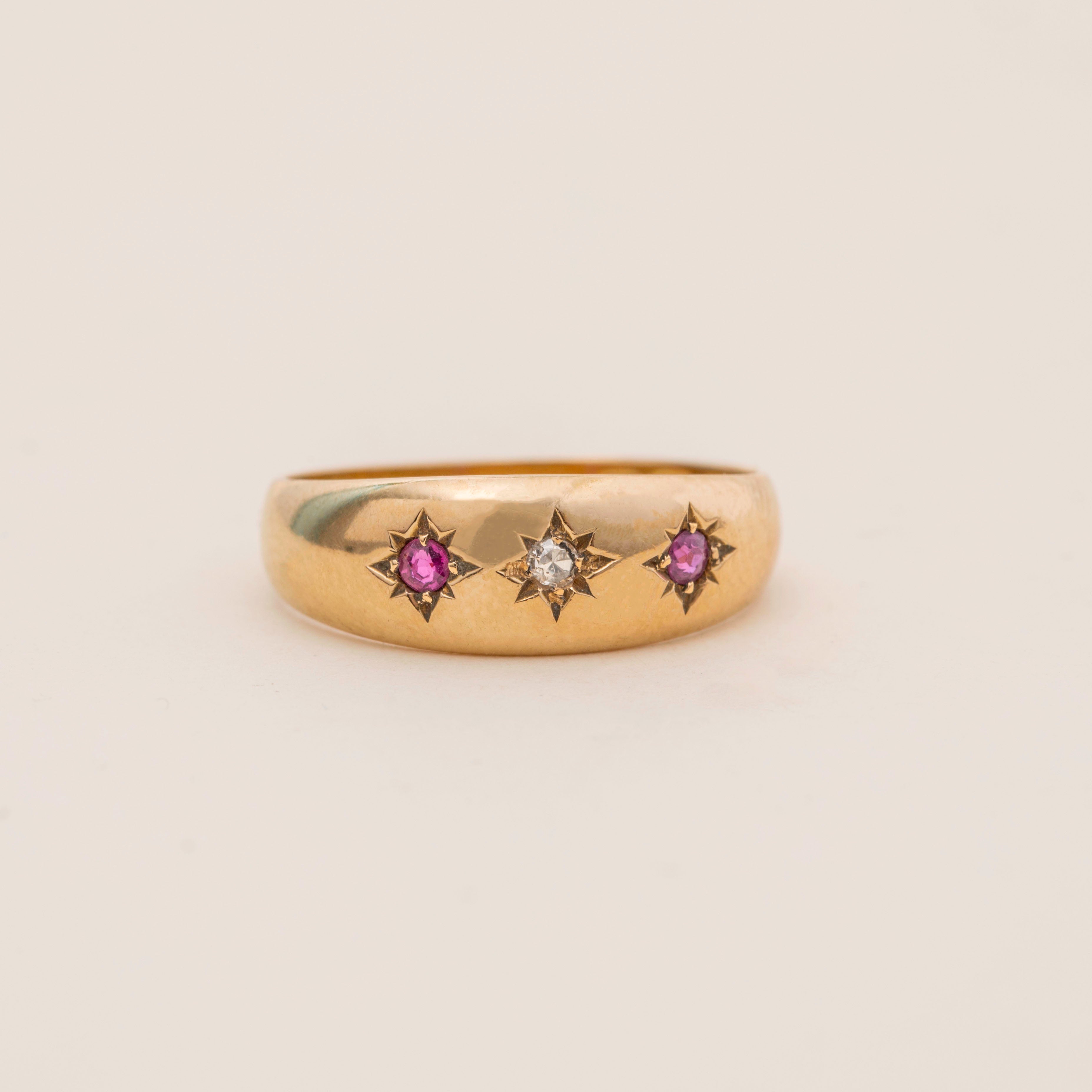 This Victorian gypsy ring boasts three star-set gemstones in her centre, radiating a timeless celestial allure. With Rubies akin to juicy raspberries flanking a twinkling white Diamond, this ring is a timeless piece of Victorian jewellery that you will treasure for years to come!