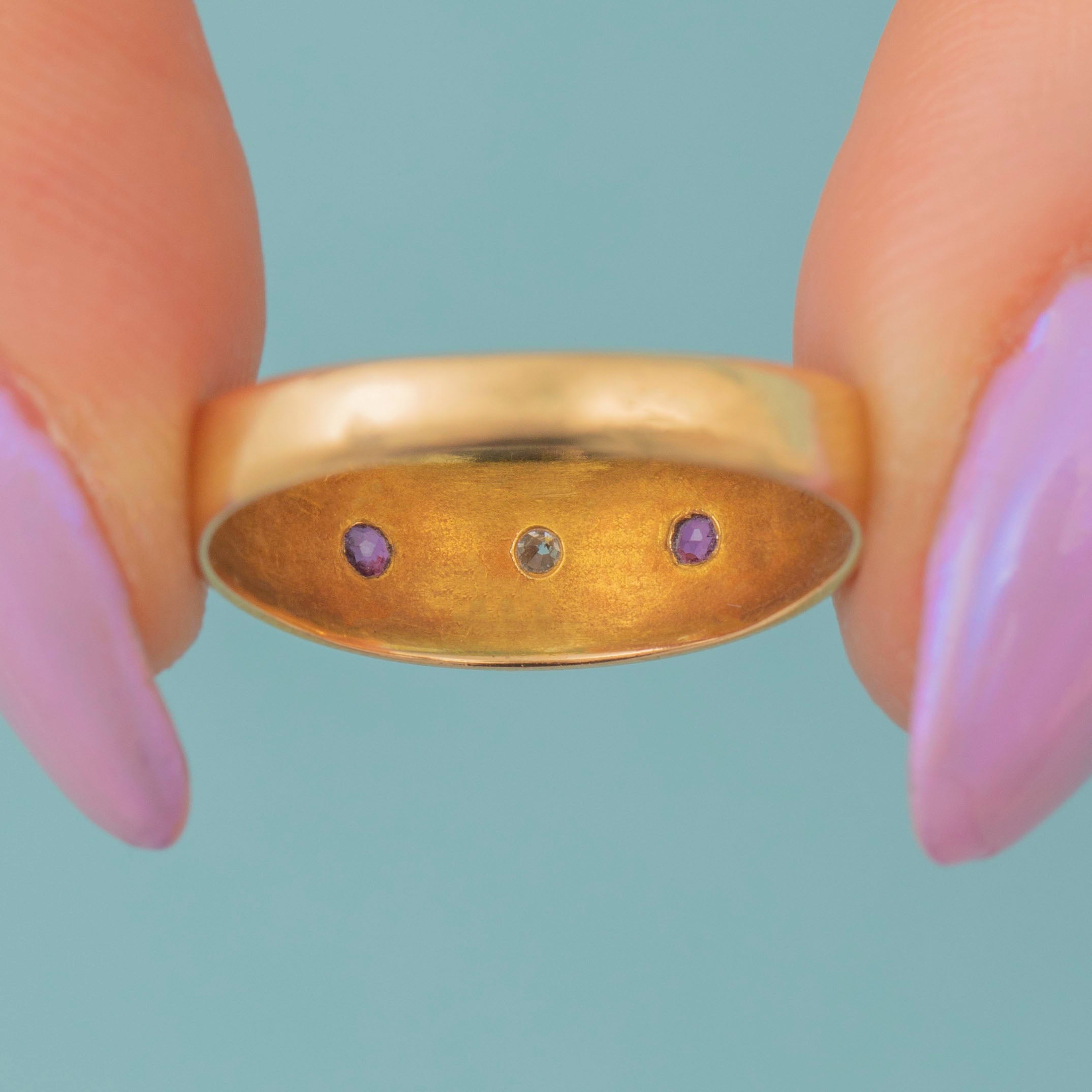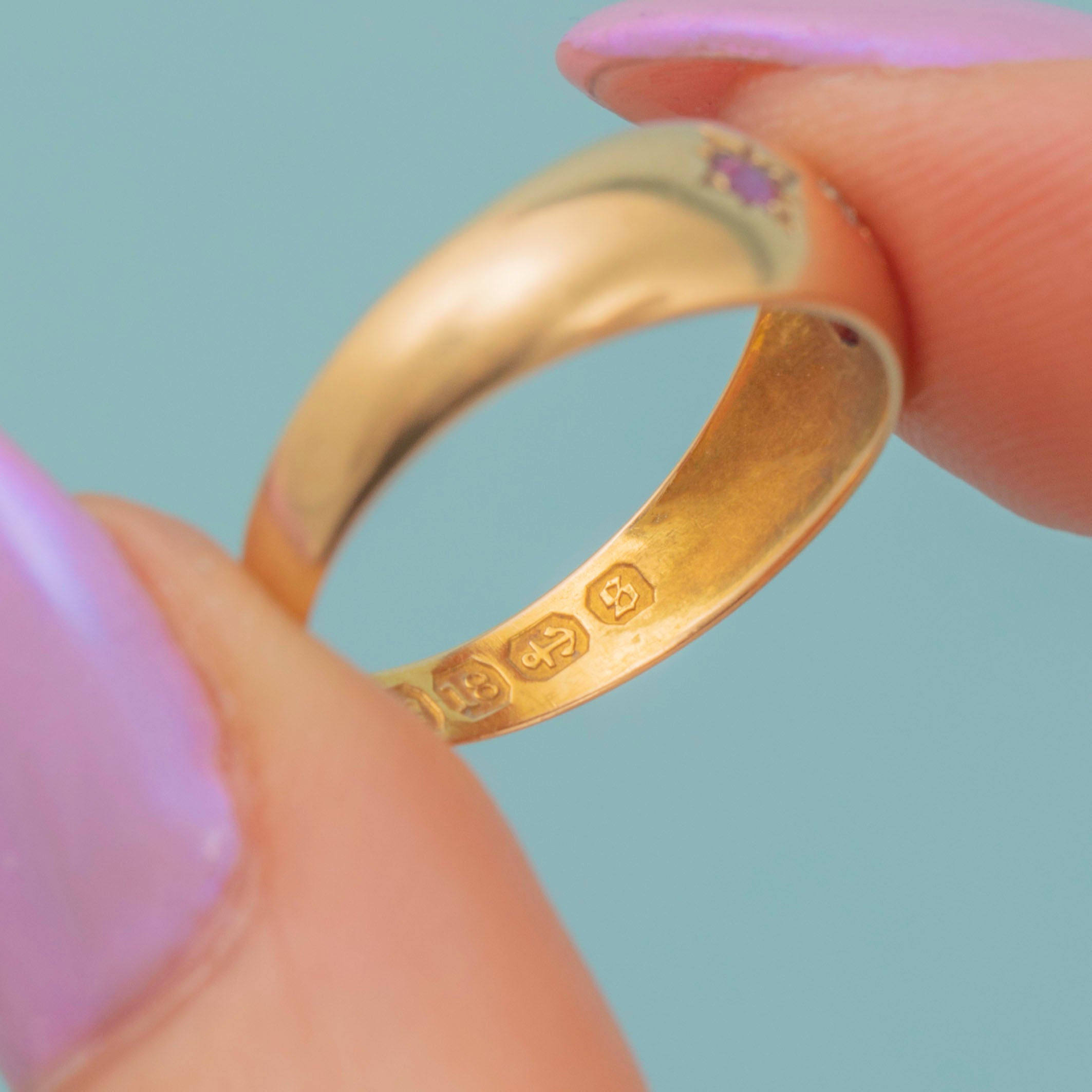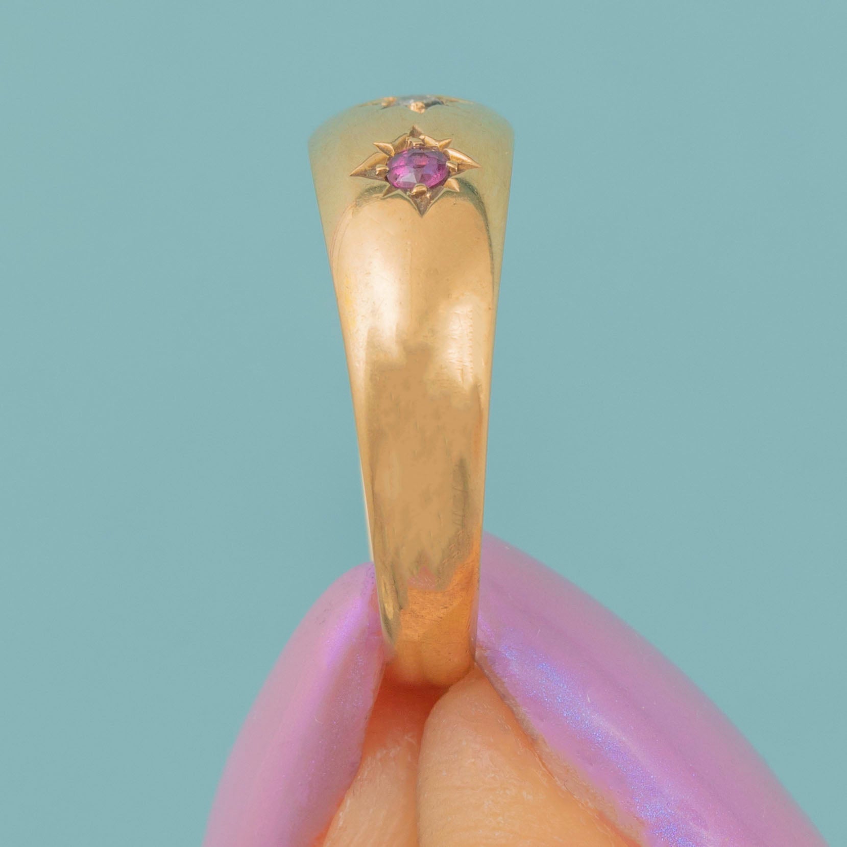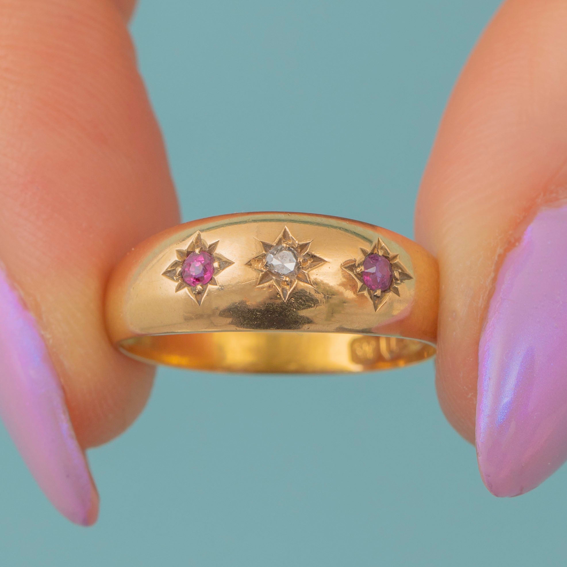 VERY GOOD-EXCELLENT: This Victorian 18ct Gold Ruby Diamond gypsy ring is in superb condition. Her gemstones are radiant and secure within their star settings. There are minor signs of wear to the Gold, including some small pinprick marks to the front, however this is difficult to spot without a jeweller's loupe. The band comes complete with a full set of English hallmarks dating to 1892, making this Victorian gypsy ring a coveted piece!