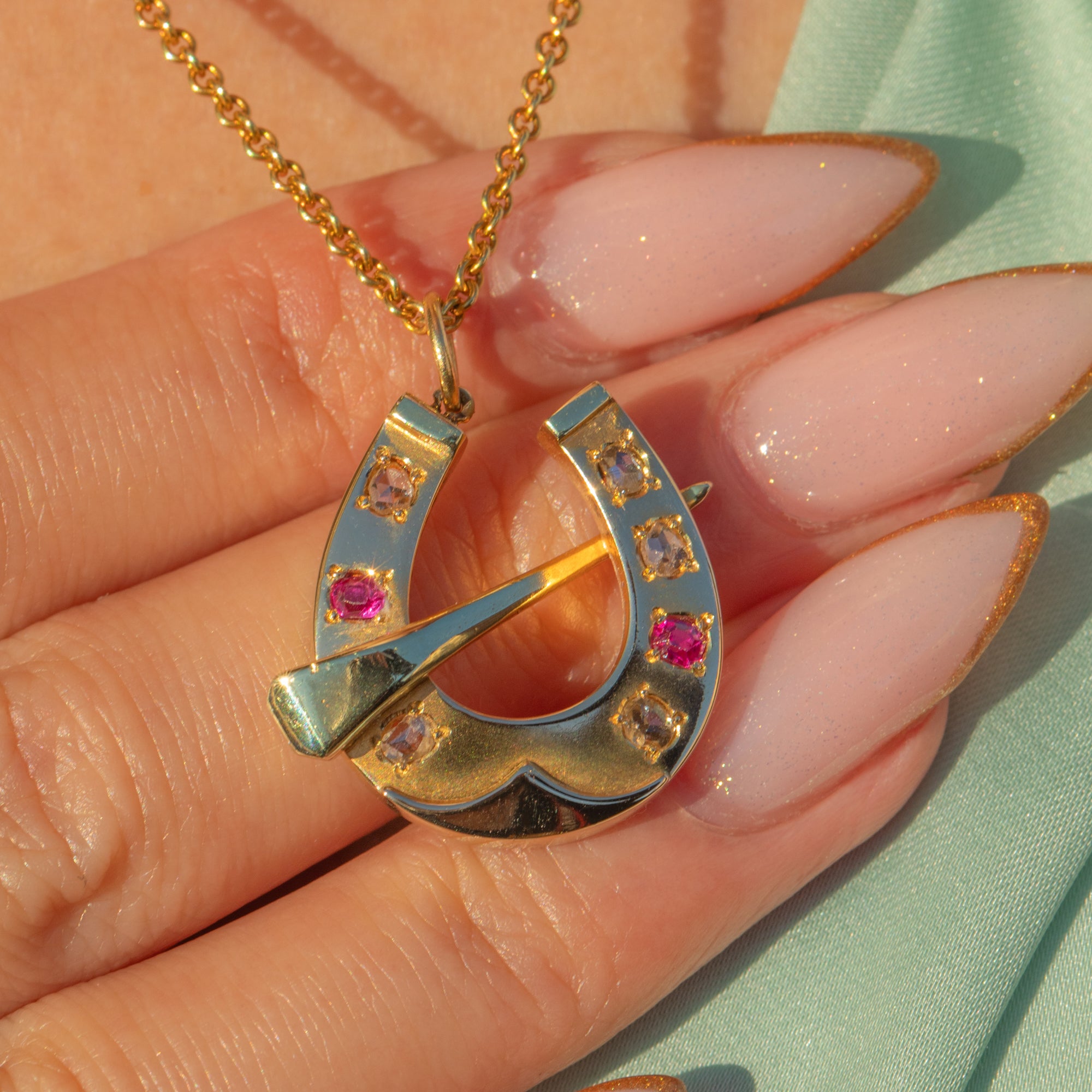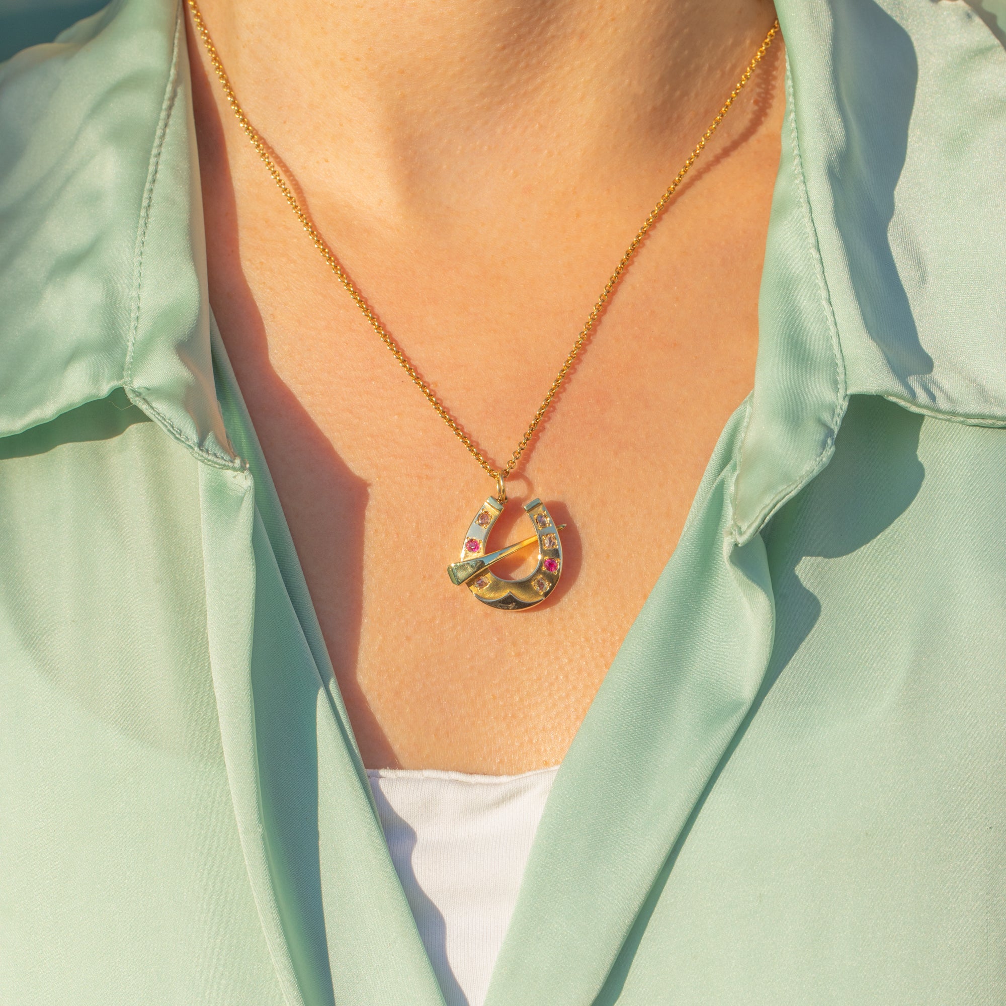 A sumptuous and beautifully made Victorian horseshoe pendant, crafted in heavy solid 18ct Gold and set with bright Rubies and sparkling rose-cut Diamonds. This is a luxurious example of the classic Victorian good-luck motif — richly coloured, wonderfully weighty, and full of antique character.