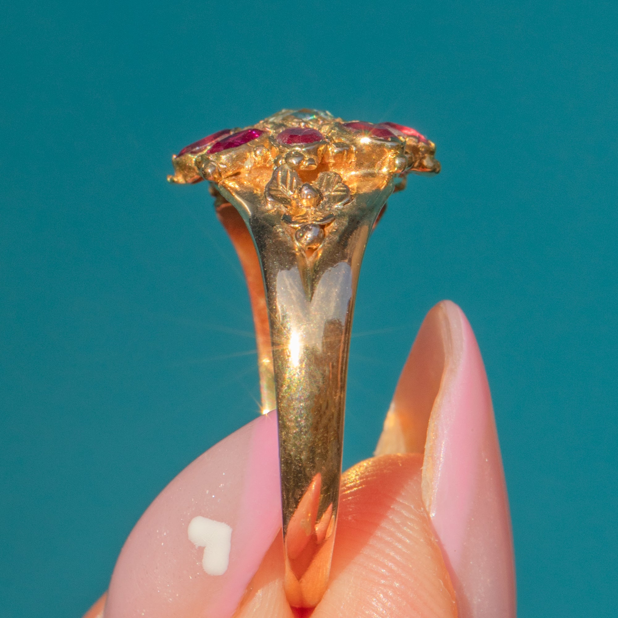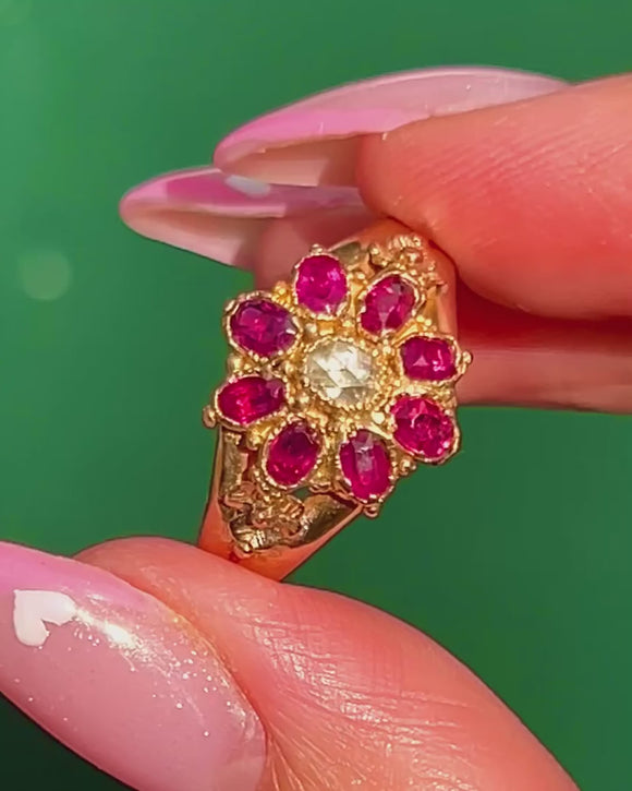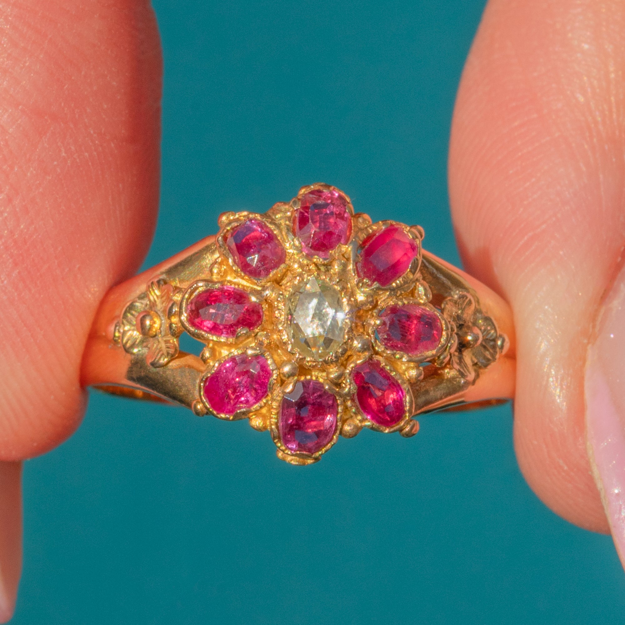 Victorian 18ct Gold Ruby & Rose Cut Diamond Flower Cluster Ring