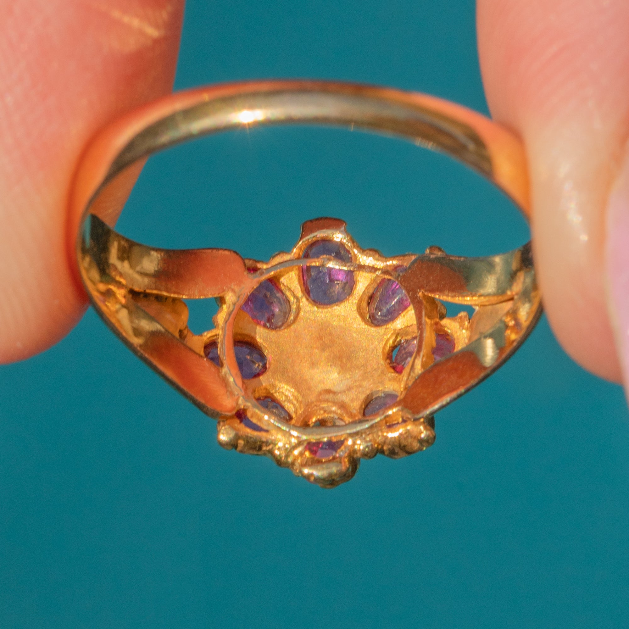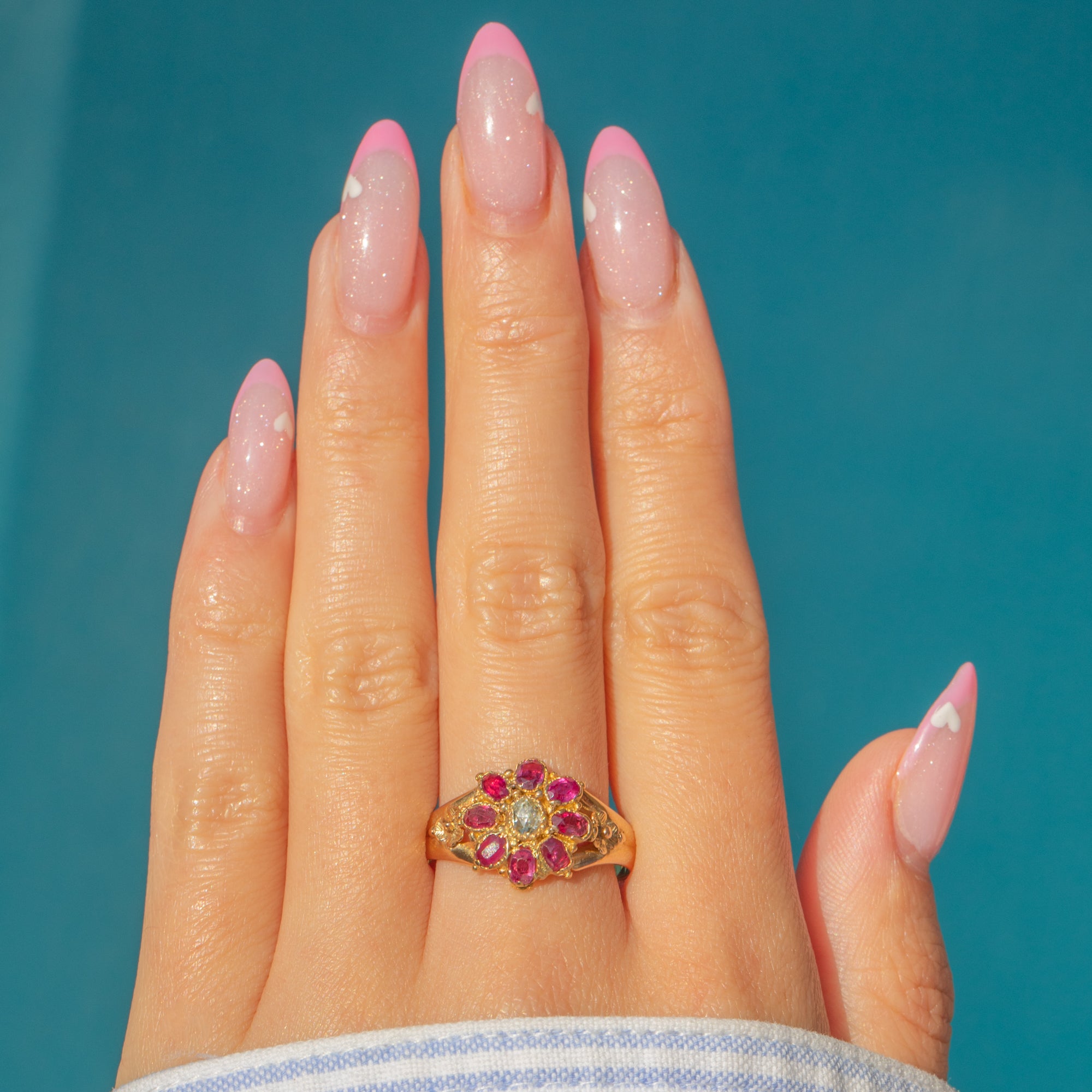 Crafted in rich 18ct Gold, the fiery Rubies provide a striking contrast, enhancing the Diamond’s glow. A timeless daisy-style design that captures the beauty and craftsmanship of the late Victorian era, perfect as a unique engagement ring or a statement of antique elegance.