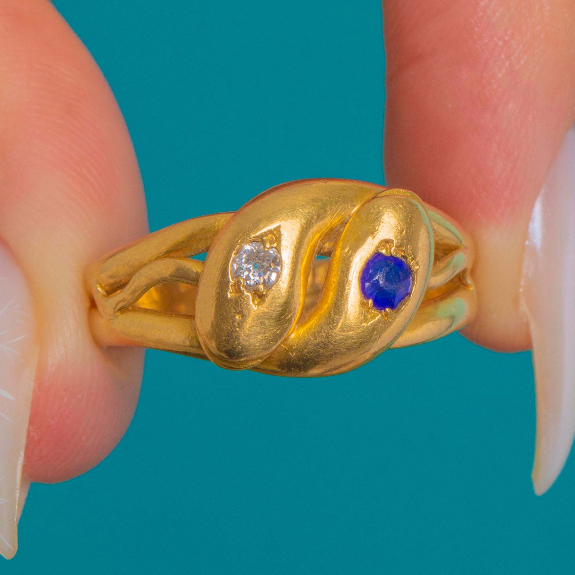 A quintessential Victorian treasure, this entwined double-snake ring is crafted in rich 18ct Gold. Two smooth serpent heads meet in a graceful bypass, each gypsy-set with a deep blue Sapphire on one, the other with a bright Diamond. The low, sculptural profile and split shoulders taper elegantly into a plain shank for a sleek, comfortable fit.