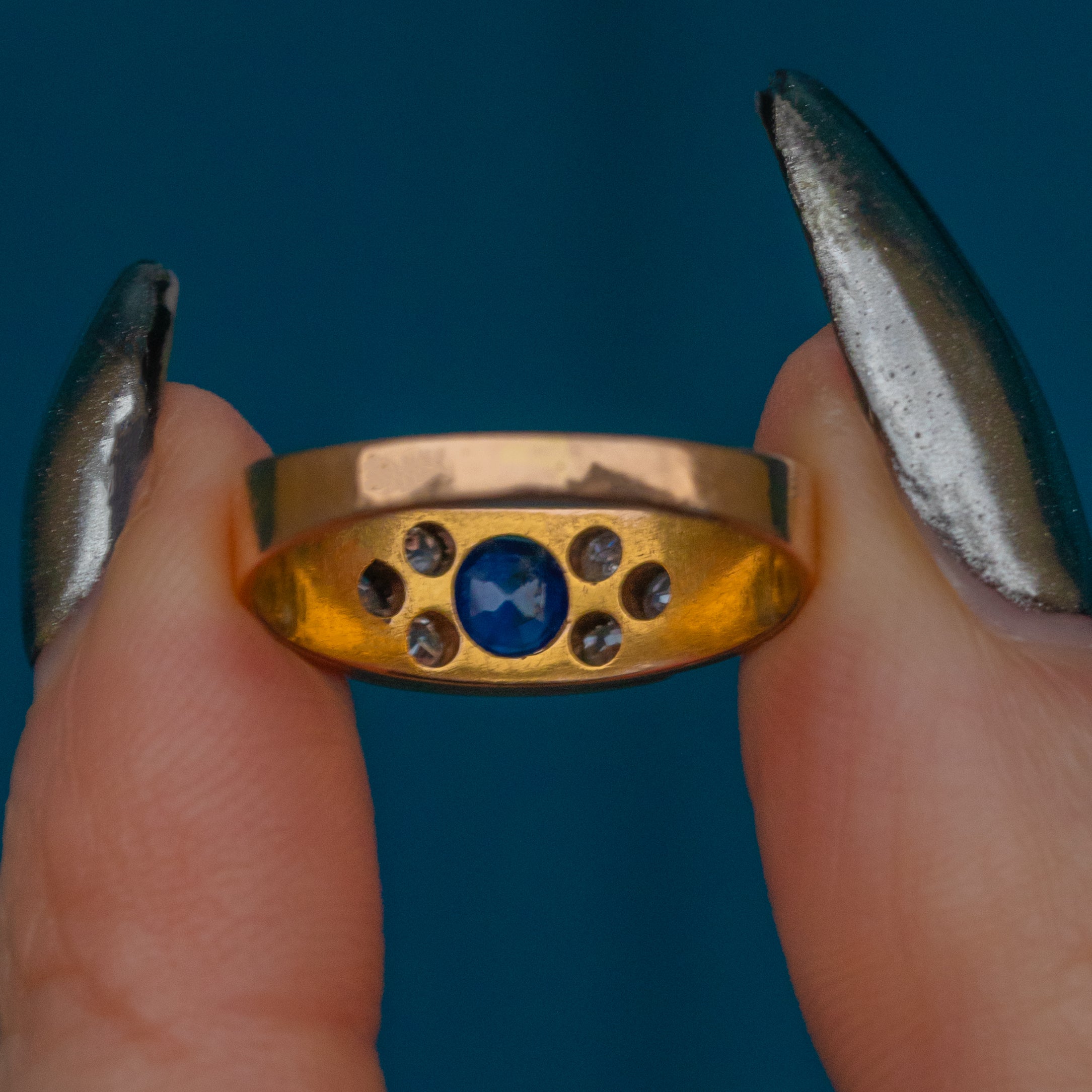 Victorian 18ct Gold Sapphire Diamond Gypsy Ring, c.1892