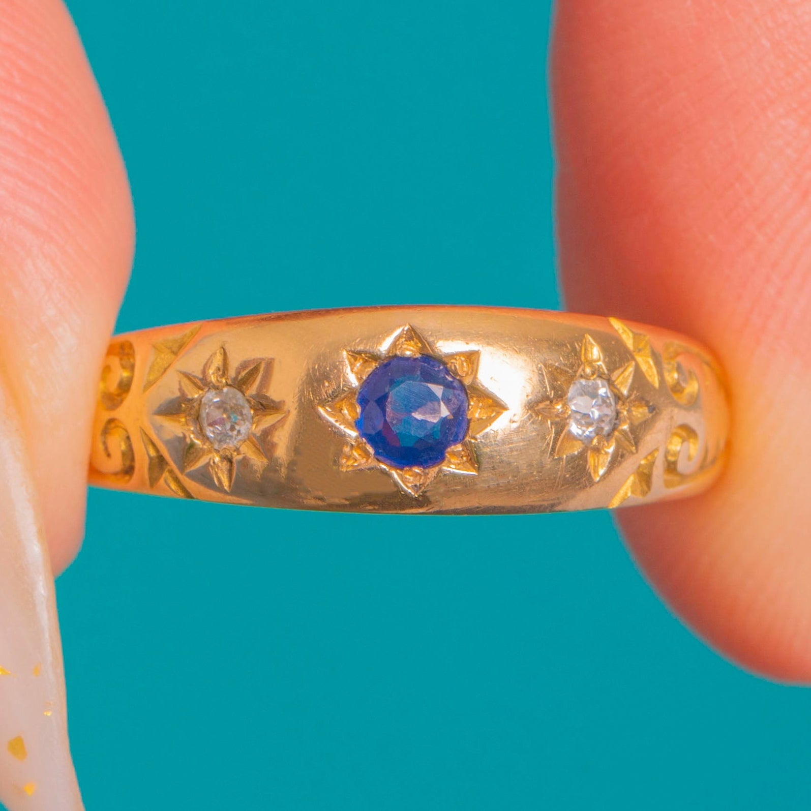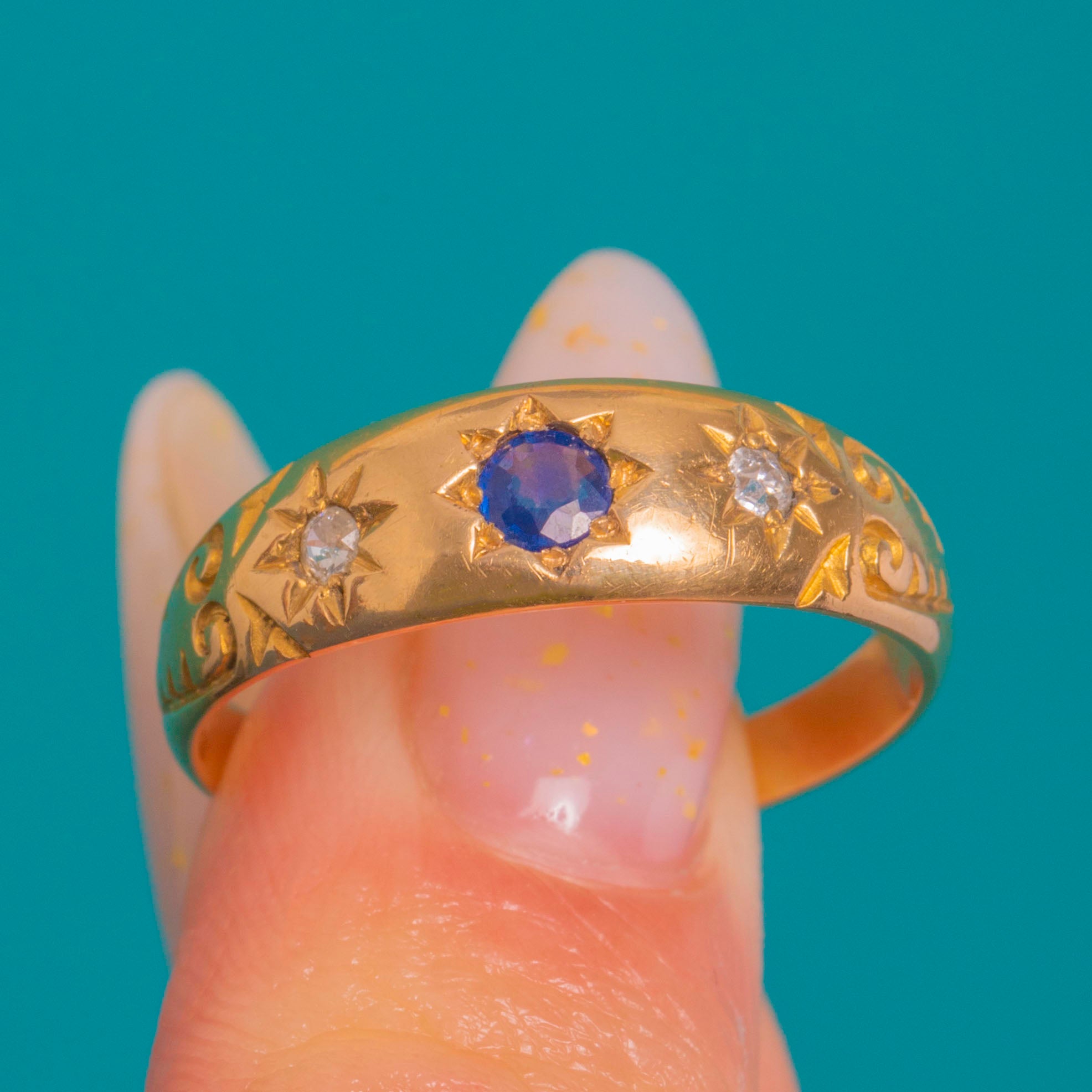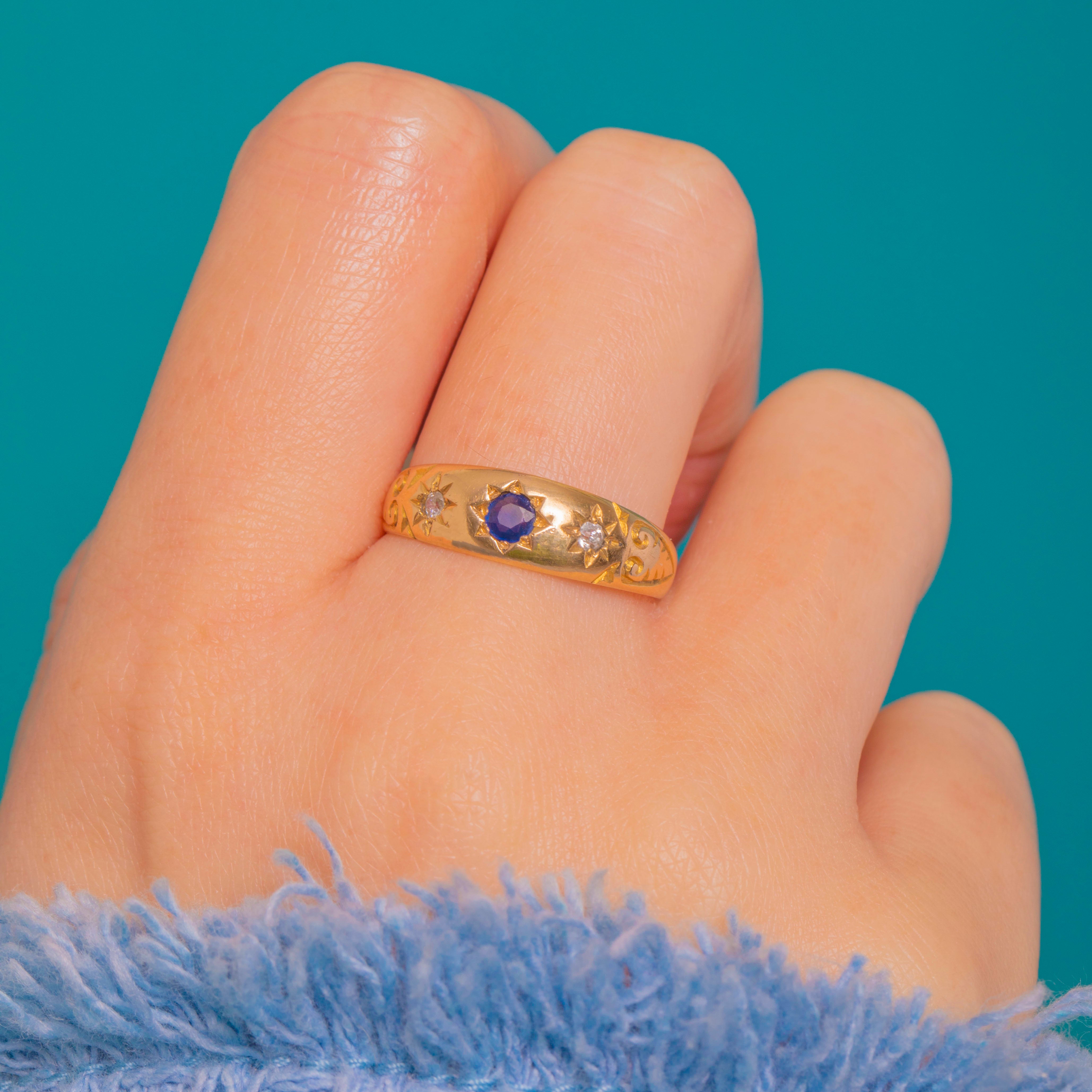 A quintessential late Victorian gypsy ring in rich 18ct Gold, star-set with a deep blue round Sapphire flanked by sparkling round Diamonds. The smoothly domed band glides on the finger with a low, comfortable profile, while crisp eight-point starbursts and hand-engraved scroll and foliate motifs along the shoulders add celestial charm and refined detail.