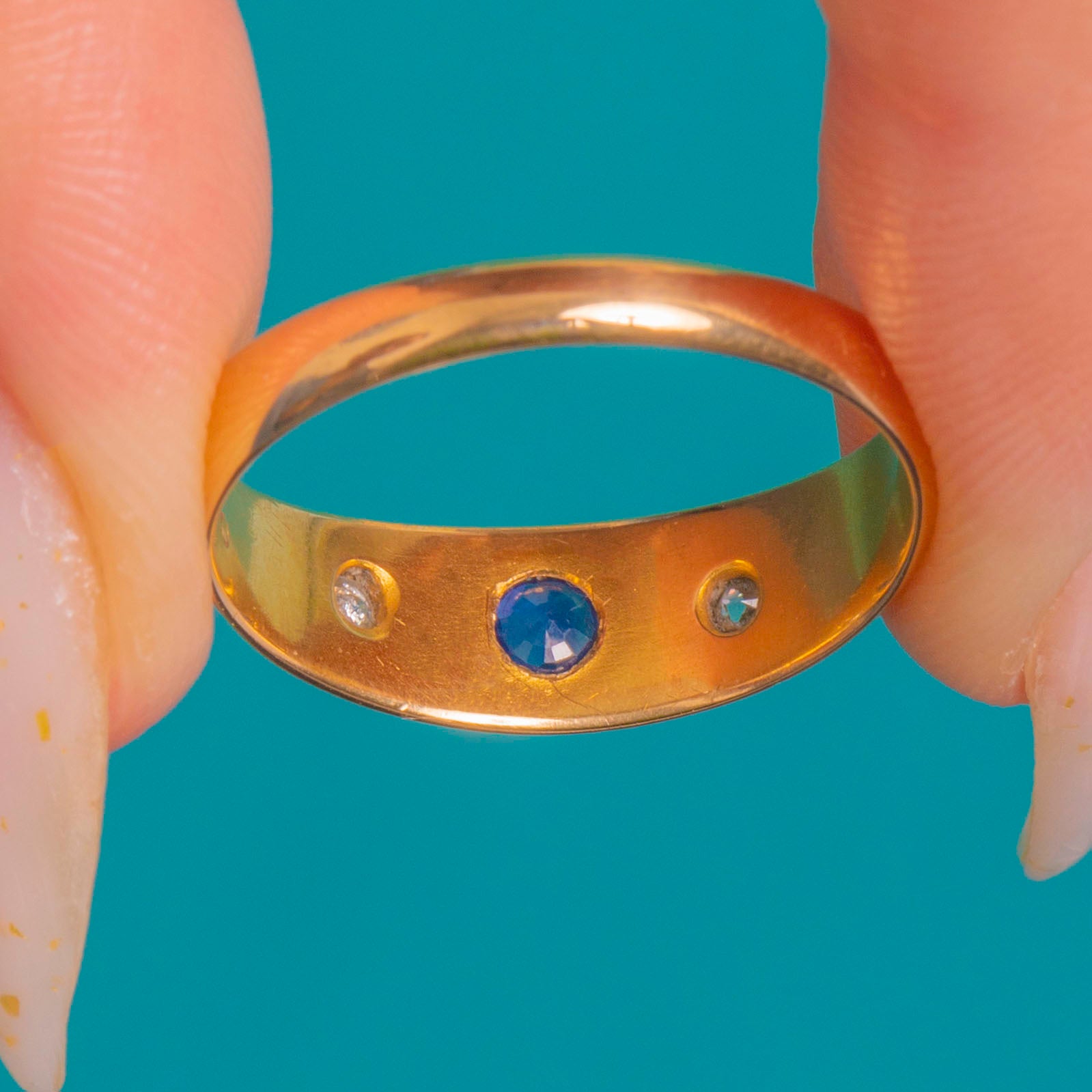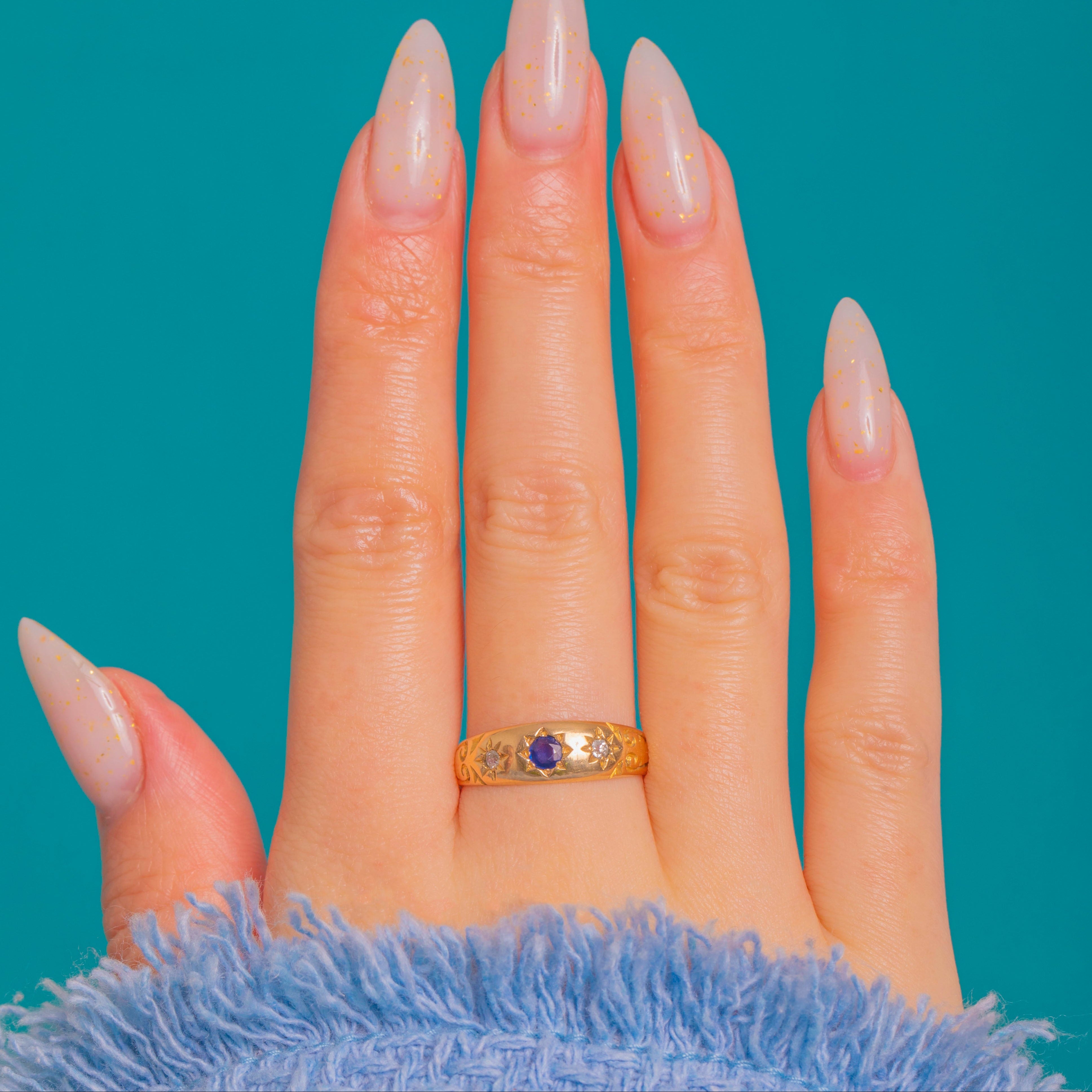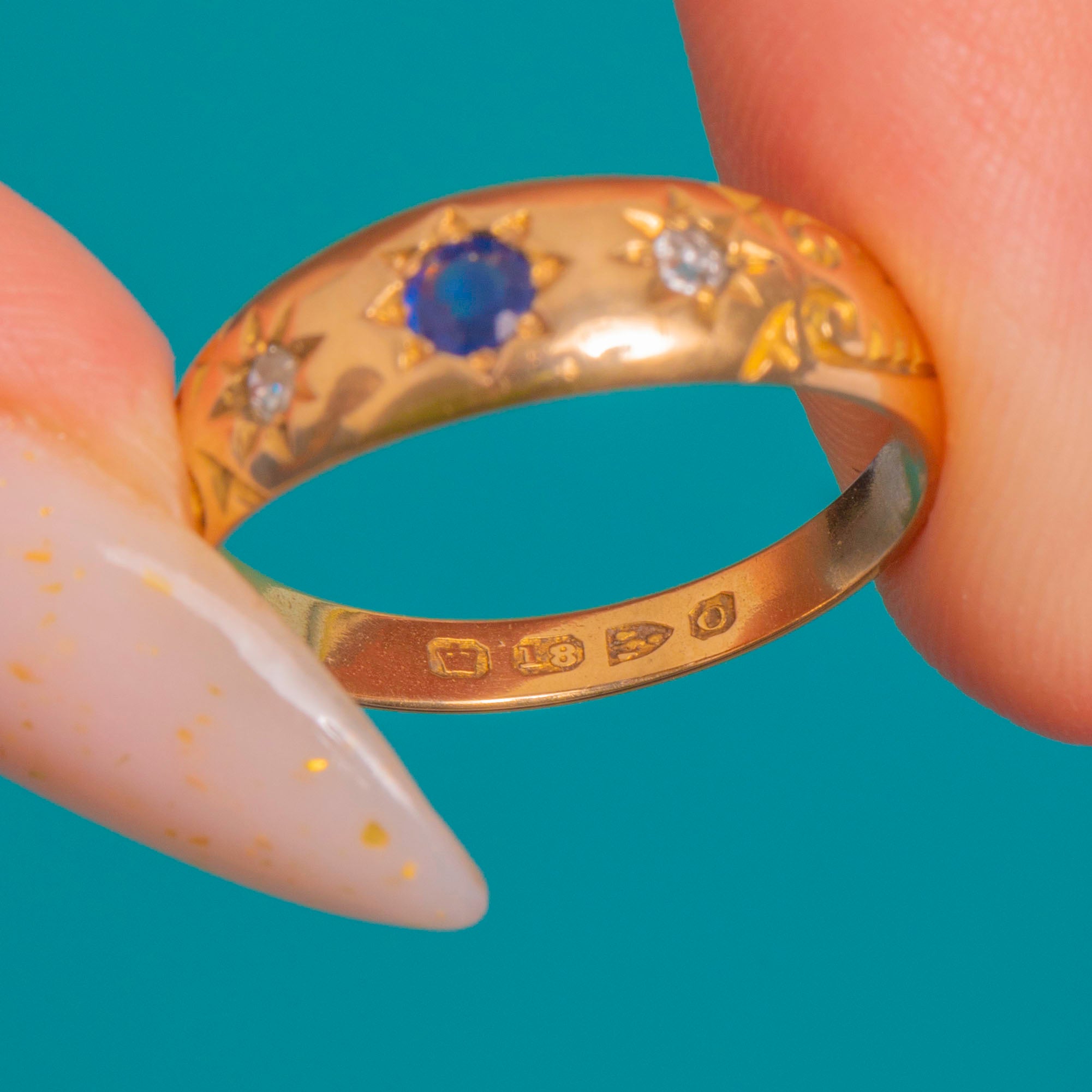 A quintessential late Victorian gypsy ring in rich 18ct Gold, star-set with a deep blue round Sapphire flanked by sparkling round Diamonds. The smoothly domed band glides on the finger with a low, comfortable profile, while crisp eight-point starbursts and hand-engraved scroll and foliate motifs along the shoulders add celestial charm and refined detail.