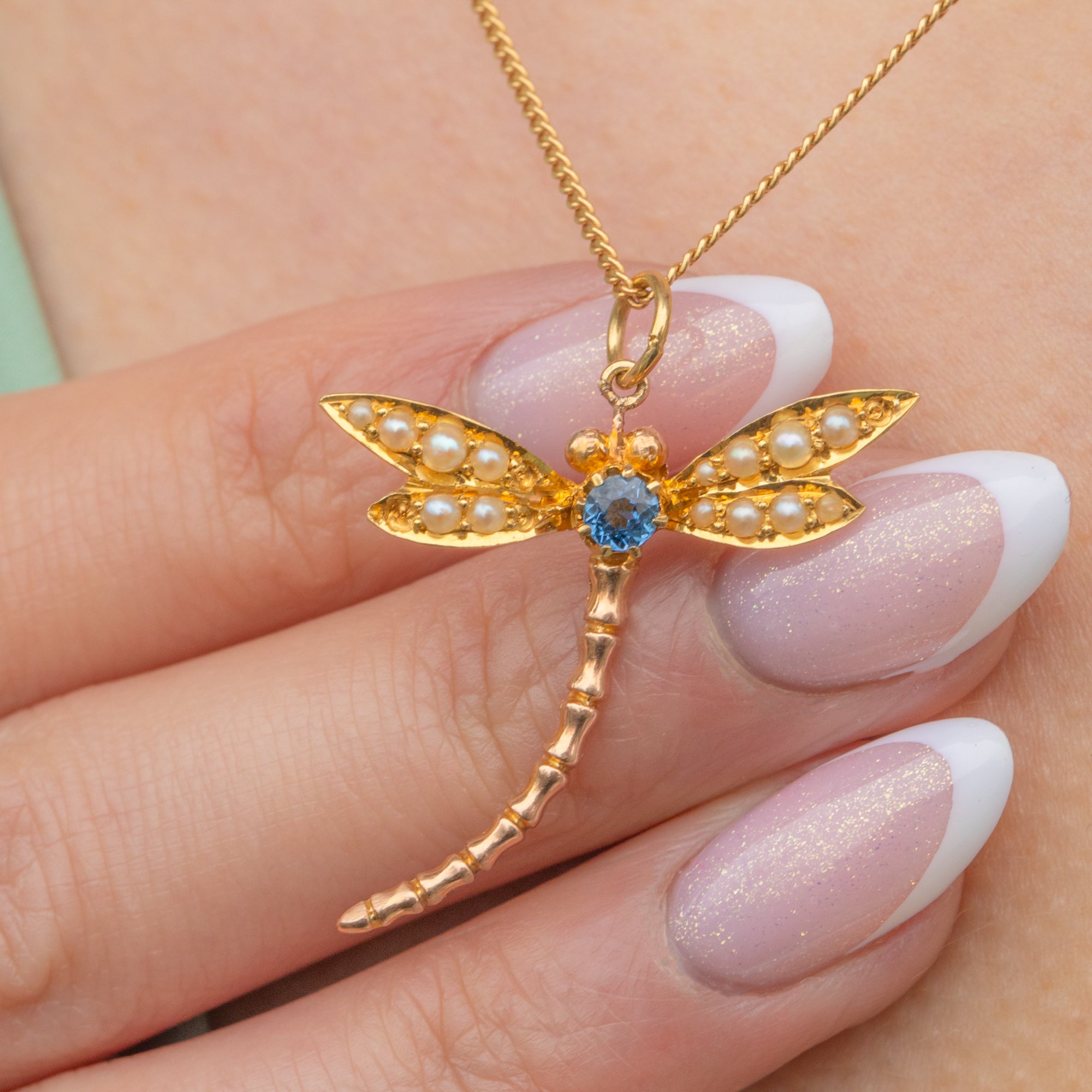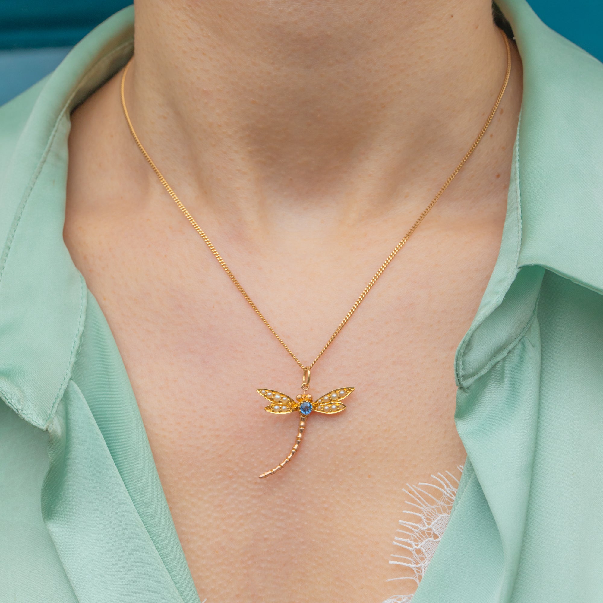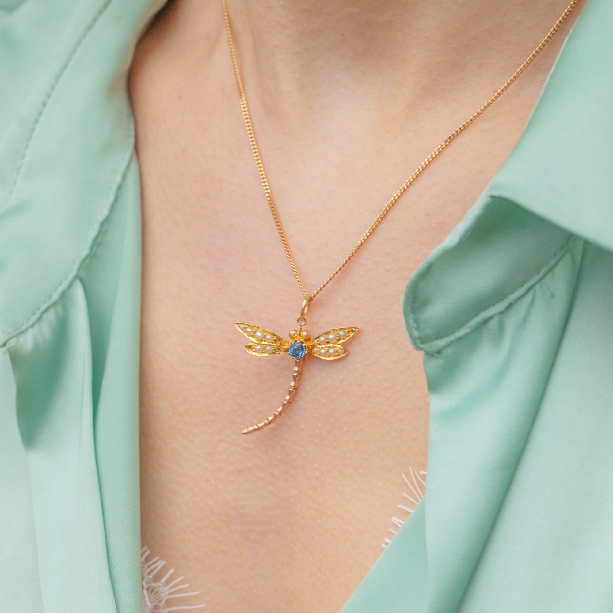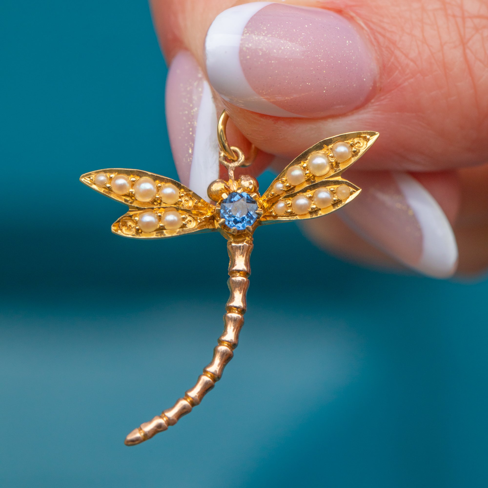 Packed with antique charm, this Victorian 18ct Gold Sapphire Pearl dragonfly pendant is adorable!