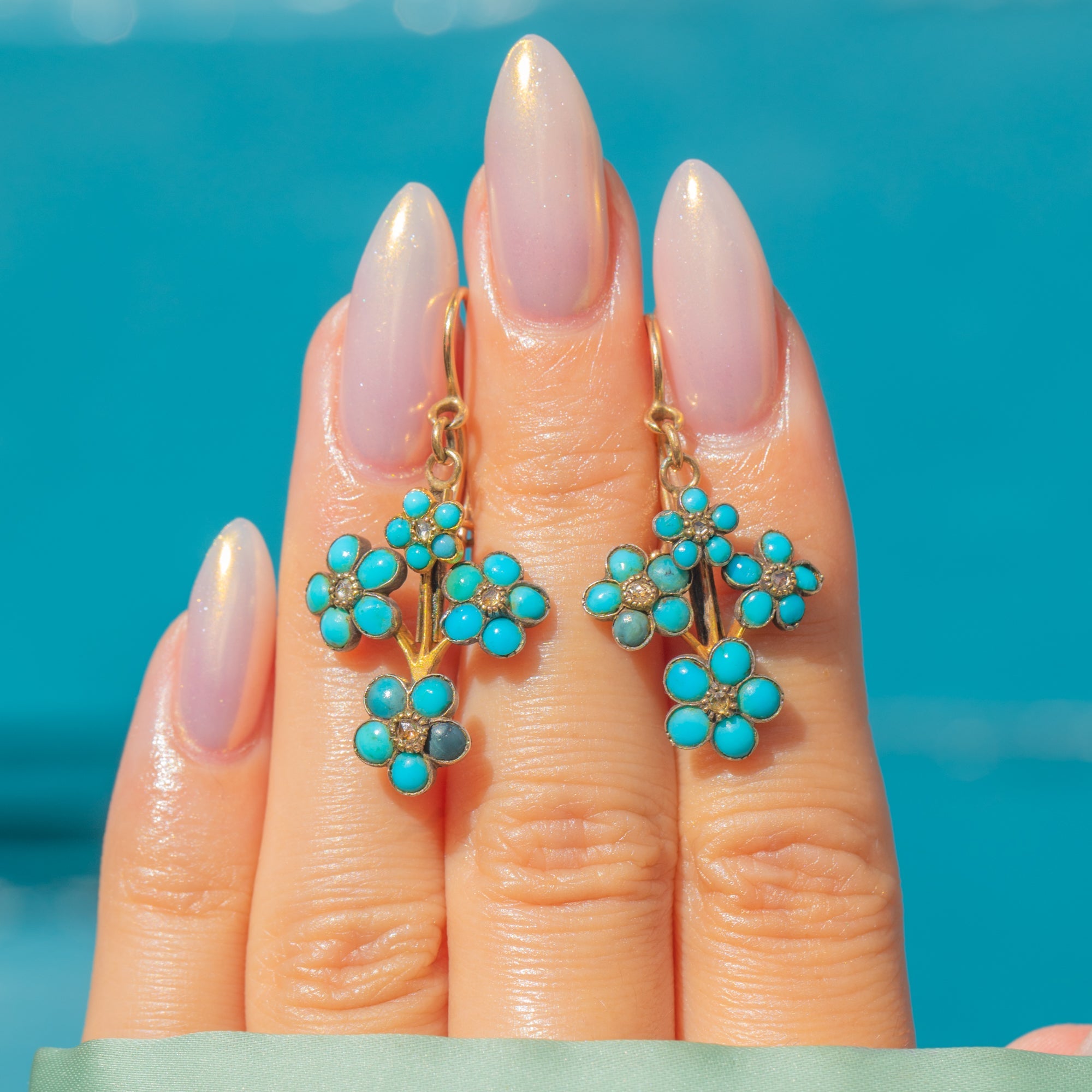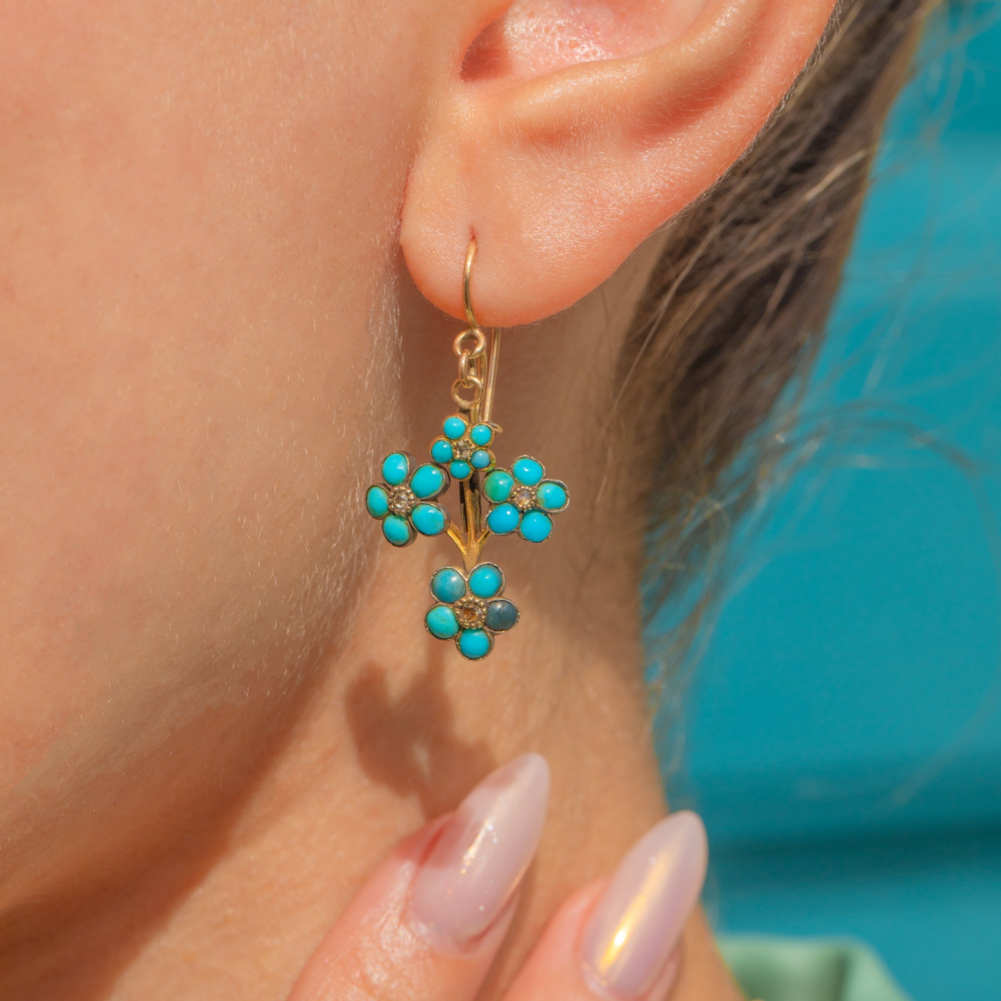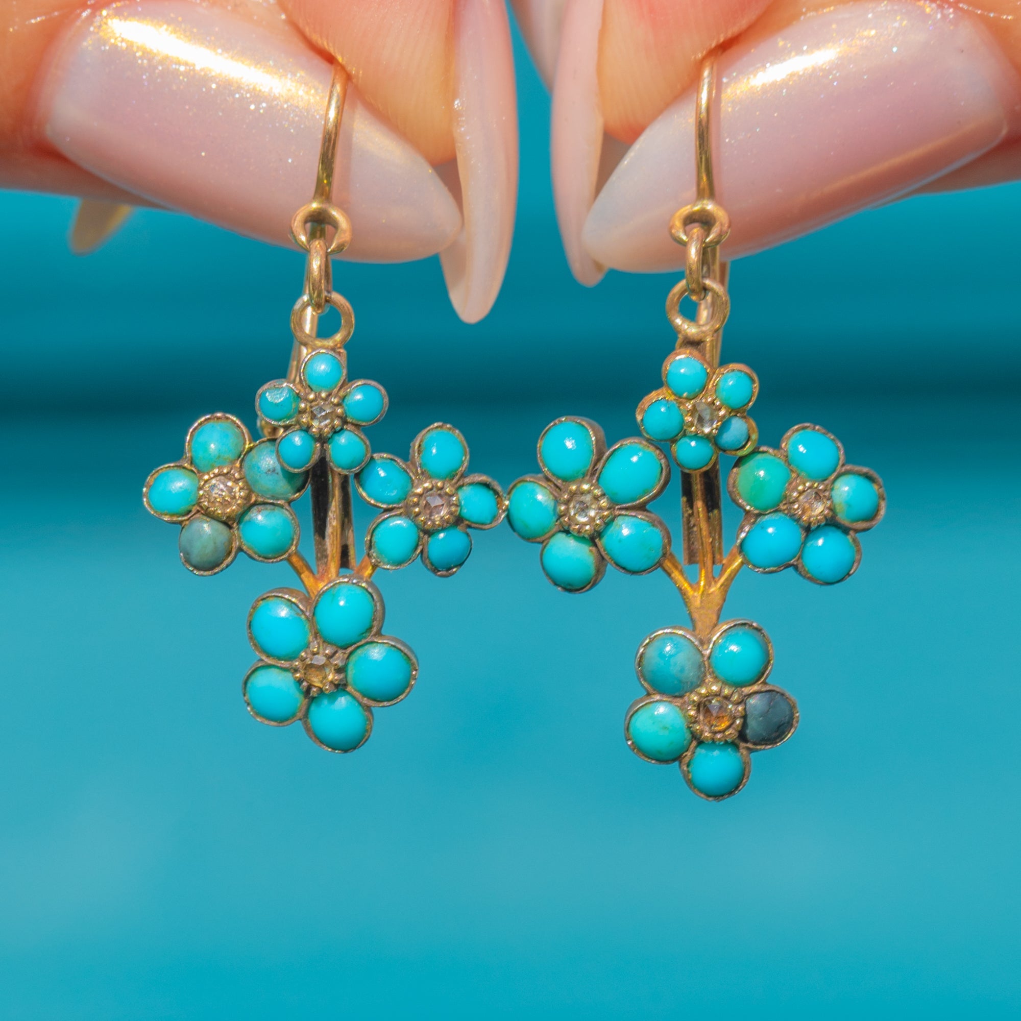 Victorian 18ct Gold Turquoise & Diamond Forget-Me-Not Earrings c.1880