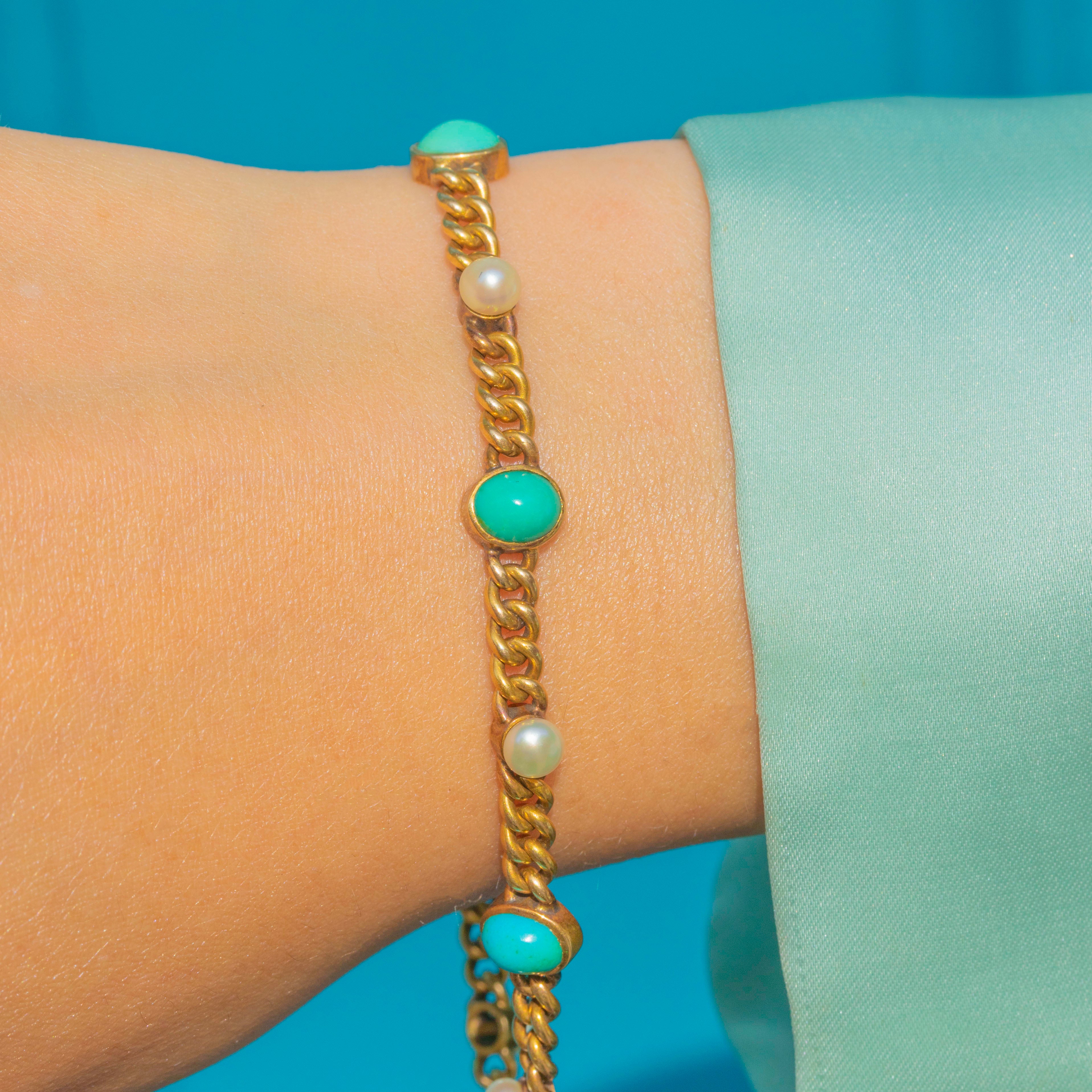 Victorian 18ct Gold Turquoise Natural Pearl Curb Bracelet