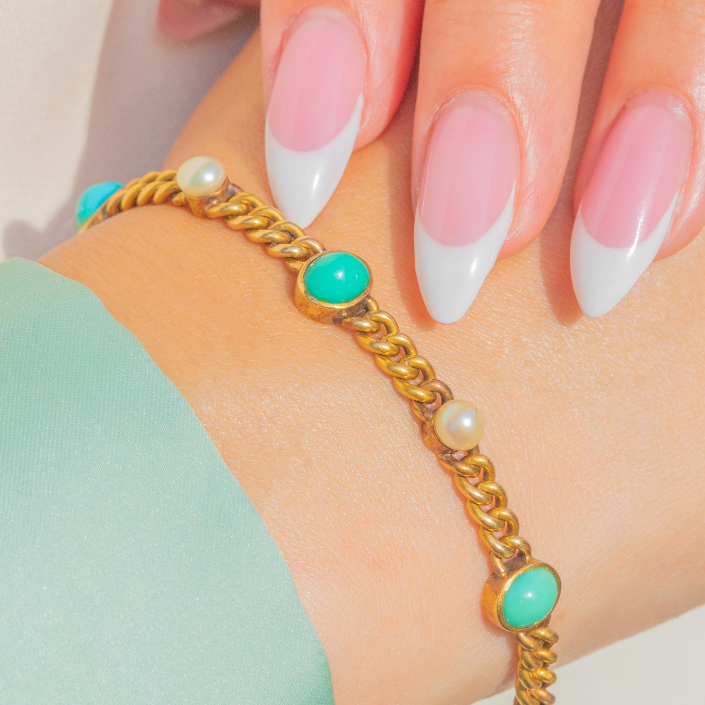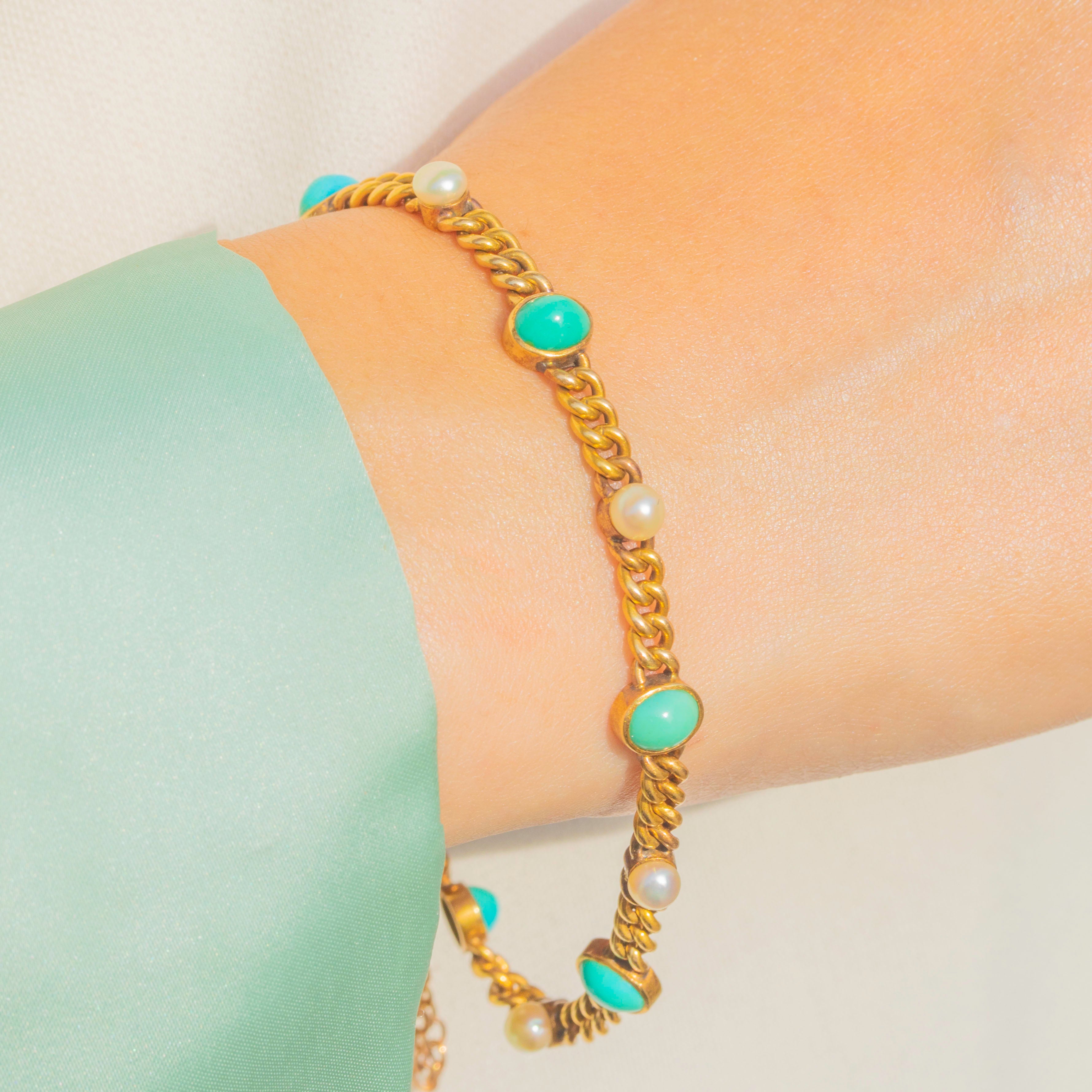 This elegant Victorian bracelet is crafted in luxurious 18ct Gold and set with alternating Pearls and Turquoise, creating a timeless and harmonious design. Twelve gemstones in total add colour and lustre, with the vibrant blue of the Turquoise perfectly complementing the soft, creamy glow of the Pearls.