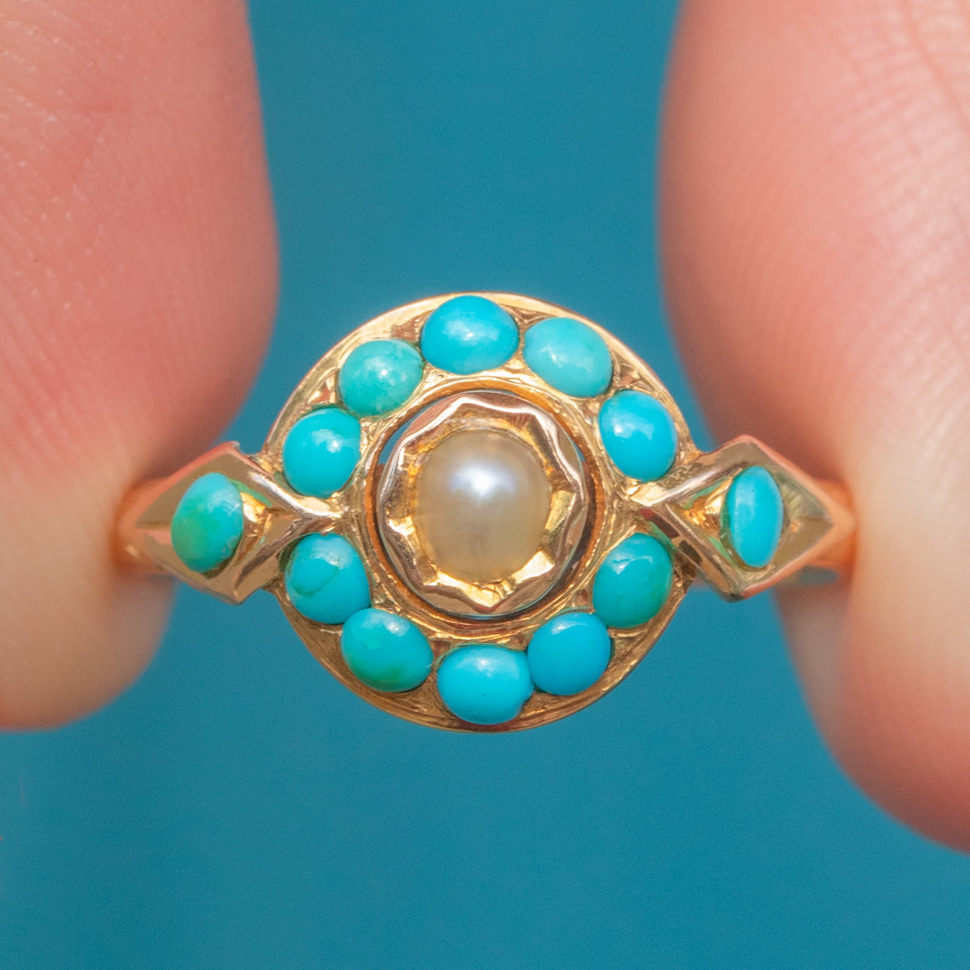 Victorian 18ct Gold Turquoise Pearl Cluster Ring