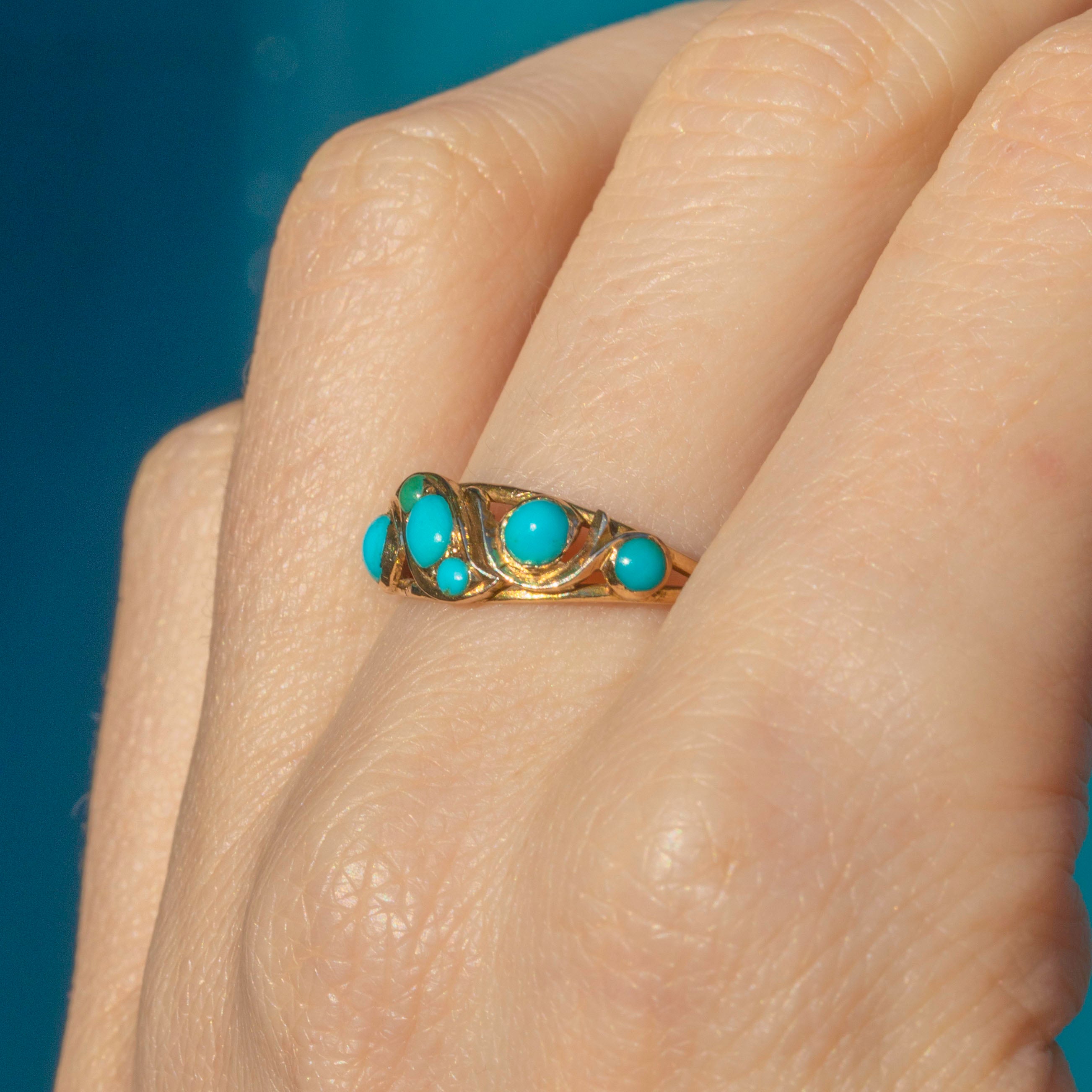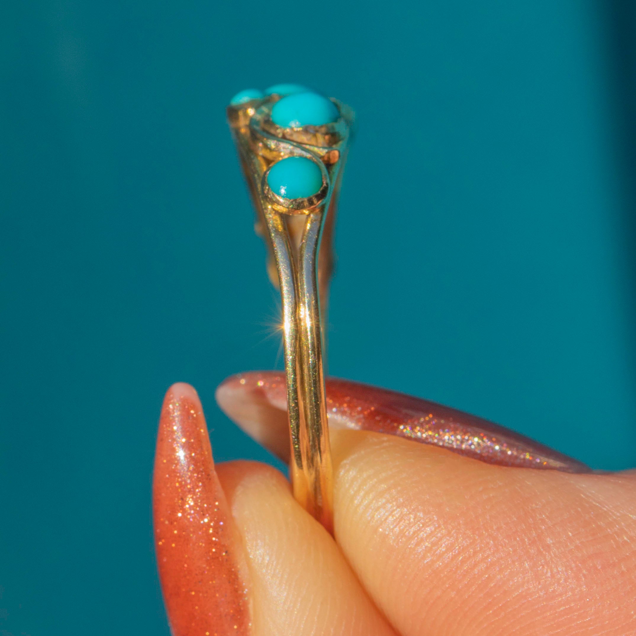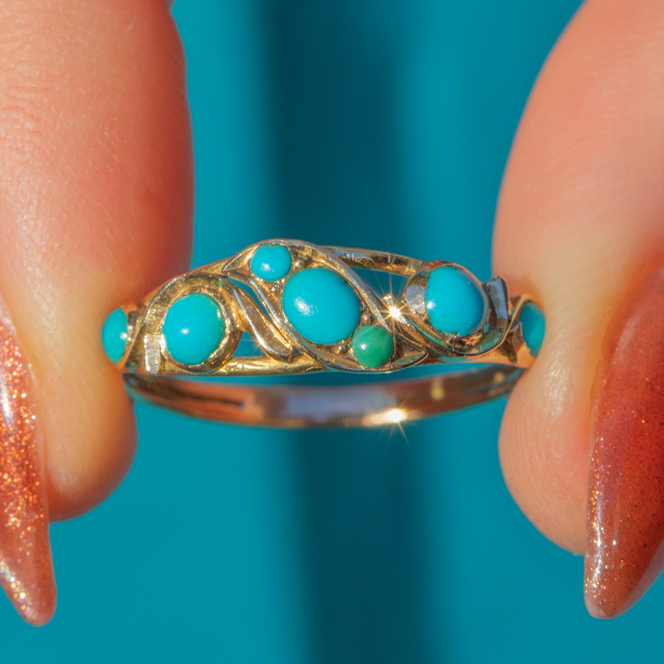 This Georgian 18ct Gold Turquoise ring is a fabulous antique find. Embellished with a gorgeous splattering of vibrant Turquoise stones, this Gold ring is the splash of colour your ring stack is calling out for!