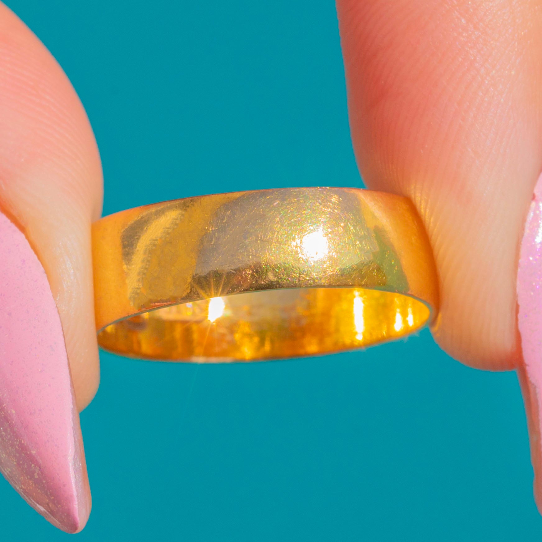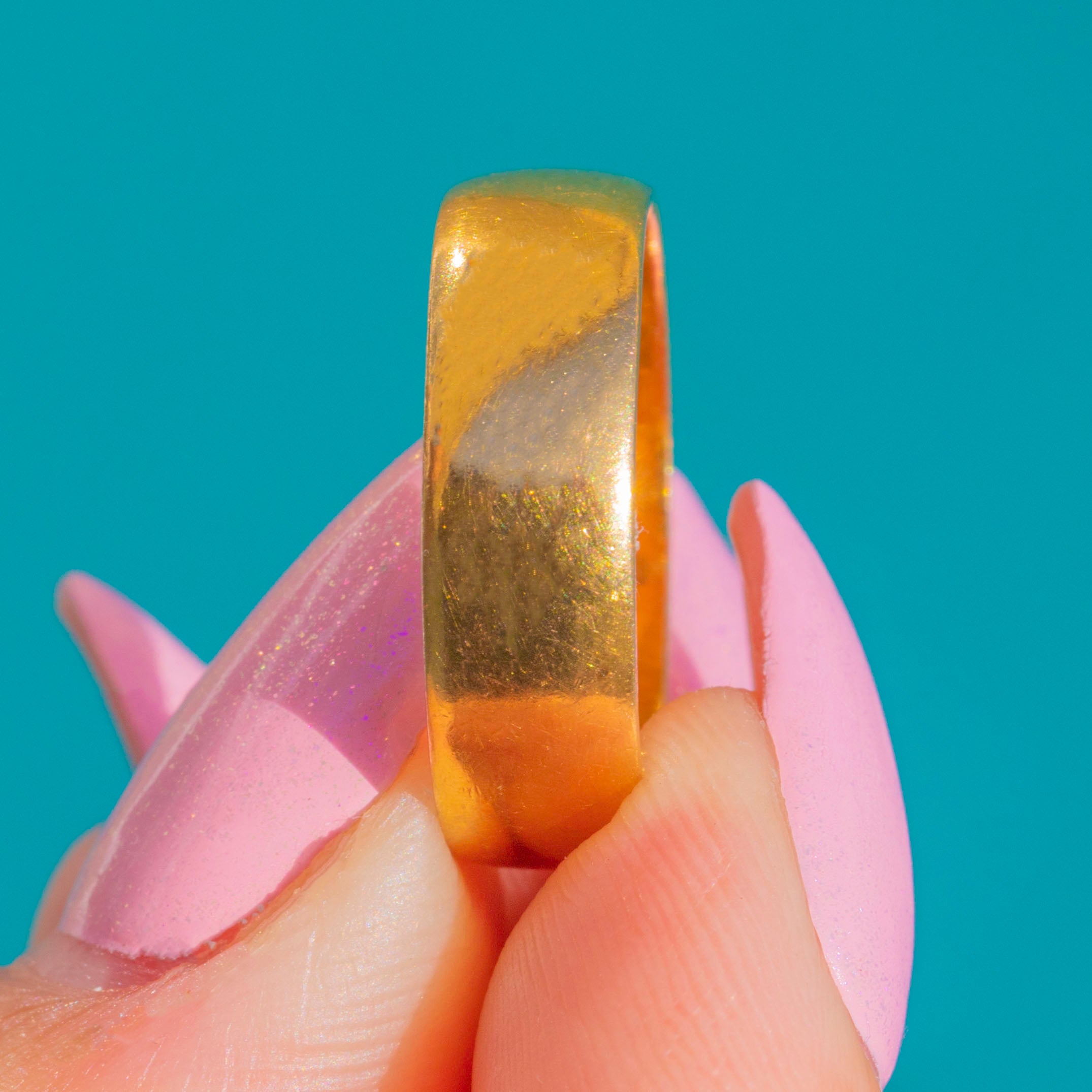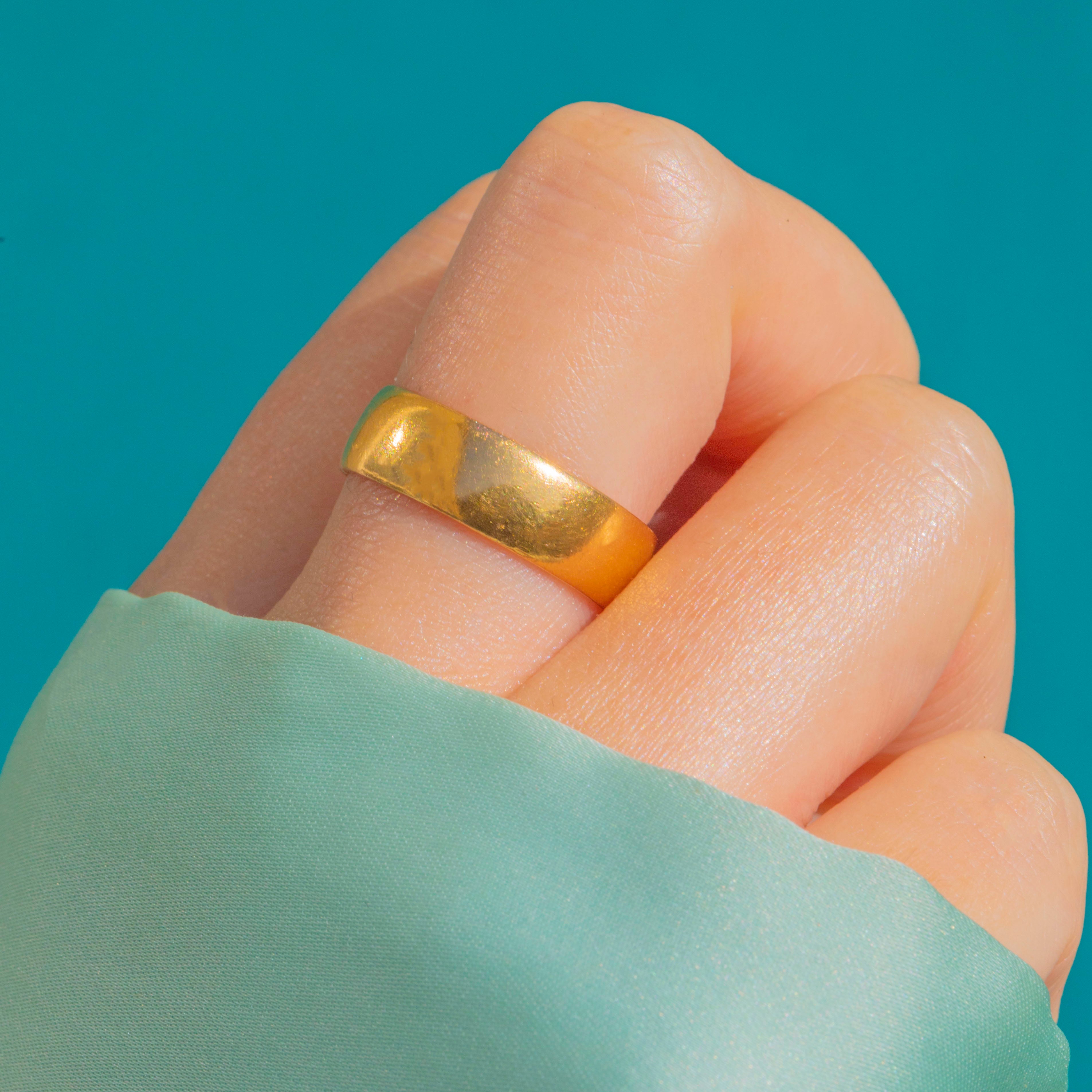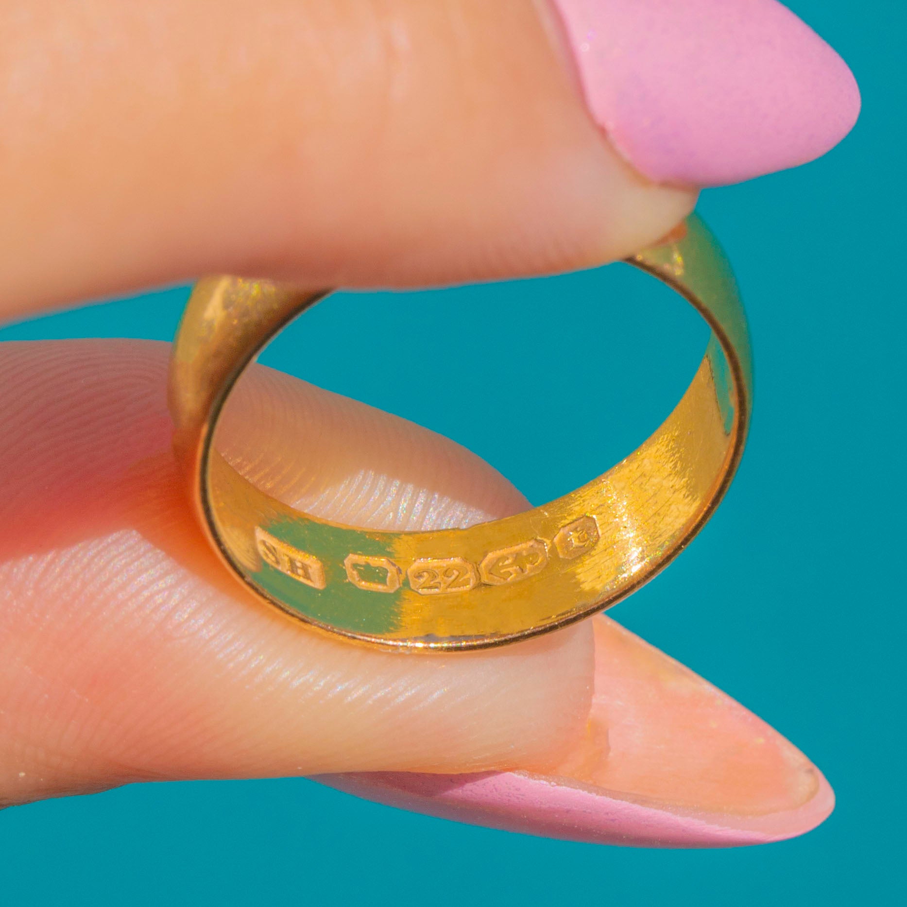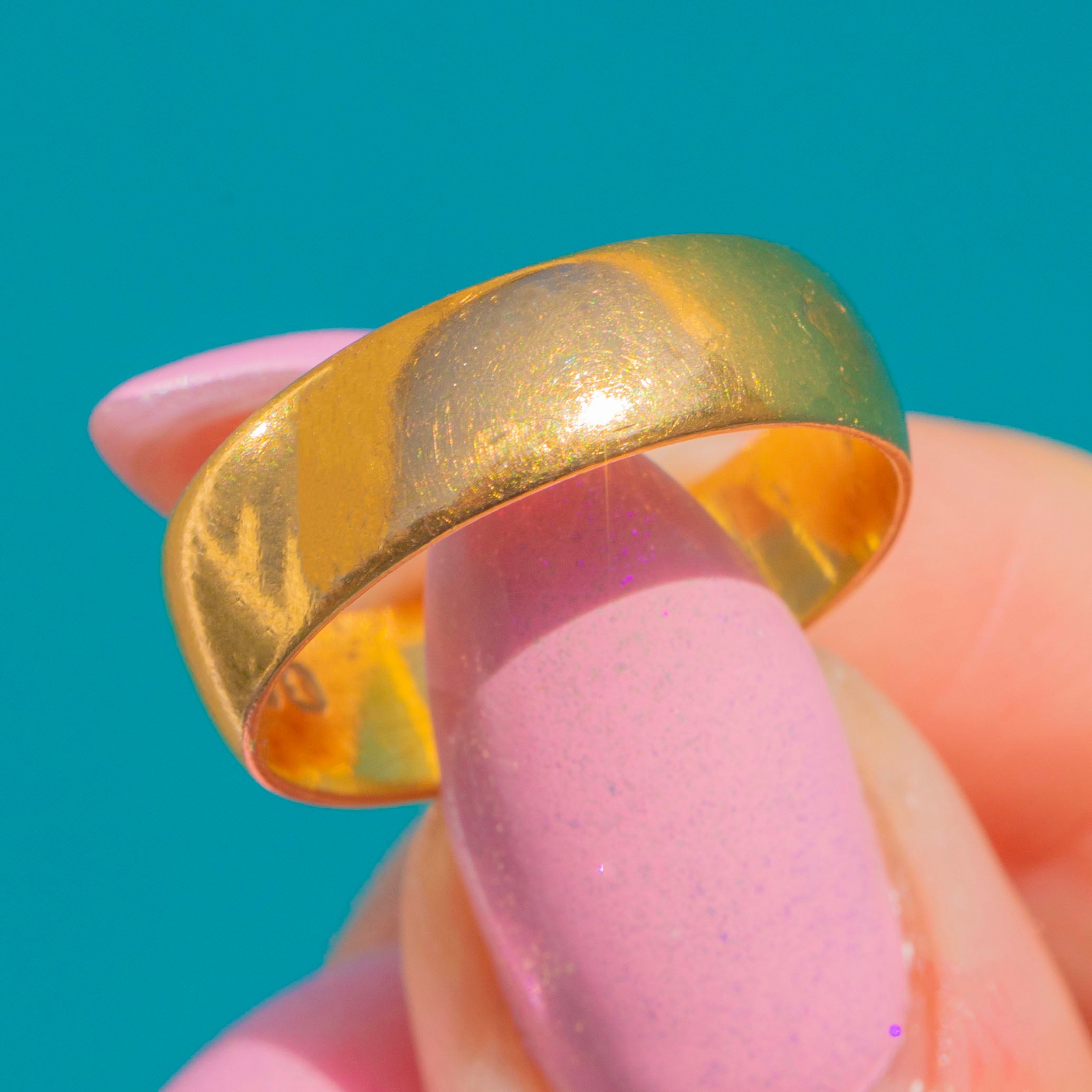 A rich late Victorian treasure, this 22ct Gold wedding band is dated to 1893. Its voluptuous domed profile and 5.5mm width create a bold yet beautifully minimalist statement, the high-carat Gold radiating that unmistakable, buttery glow. Perfect worn solo as a classic wedding band or stacked for contemporary elegance.