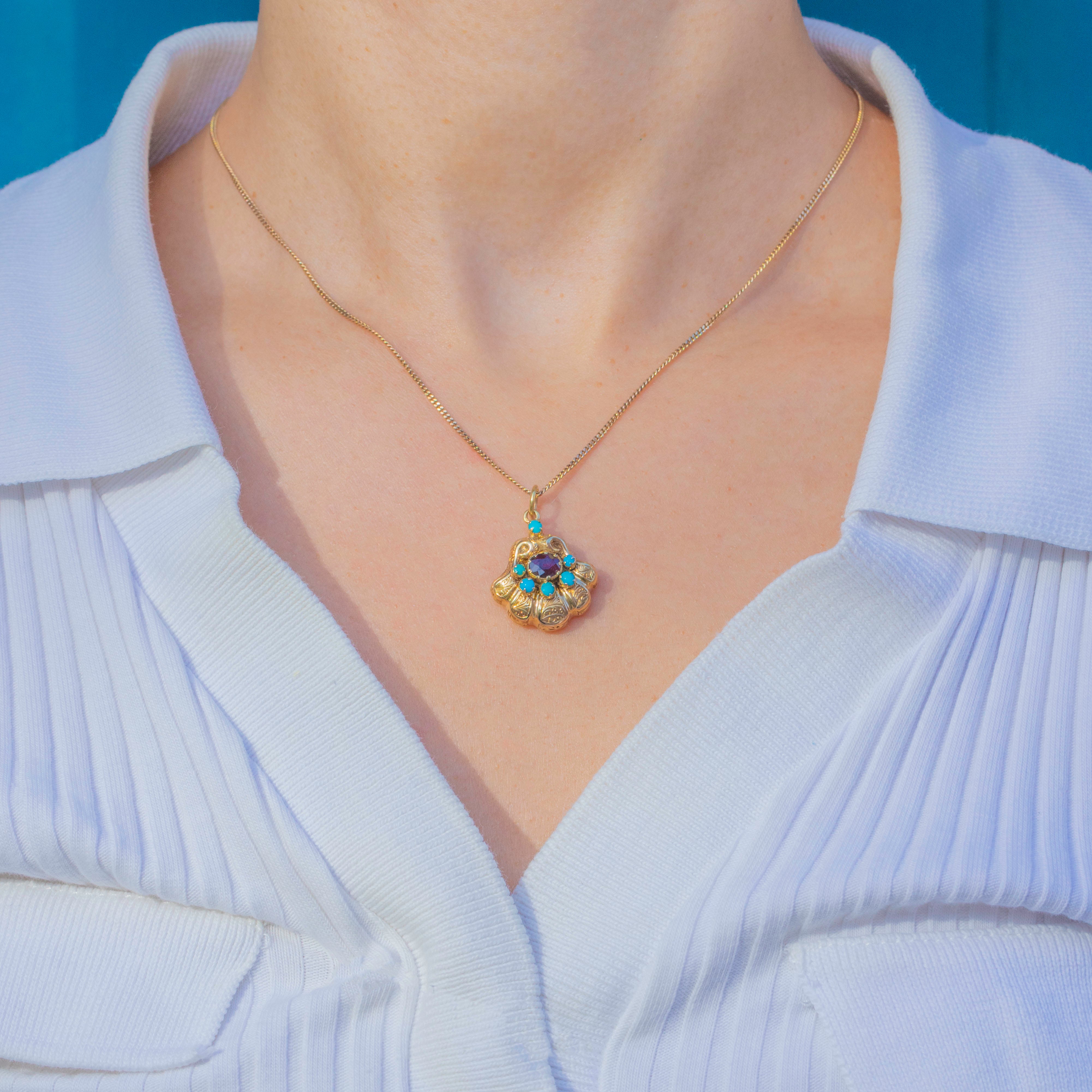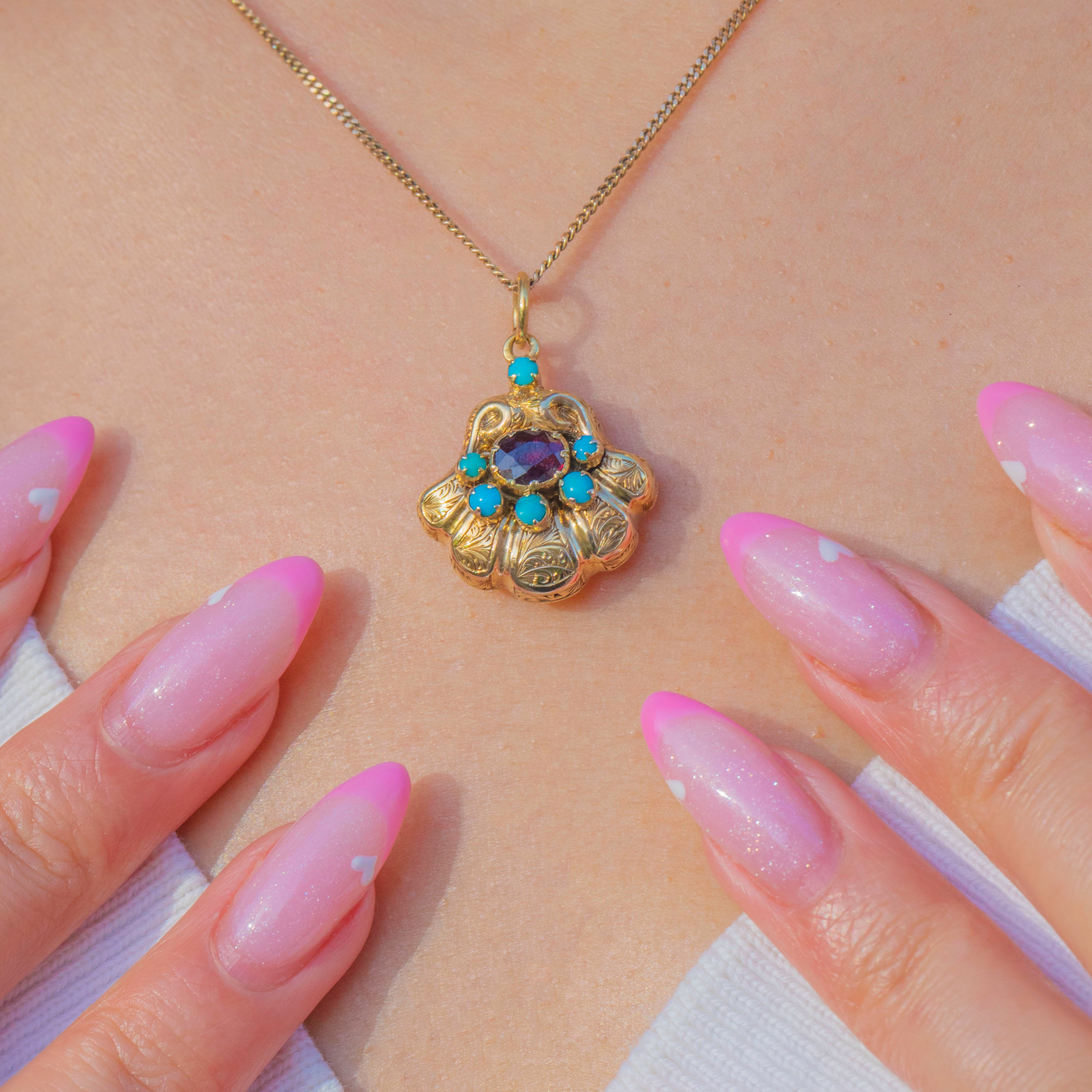This exquisite Victorian pendant takes the form of a finely engraved fan, crafted in approximately 7ct Gold and set with vivid Turquoise and deep red Garnets. Each gemstone adds a vibrant contrast to the softly patinated Gold, evoking the colourful, romantic spirit of the late 19th century.
