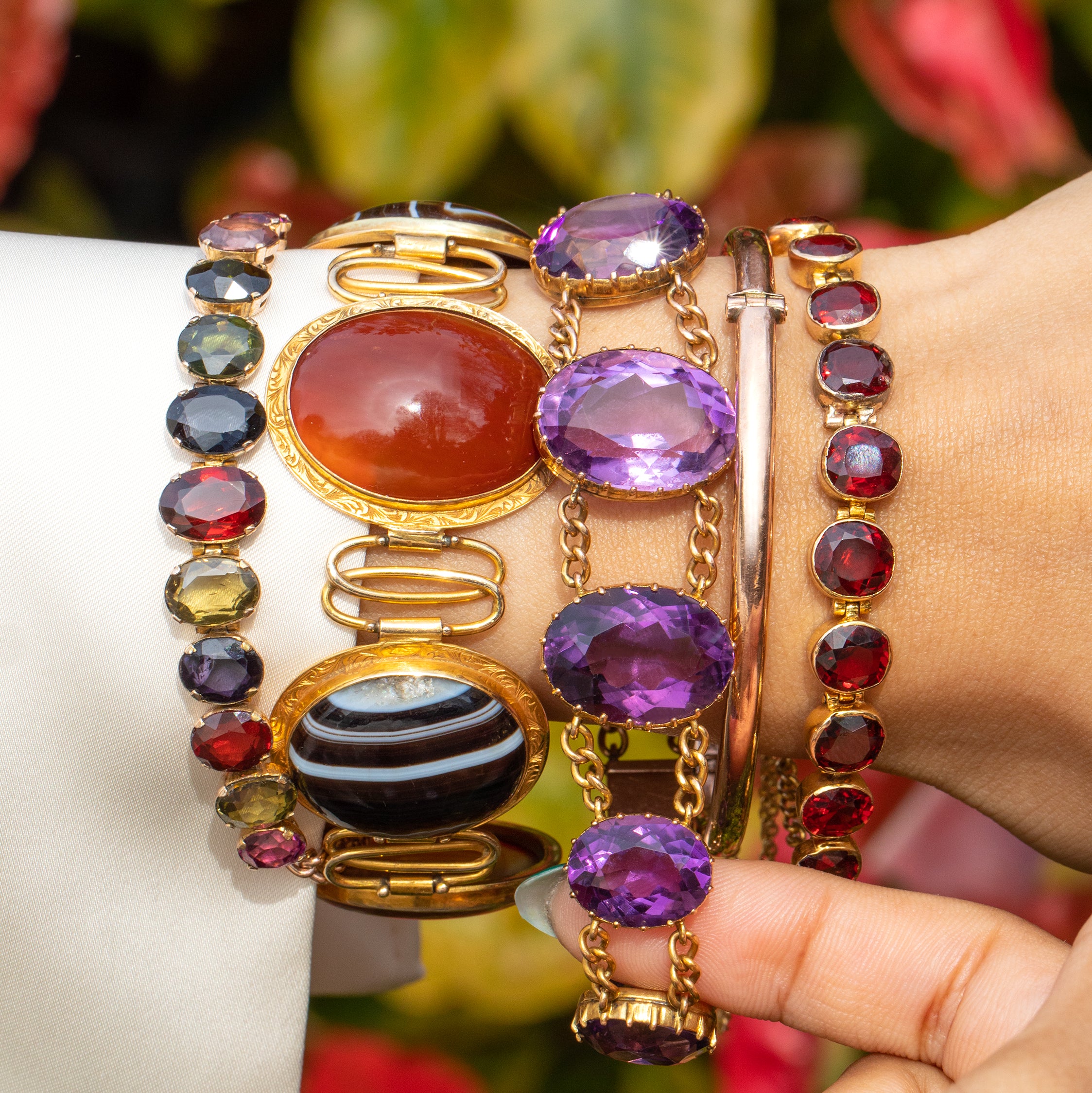 EXCELLENT. This Victorian 9ct Gold Amethyst bracelet is in excellent condition. Each Amethyst boasts a beautiful violet hue with a crisp set of facets that are free from chips or abrasions. The 9ct Gold is buttery throughout and hugs each Amethyst securely. Complete with robust curb links and a secure clasp, you can wear this phenomenal antique Amethyst bracelet confidently!
