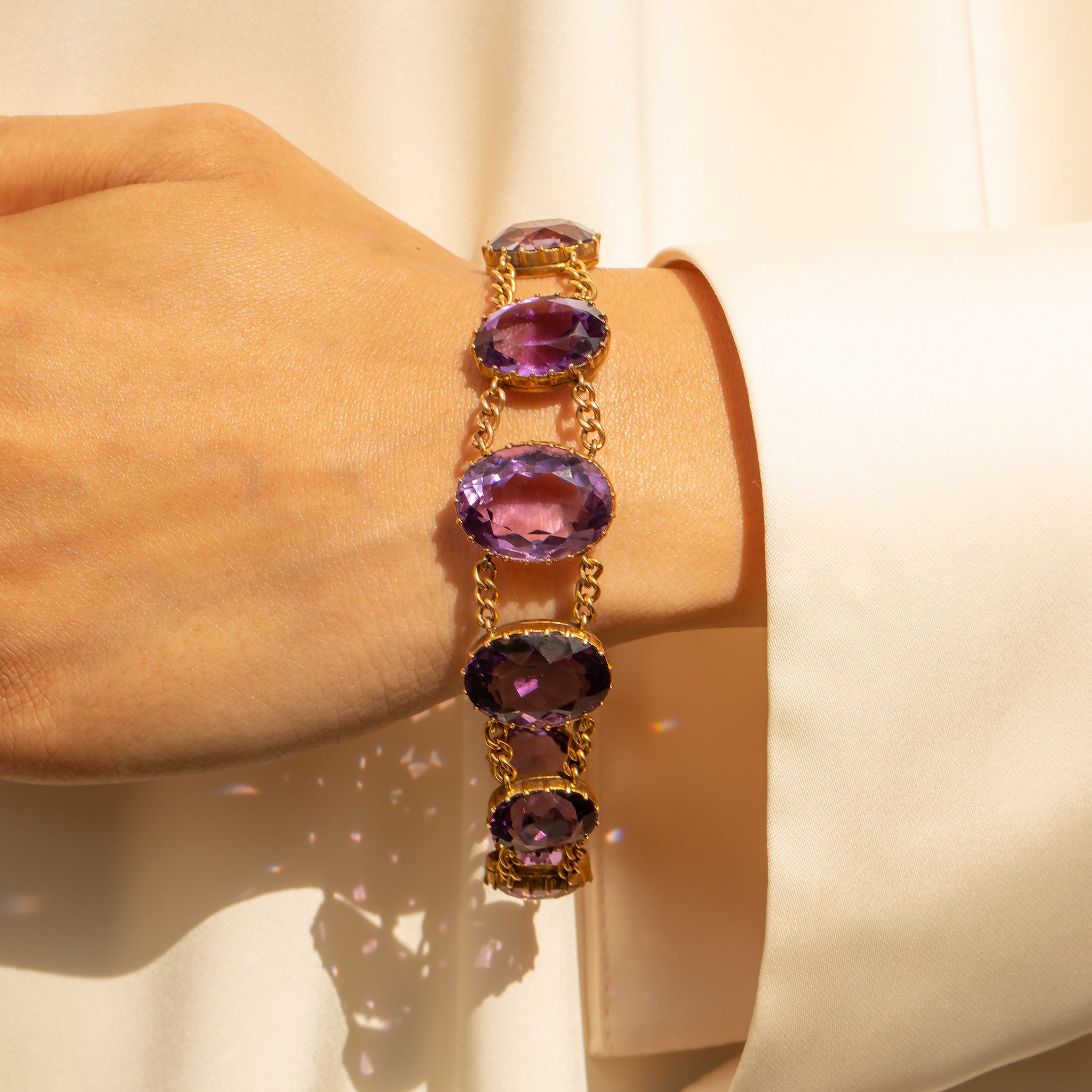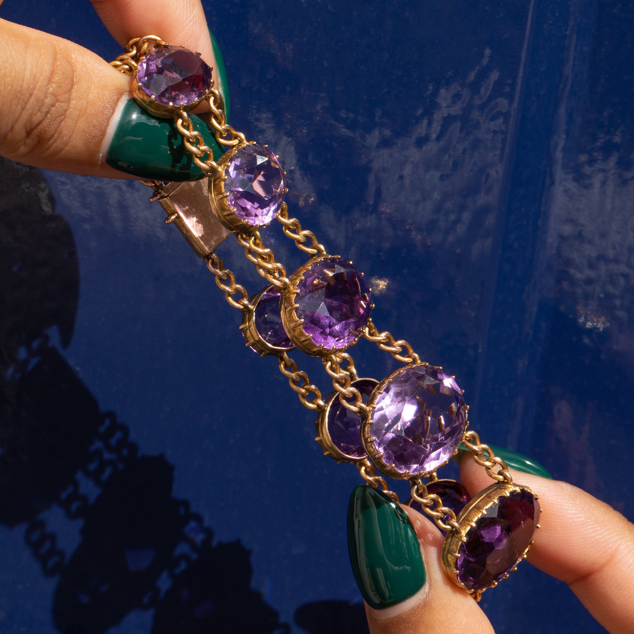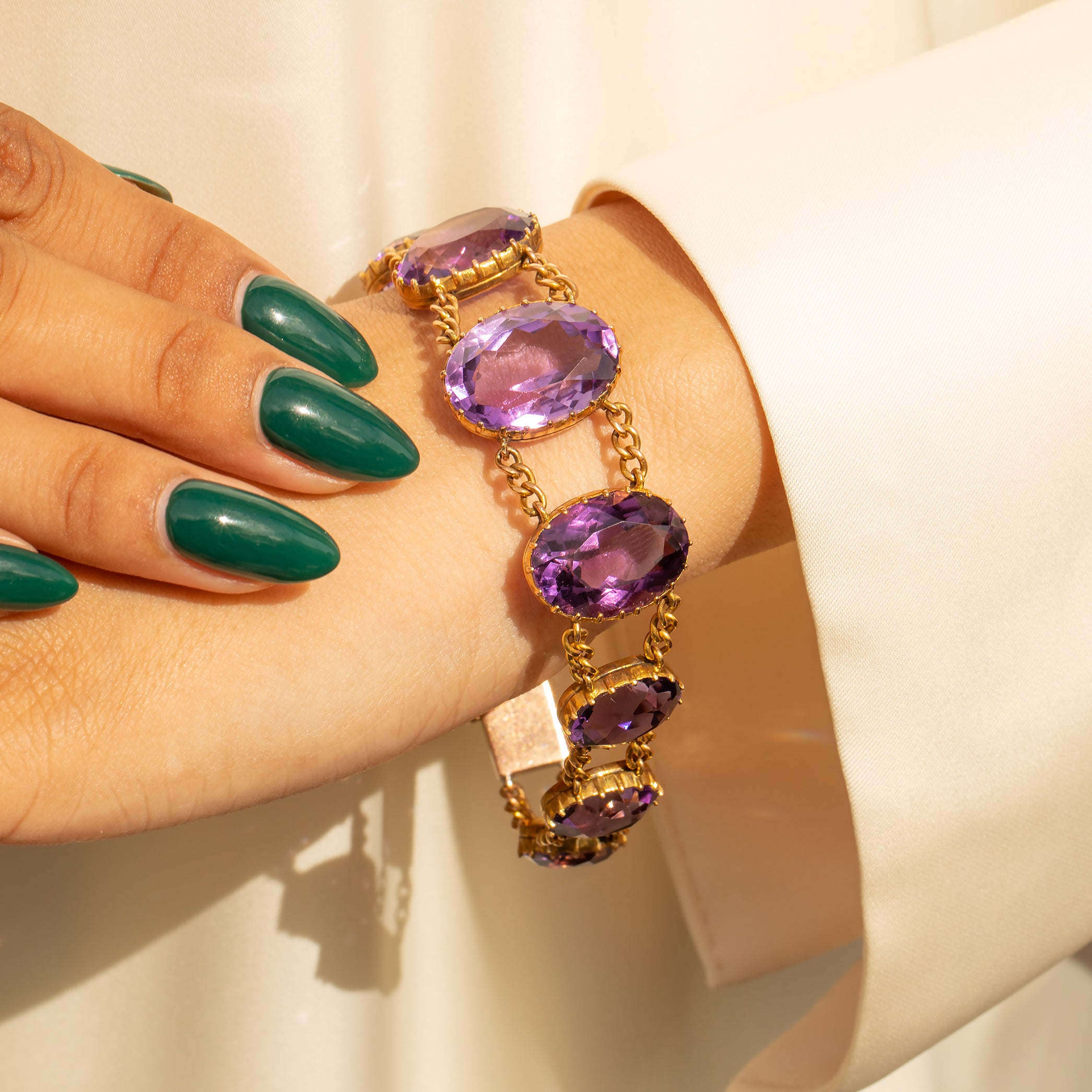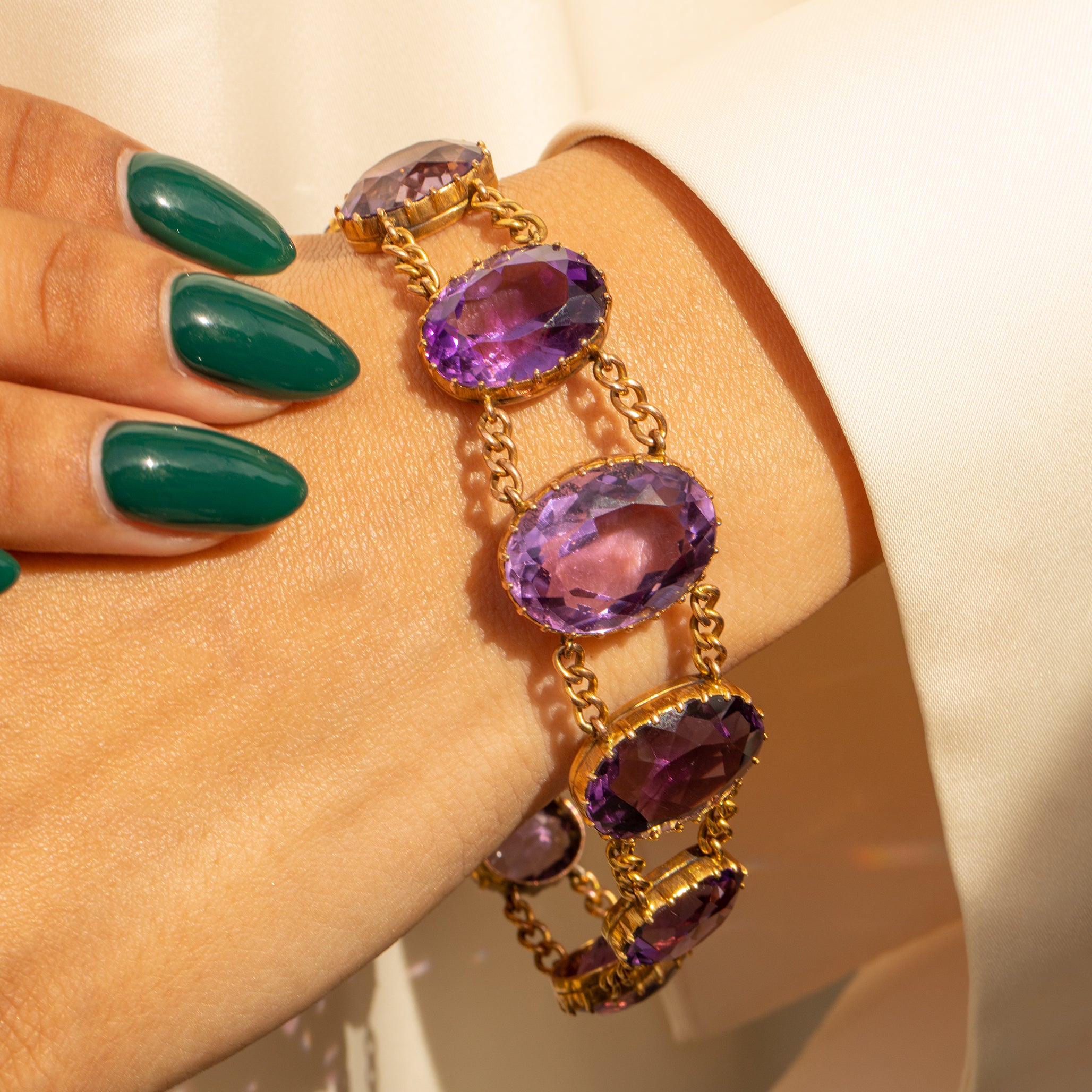 Channel your inner princess with this Victorian 9ct Gold Amethyst bracelet! Boasting 9 royal purple Amethysts, with a whopping 47.24ct spread, this antique bracelet is nothing short of splendorous as she hugs your wrist.