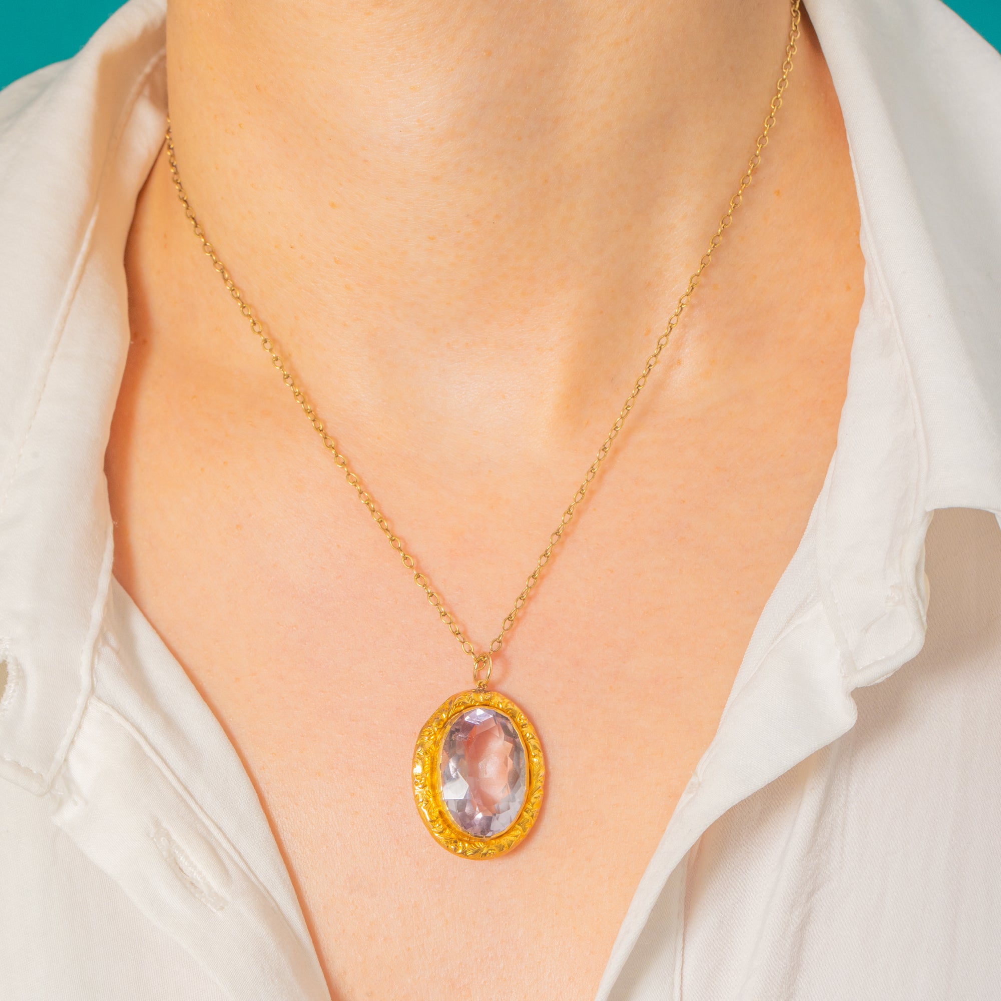 A romantic early Victorian pendant ablaze with soft lilac tones, this statement Amethyst is cradled in rich 9ct Gold. The large oval stone is bezel set and framed by a high-relief chased foliate border with delicate rosette accents, giving the piece wonderful texture and movement.
