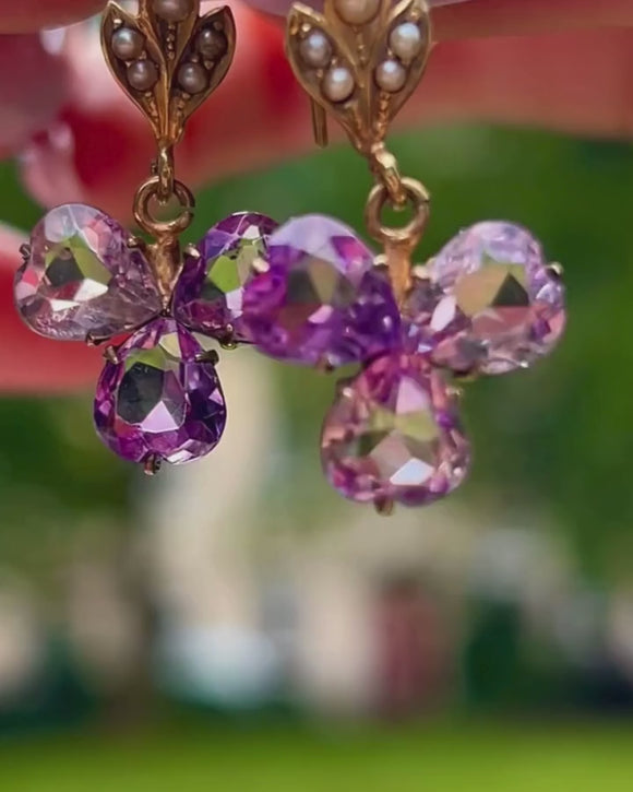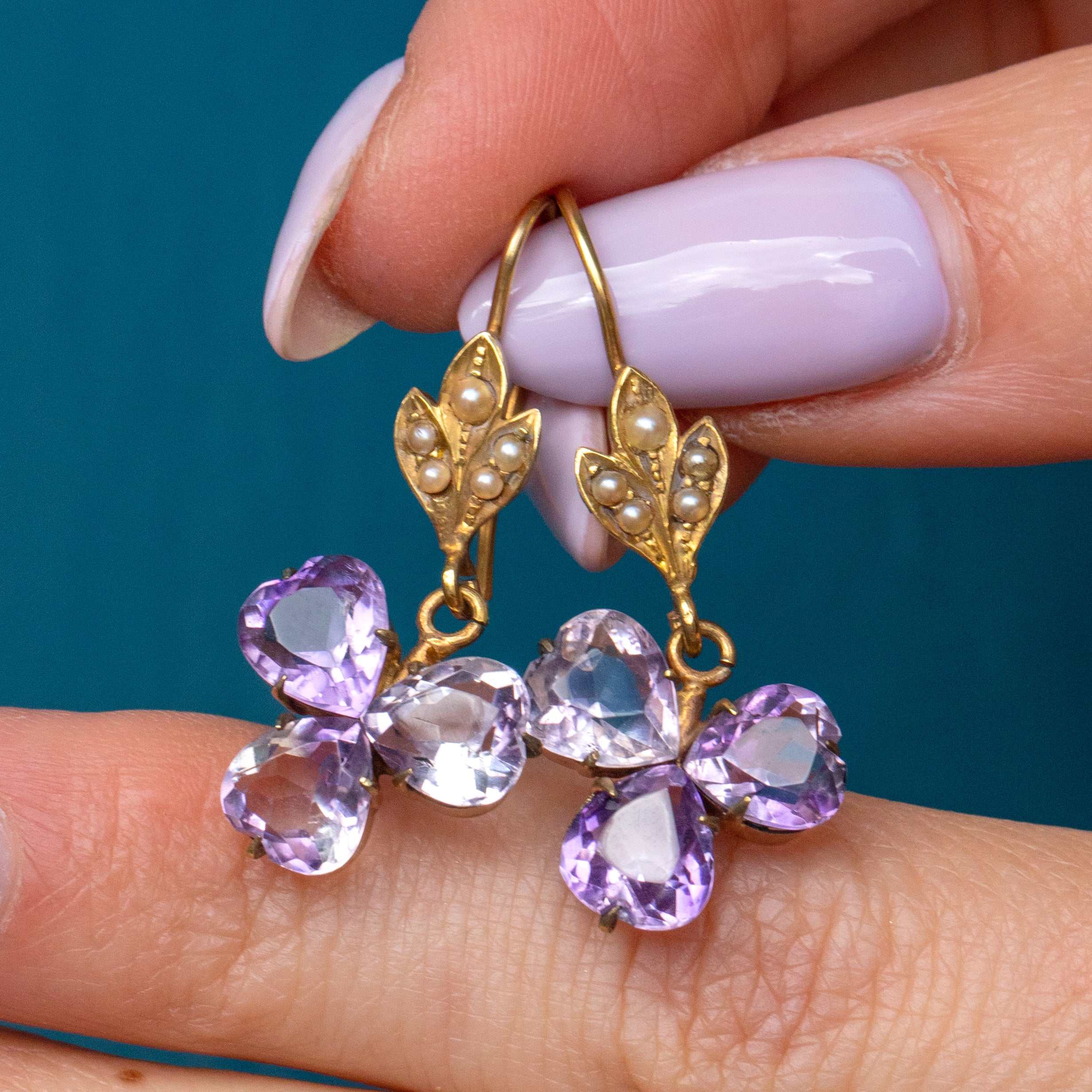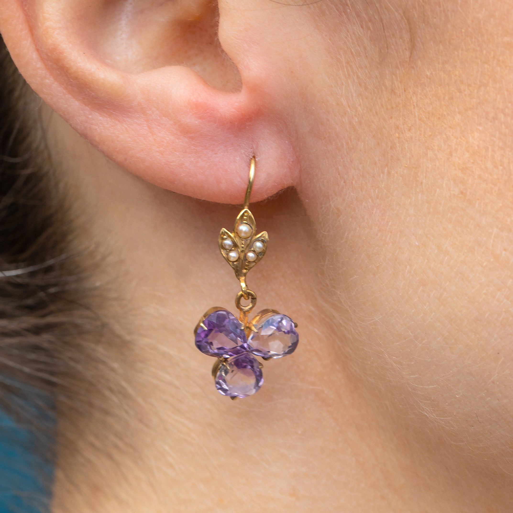 EXCELLENT. These Victorian 9ct Gold Amethyst pear earrings are beautiful. The 9ct Gold is bright and buttery and the Amethysts have been beautifully cut and set into the form of shamrocks. The Amethysts have a slight variation in hue, showcasing Mother Nature's work at her finest. The Pearls have a lovely silky sheen and are set securely. These are a pretty pair of Victorian earrings for your collection!