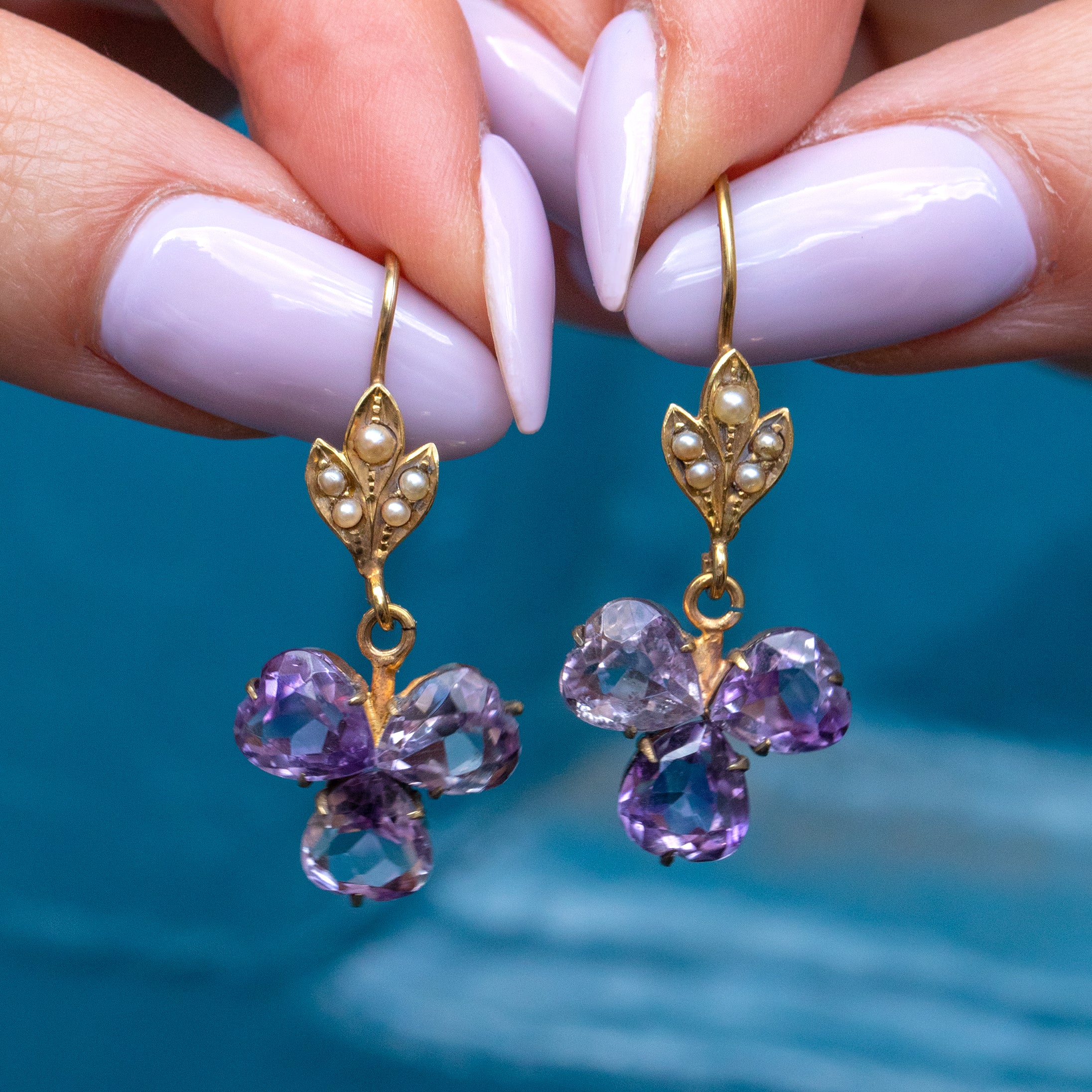 A gorgeous pair of Victorian 9ct Gold Amethyst shamrock pear earrings! These striking antique earrings are a testament to Victorian craftsmanship, boasting buttery Gold set with delectable gemstones.