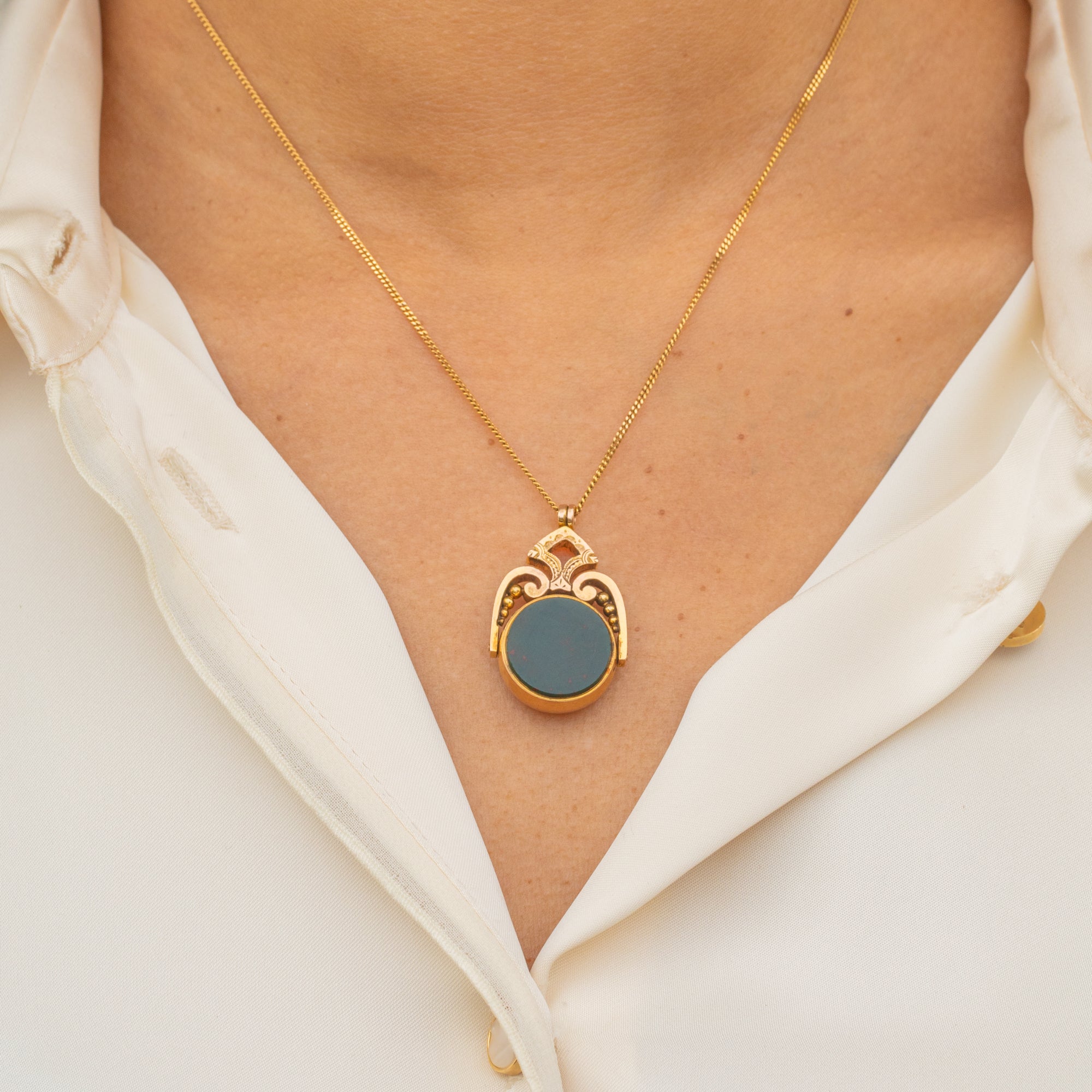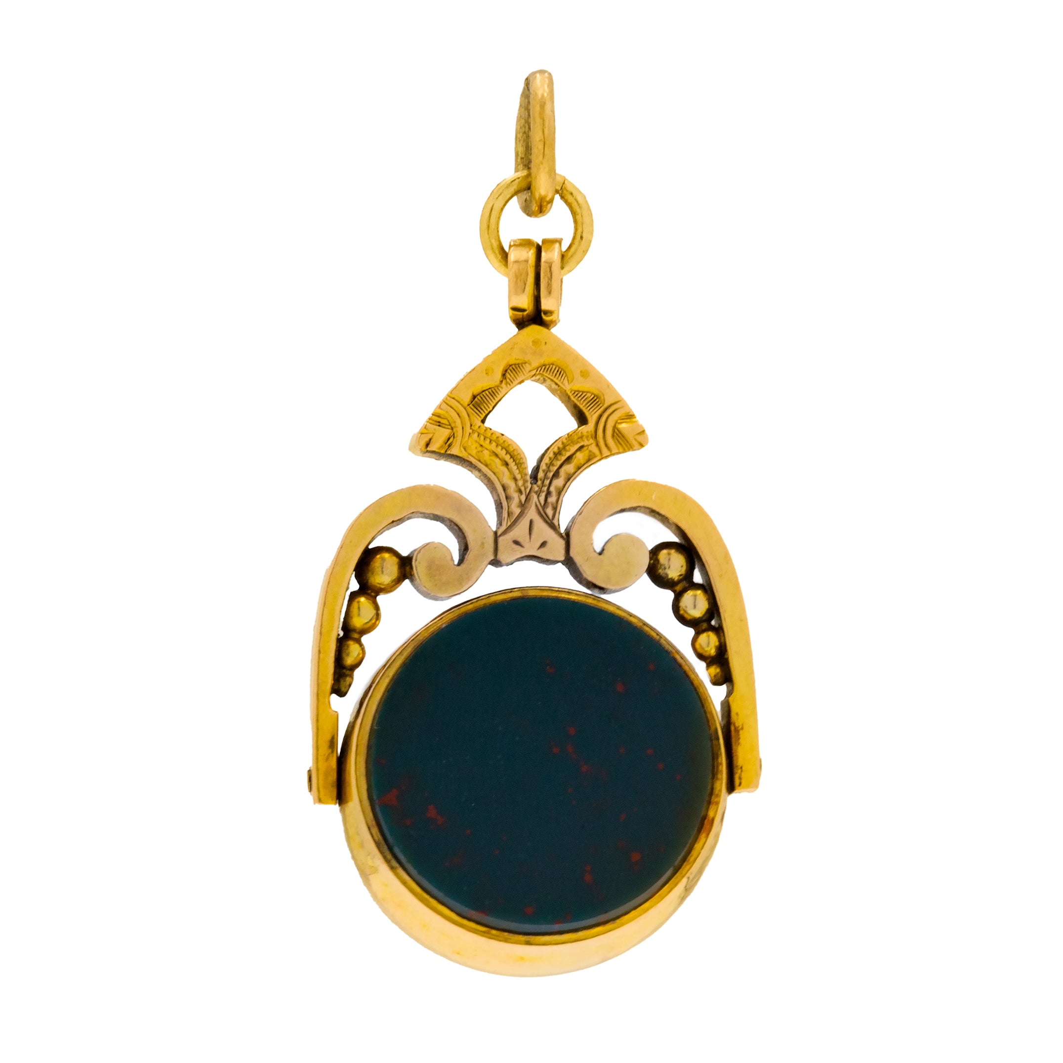 The ornate bale features dainty engravings and beaded details, making this Victorian swivel pendant rich with splendour. Spinning with ease, this antique Bloodstone pendant will provide you with endless enjoyment!