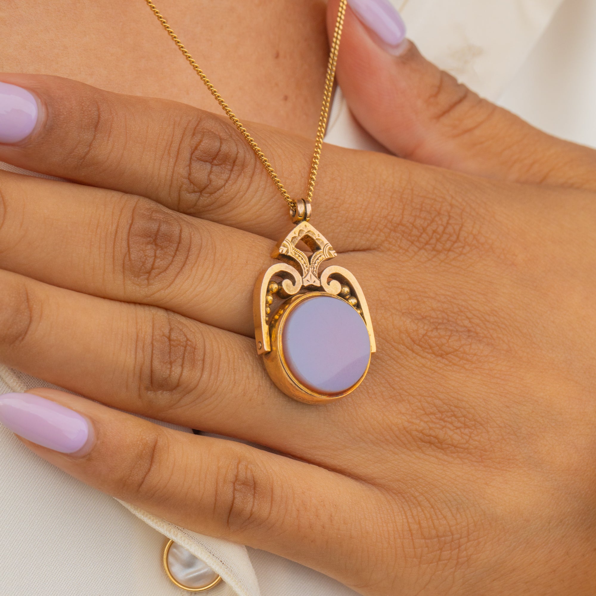 If you are someone who can never quite decide how to accessorise your outfits, this Victorian 9ct Gold Bloodstone Sardonyx swivel fob pendant was made for you! With a speckled Bloodstone on one side and creamy layered Sardonyx on the other, this antique Gold pendant gives you the option to interchange which side around you style her.